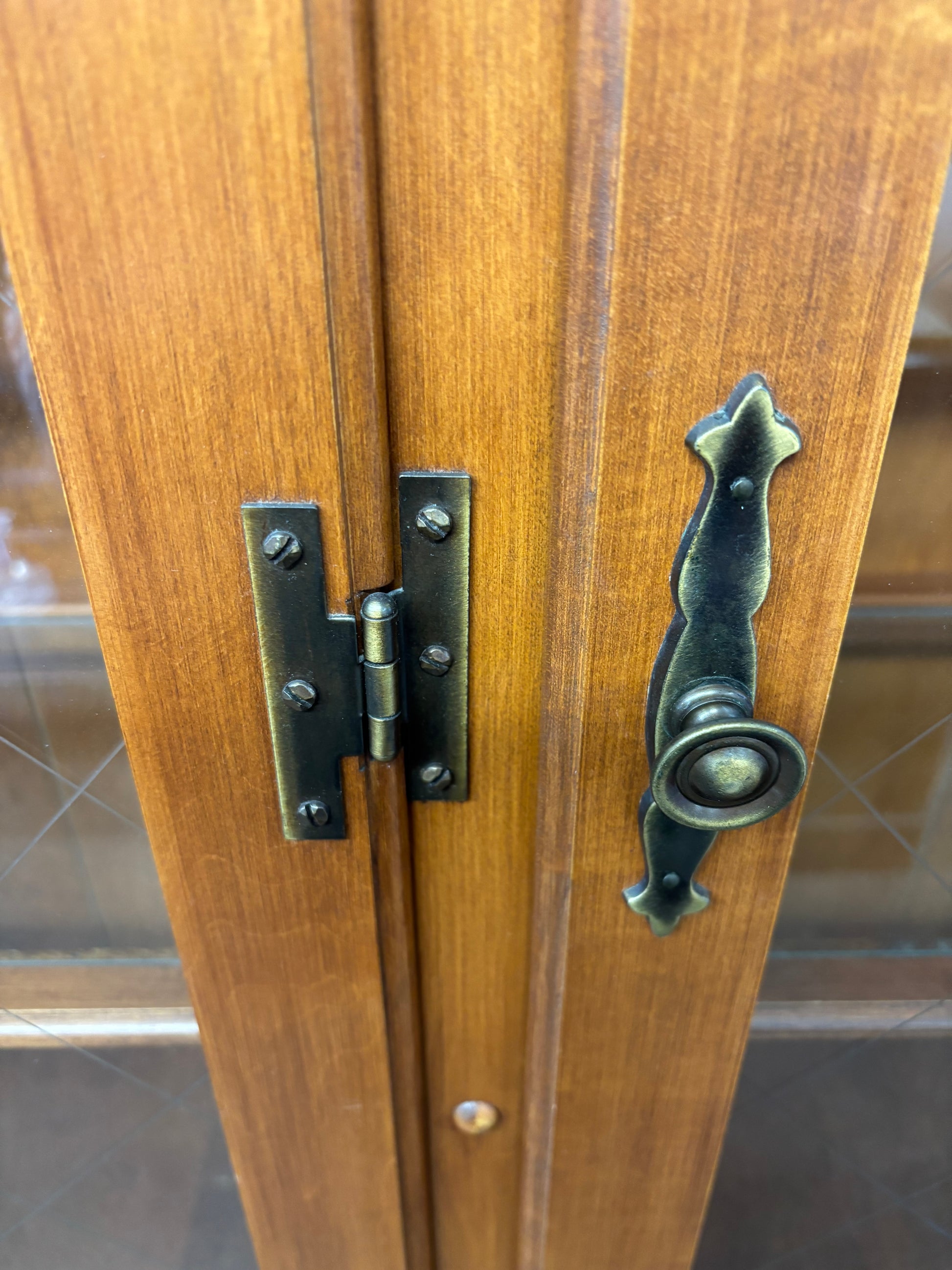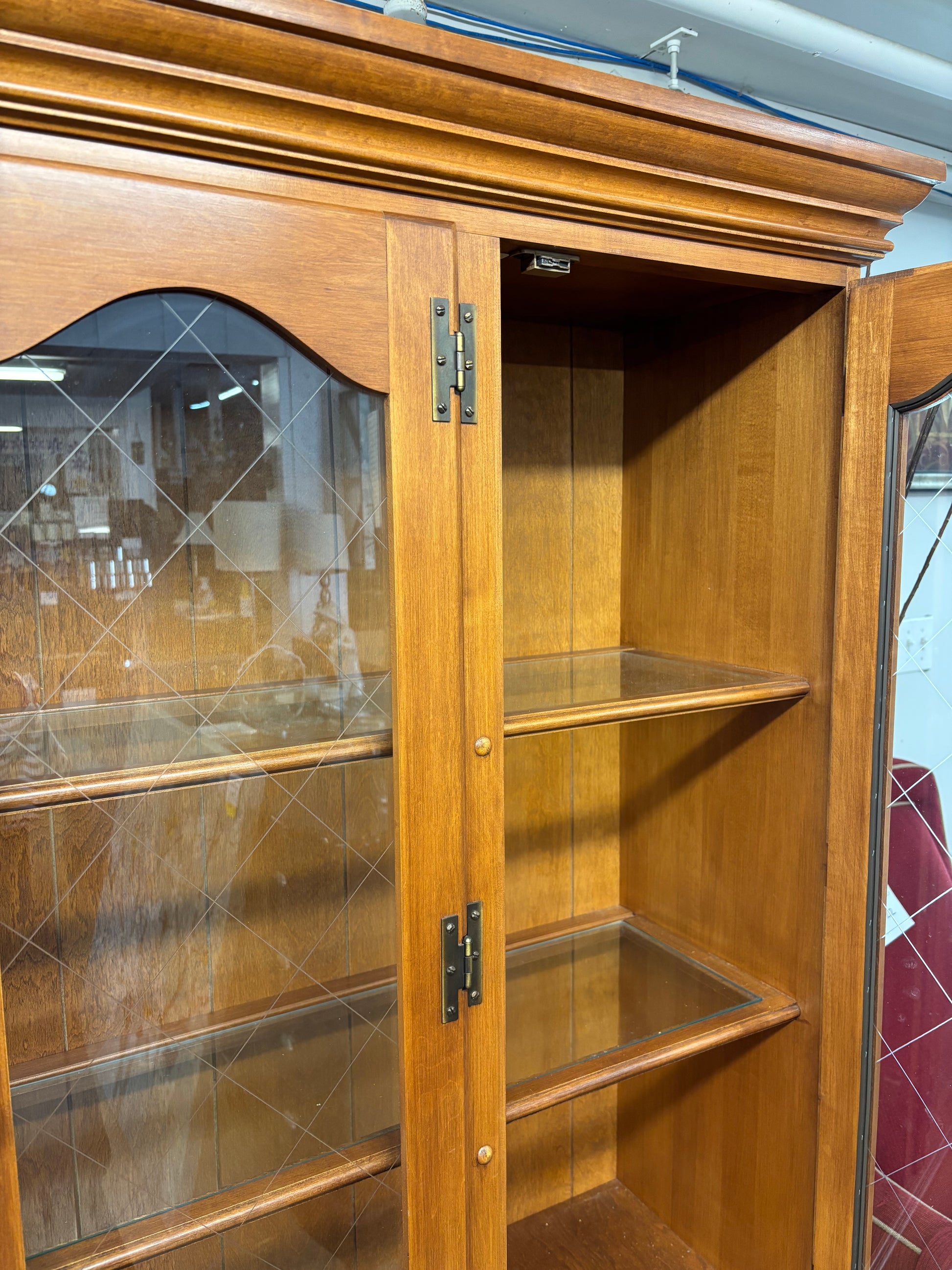 2 Piece Solid Wood China Cabinet. This stunning China cabinet is in two pieces. There are two glass shelves, four drawers, and two cabinets. It would look great in your dining room!