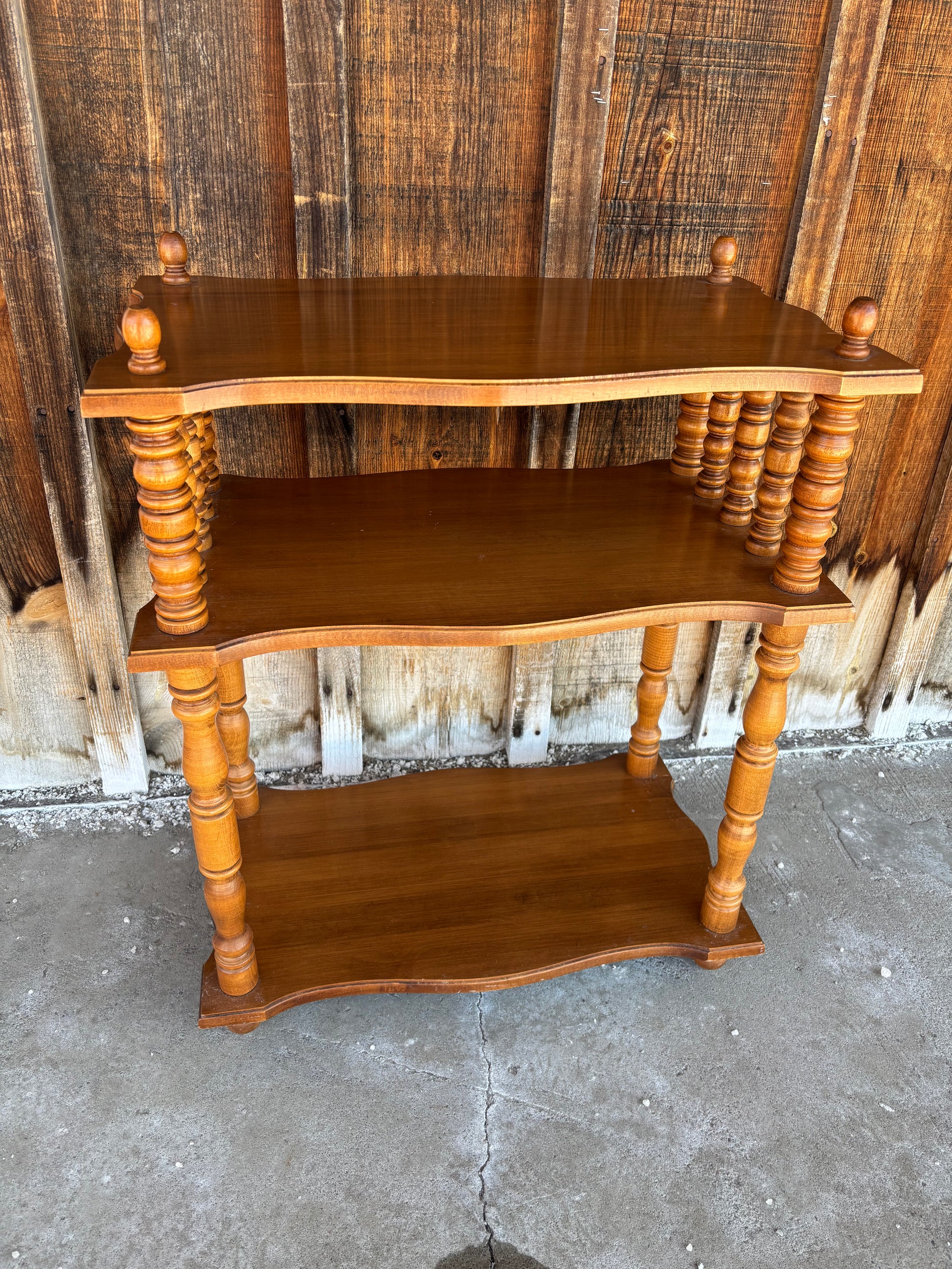 3 Tier End Table. This beautiful wooden end table has three shelves to display decor! It could be used in your entry way or living room. One of the decorative pieces on the top is loose, as seen in the last image.