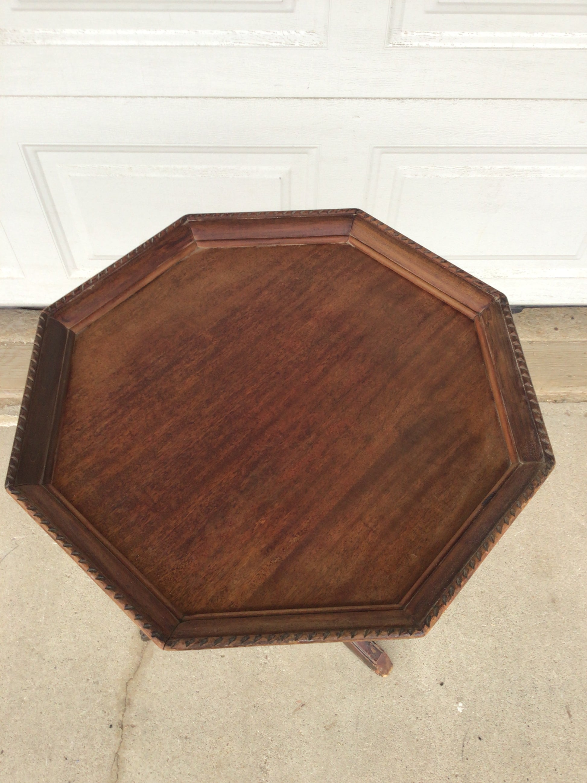Antique Mahogany Octagon Side Table. This antique side table is an octagon shape. One of the brass caps on the feet are missing as seen in the image. It would look beautiful in your living room.