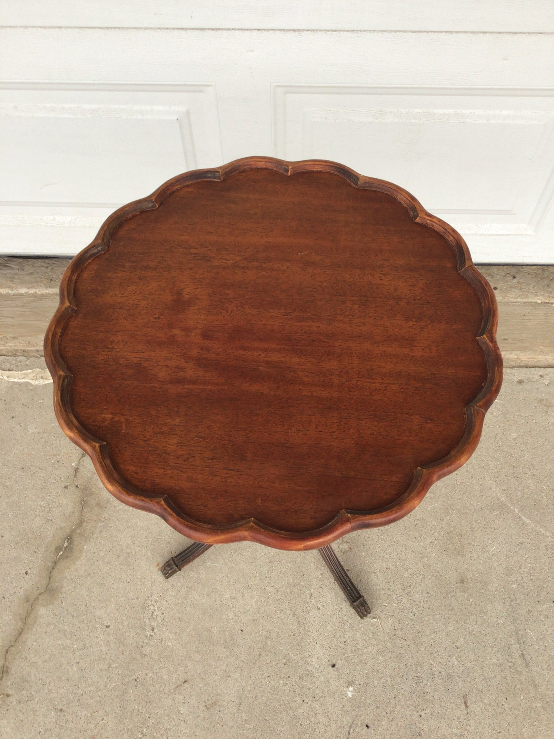 Antique Pie Crust Side Table. This antique wooden side table has a ruffled edge around the table top. The feet have brass caps on them. It would look great in your living room! In good condition.