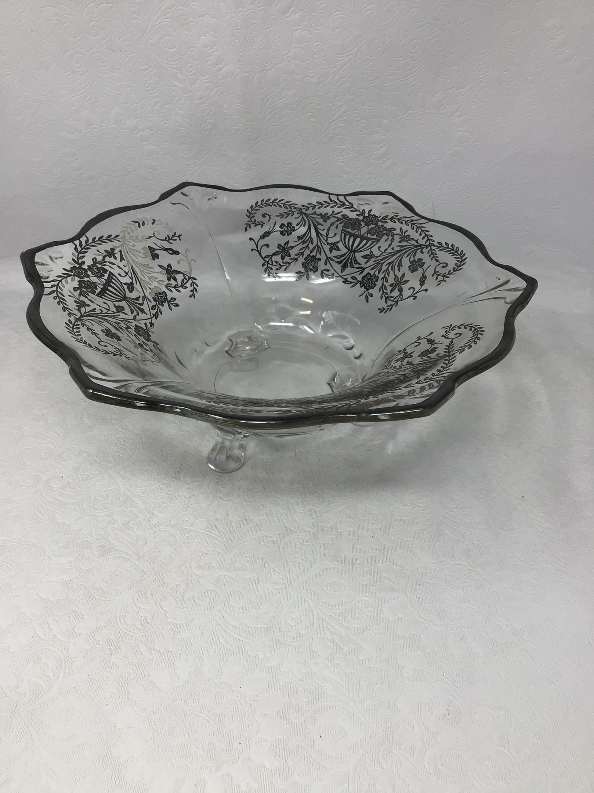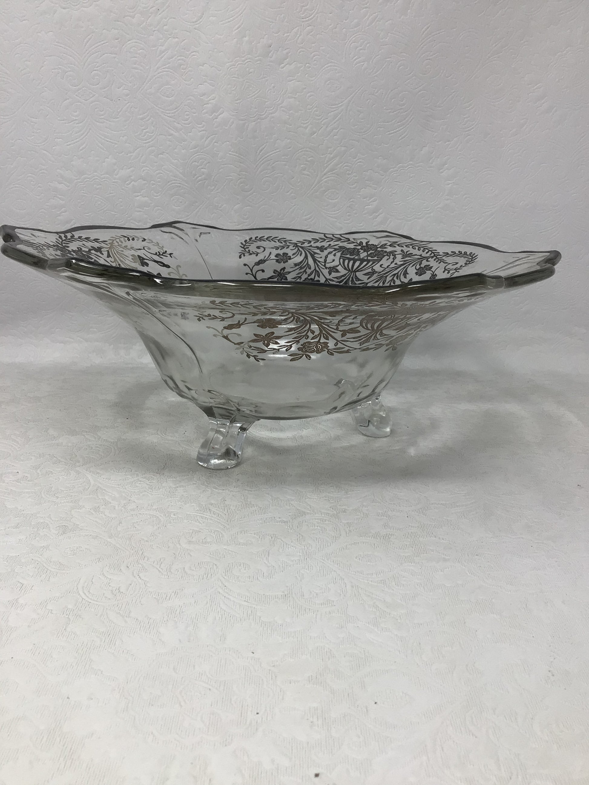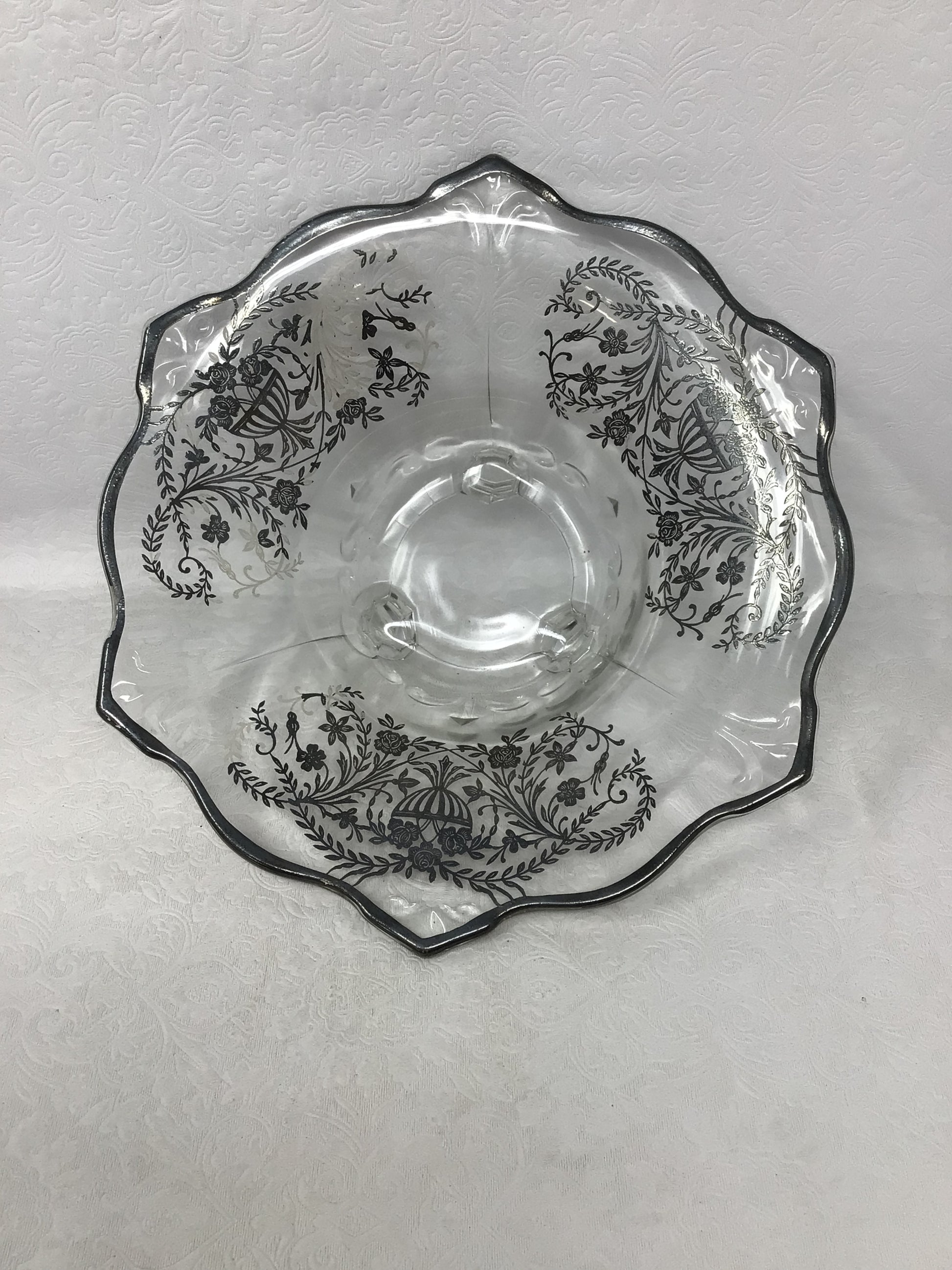 Antique Silver Overlay Glass Footed Bowl. This footed glass bowl has a silver overlay. It would look beautiful displayed in your home.