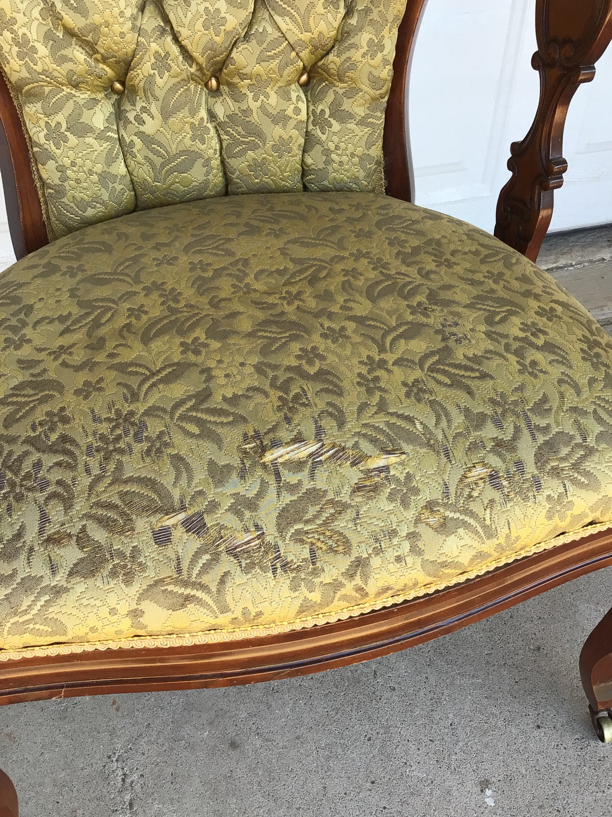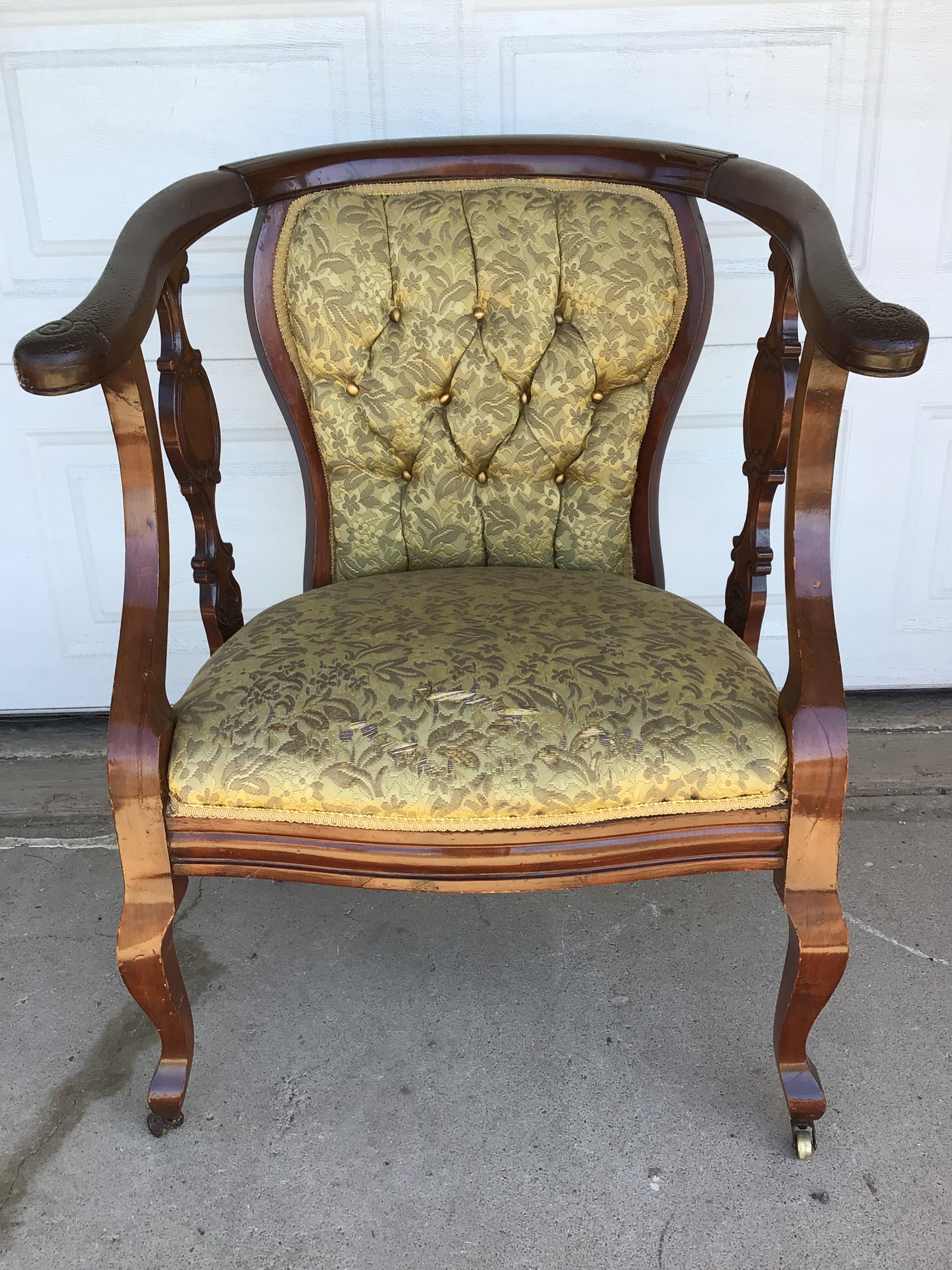 A very cute Antique Tub Style Chair. There is a slight rip in the seat as shown in the pictures.