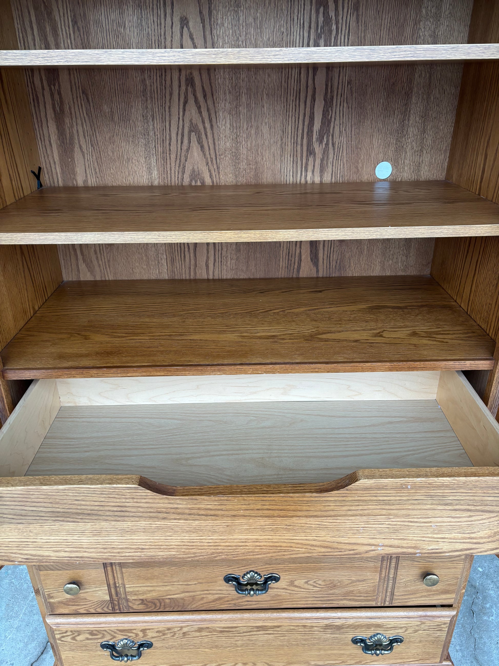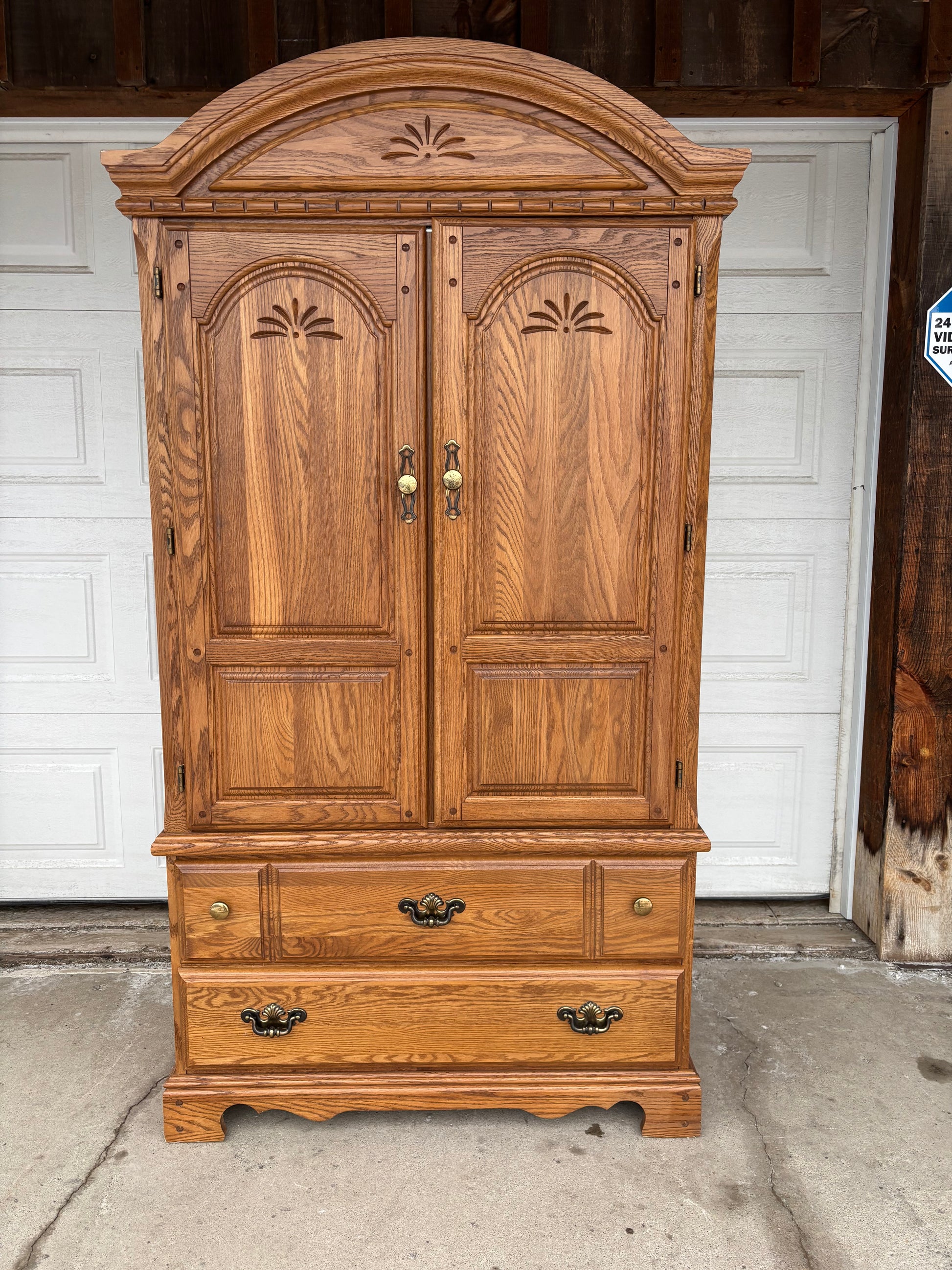 Wooden Armoire. This wooden armoire has lots of storage space! It could go in your bedroom, living room or basement to neatly put away clothes or linens. In good condition.