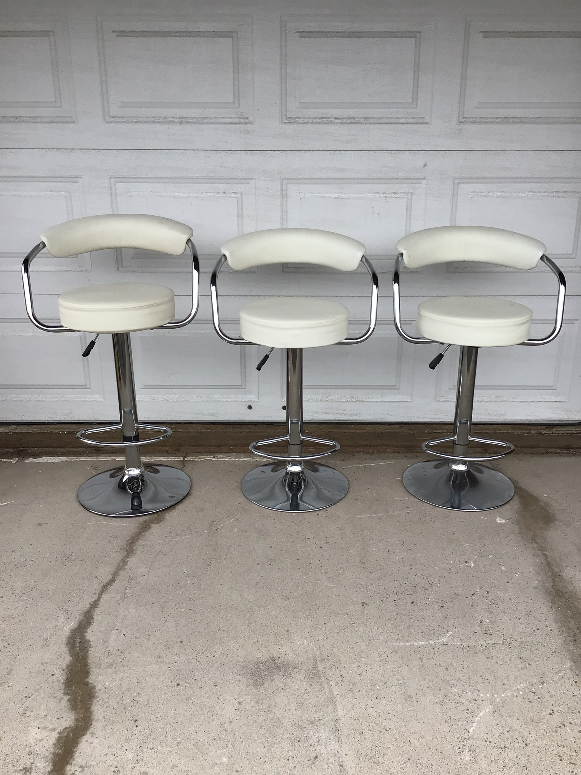 Bar Stool with White Cushion. This bar stool has a Mid-Century Modern look and can move up and down. There are three available but they are sold separately.