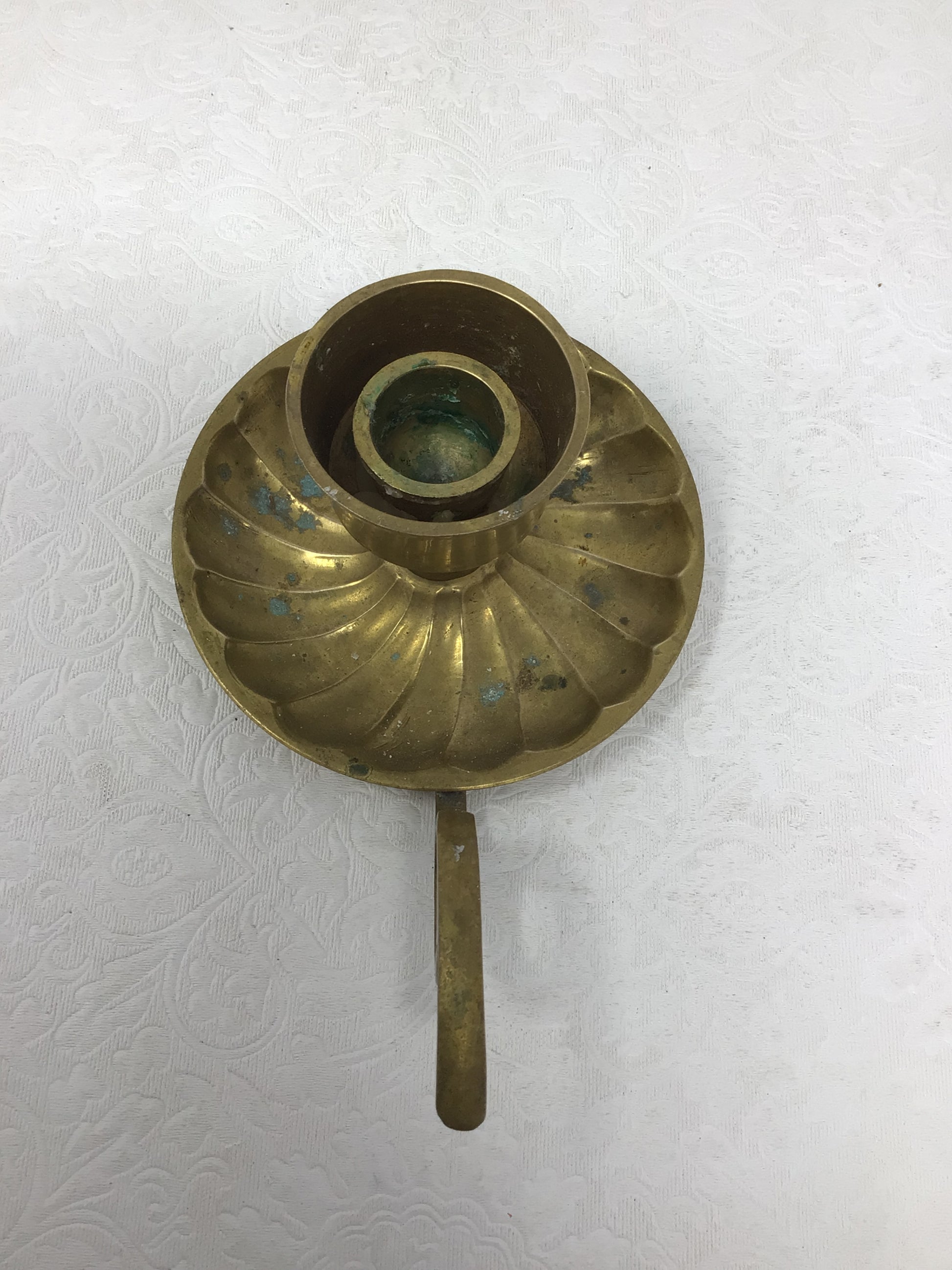Brass Candle Holder. This candle holder has a tray to catch the melting wax and a handle. The brass has marks from previous use, as seen in the pictures.