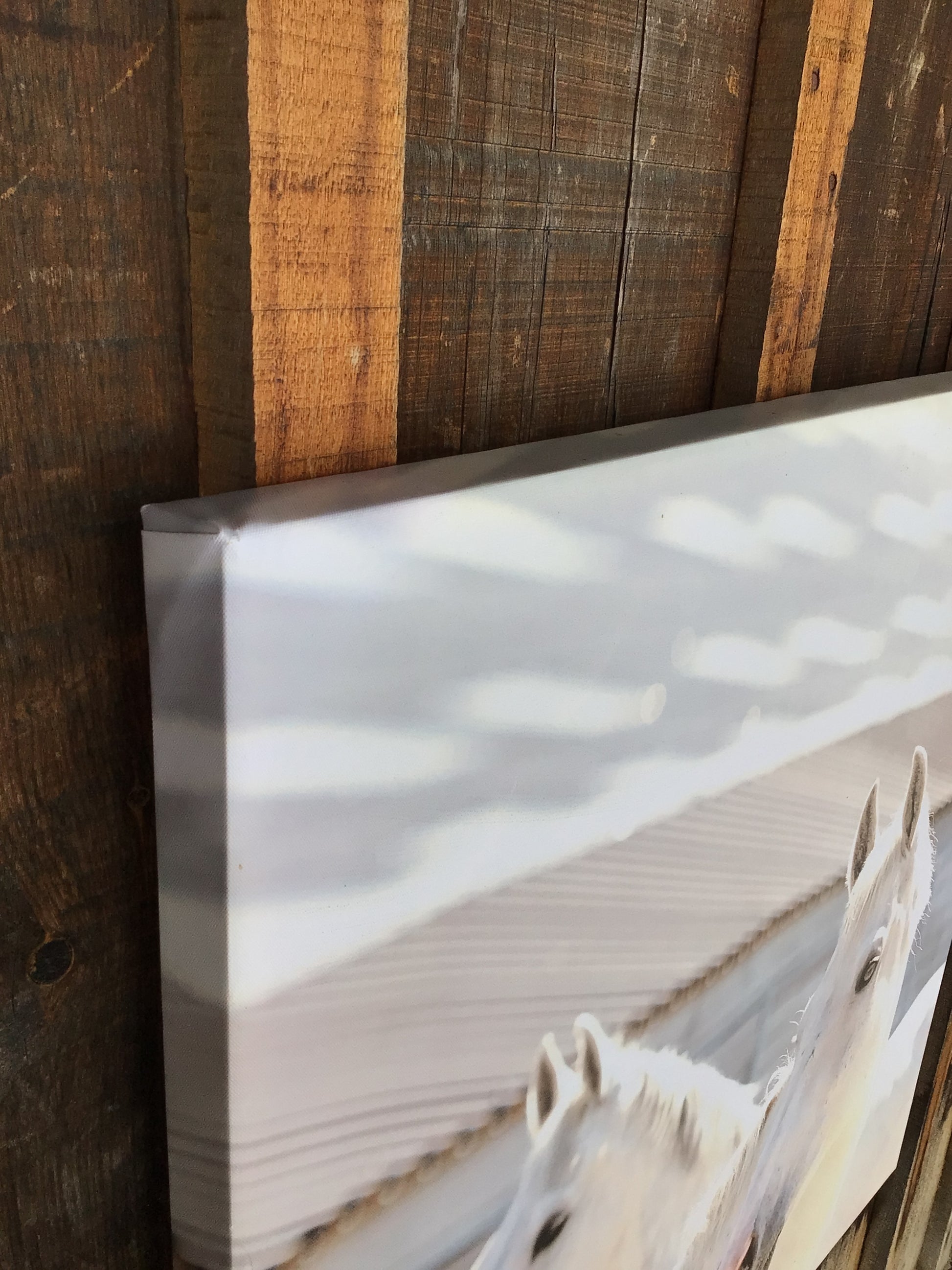 Canvas with 2 White Horses. The artwork is a close up horses head with an unfocused horse head behind it. This would look great hung up in your home! There are a few marks small on the canvas which is shown in the images.