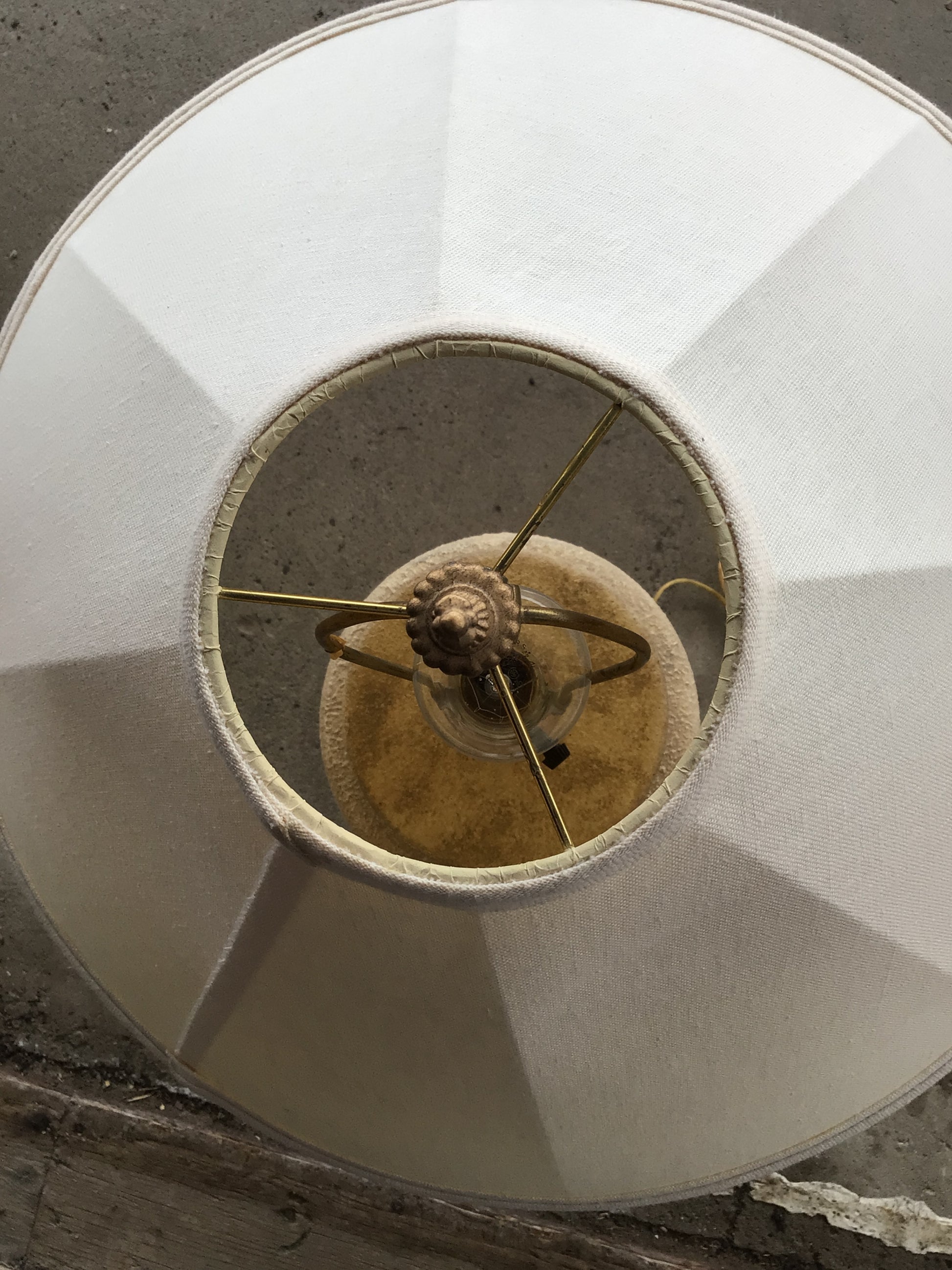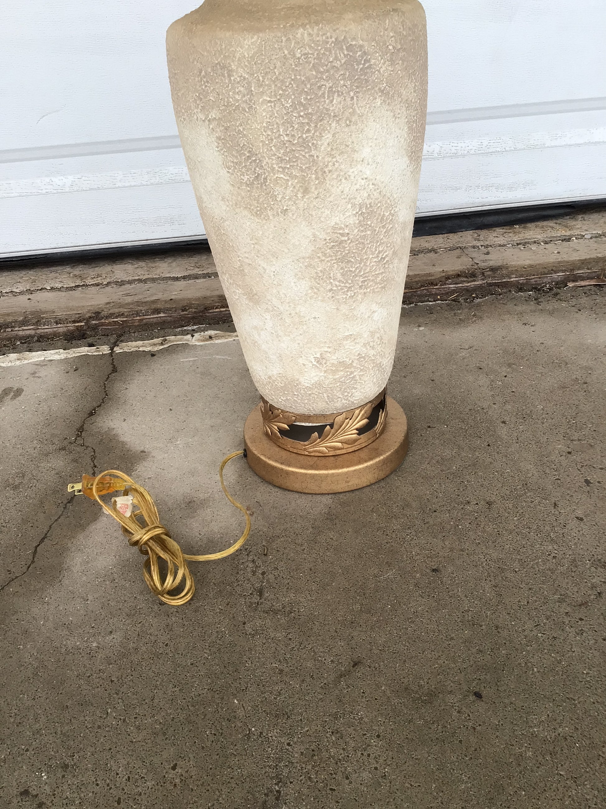 Ceramic accent table lamp with painted beige finish, gold coloured filigree base and cream linen shade.