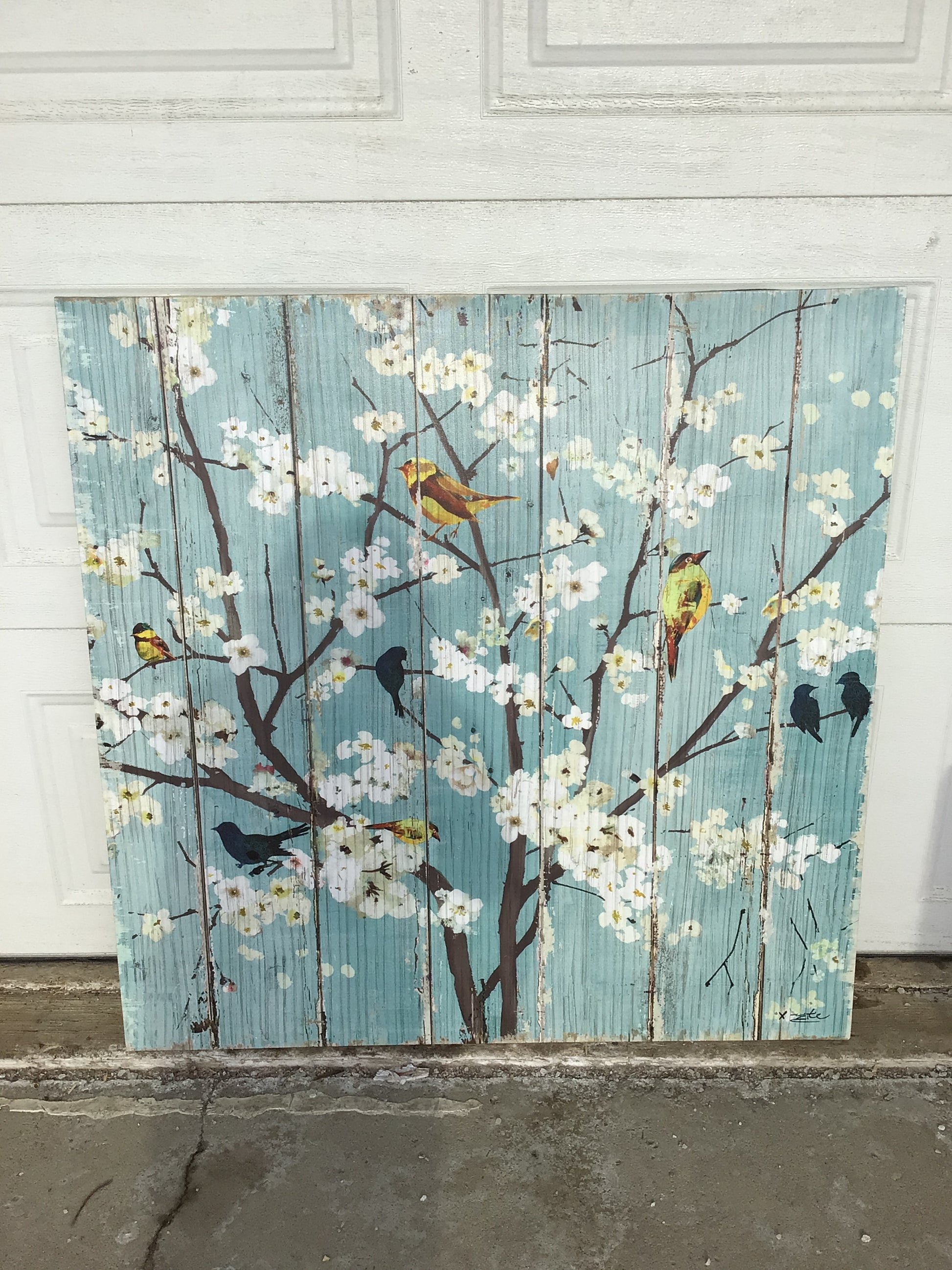 Pretty cherry blossoms and birds on turquoise background. Canvas.