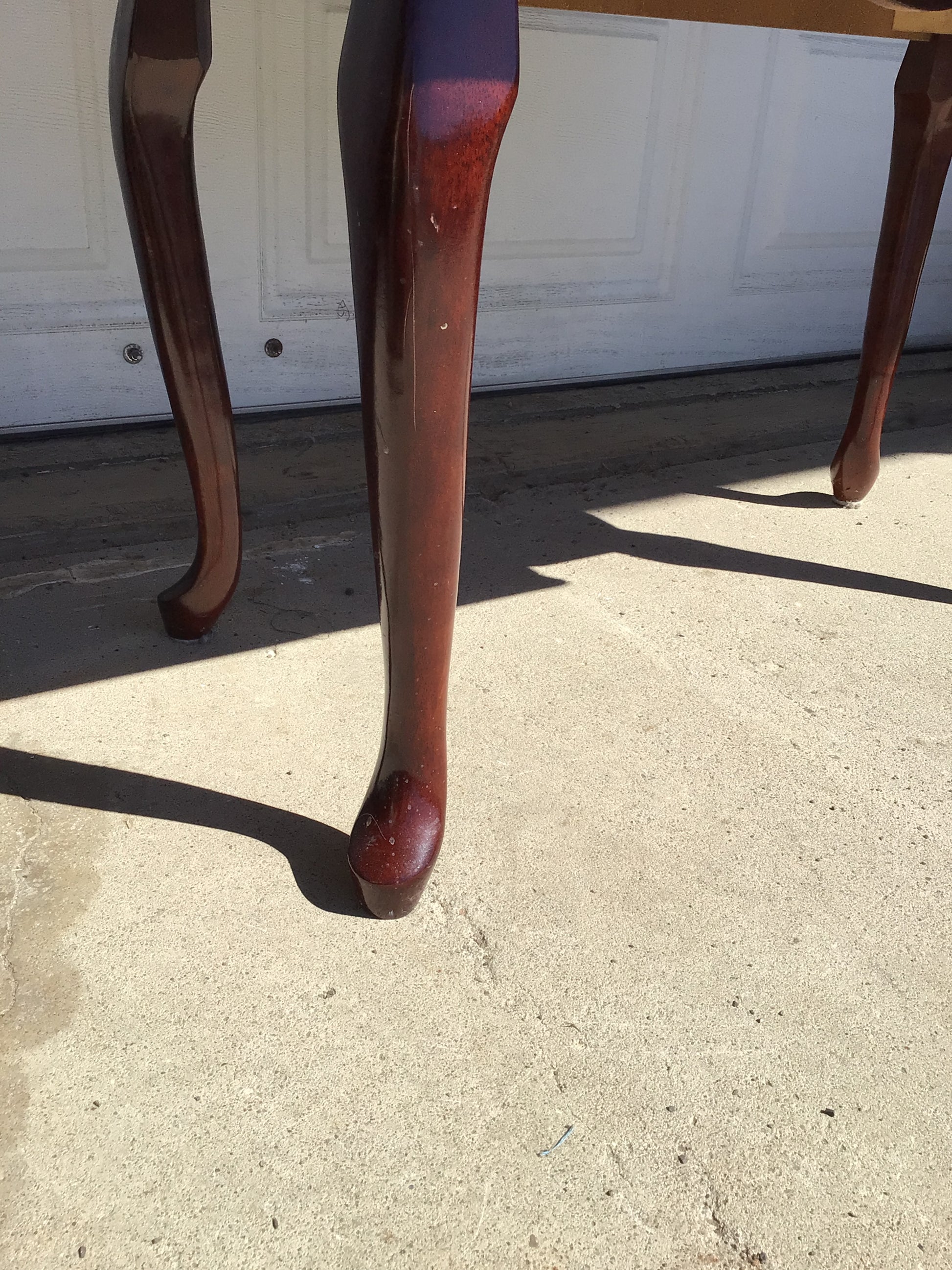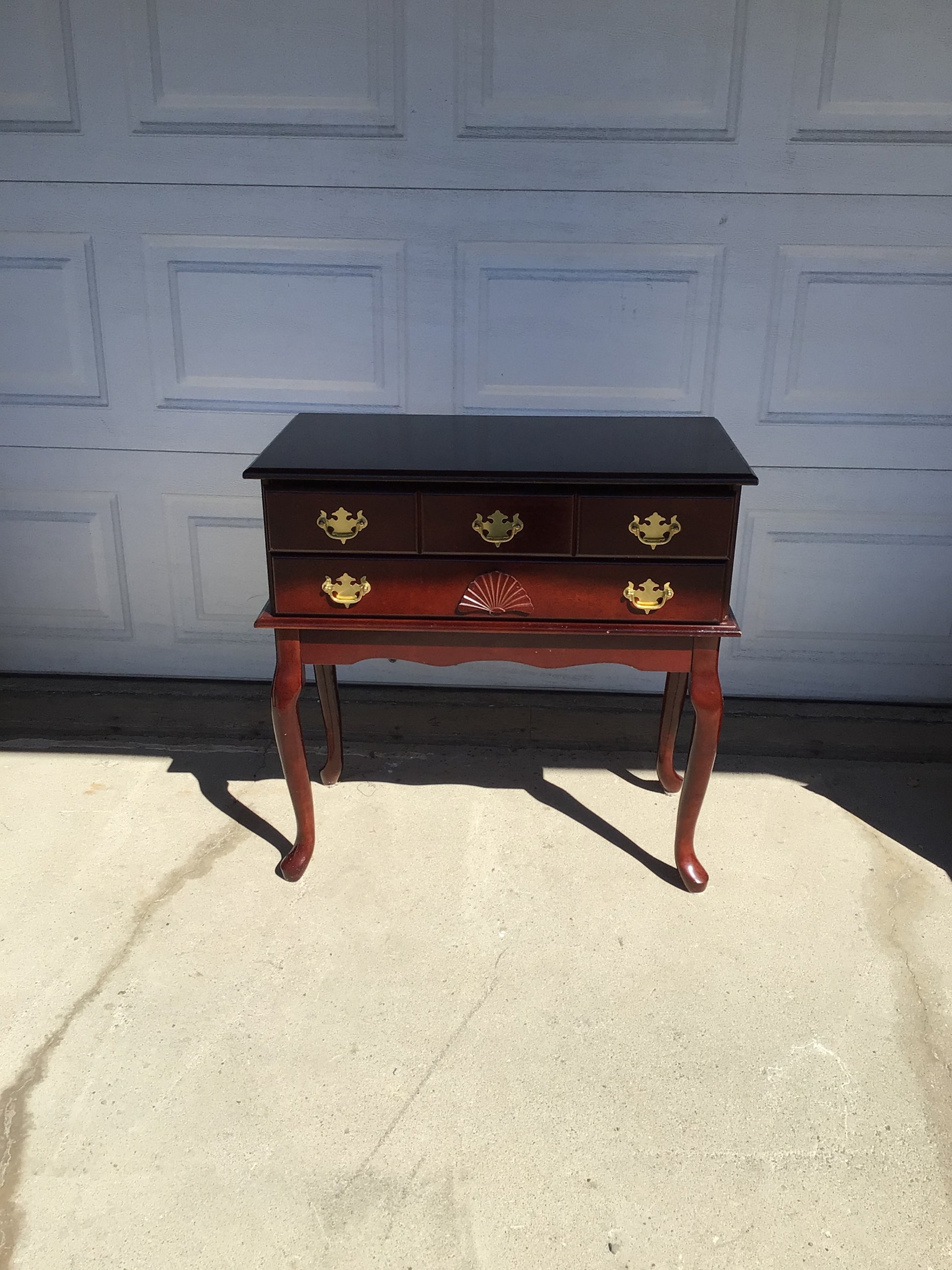Cherry Two Drawer Side Table - Deep red wooden table with two drawers and gold coloured handles.