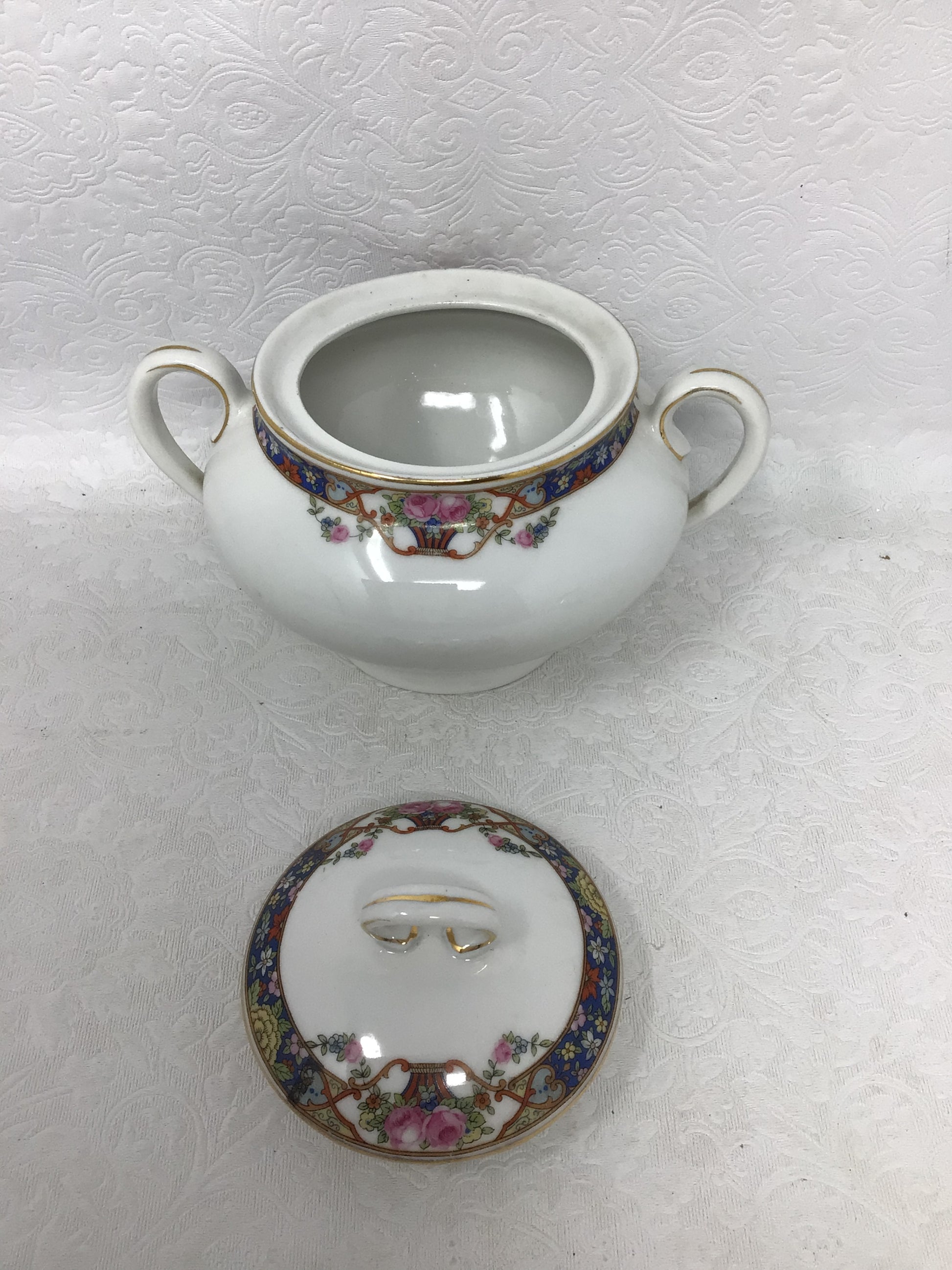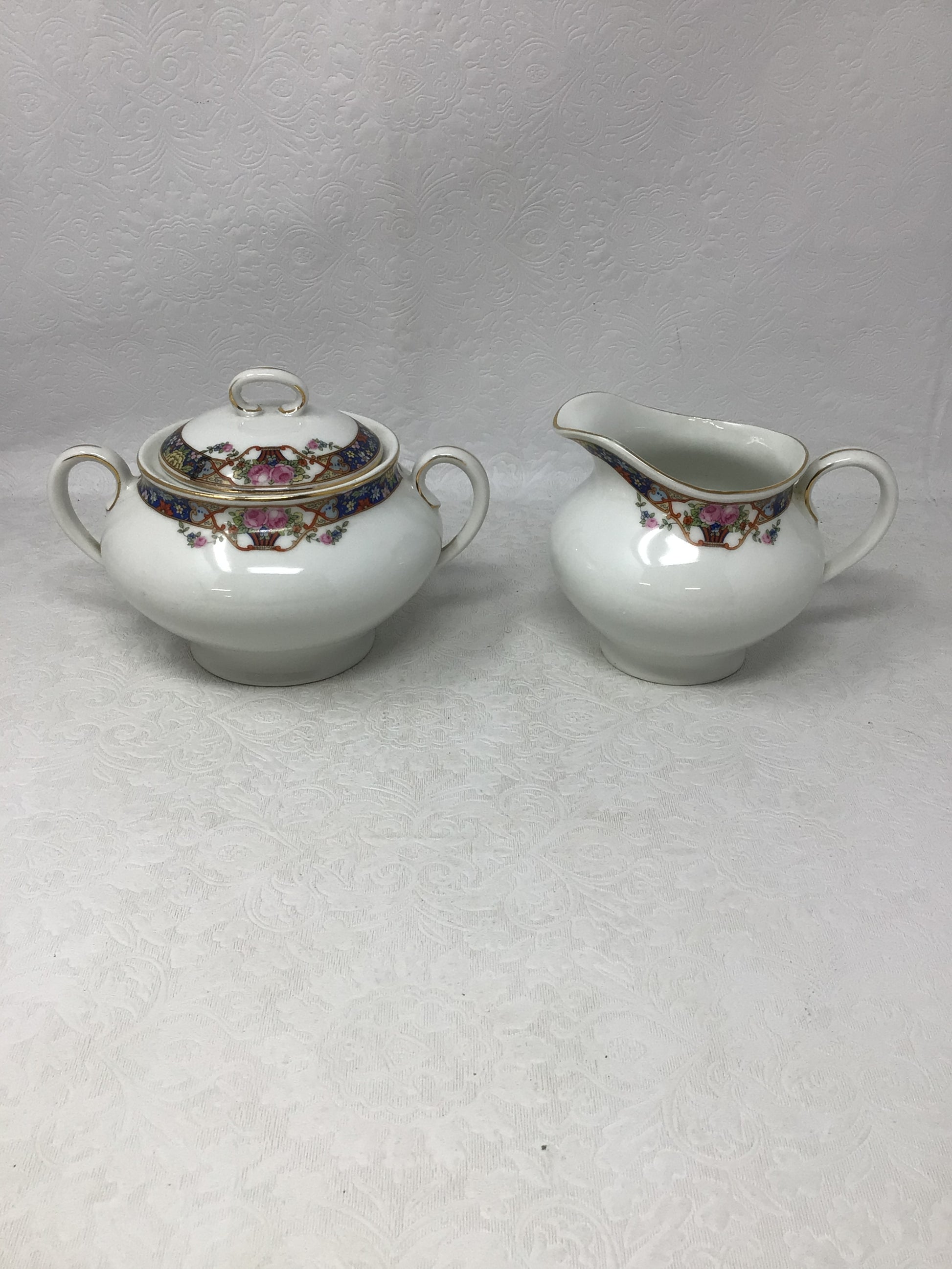 Creamer and Sugar with Floral Pattern. This matching creamer and lidded sugar bowl set is white with a floral pattern around the top with gold detailing.