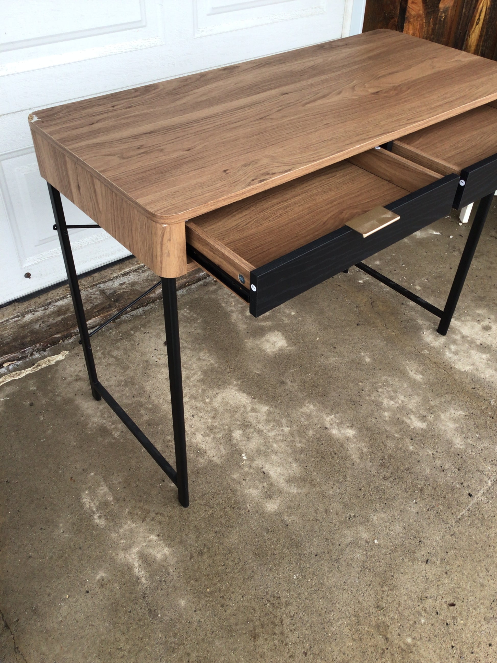 JR Home Collection Desk. This desk has two drawers and it small enough where it could easily fit in any space. In good condition, there is a small chip in the top left corner as seen in the images.