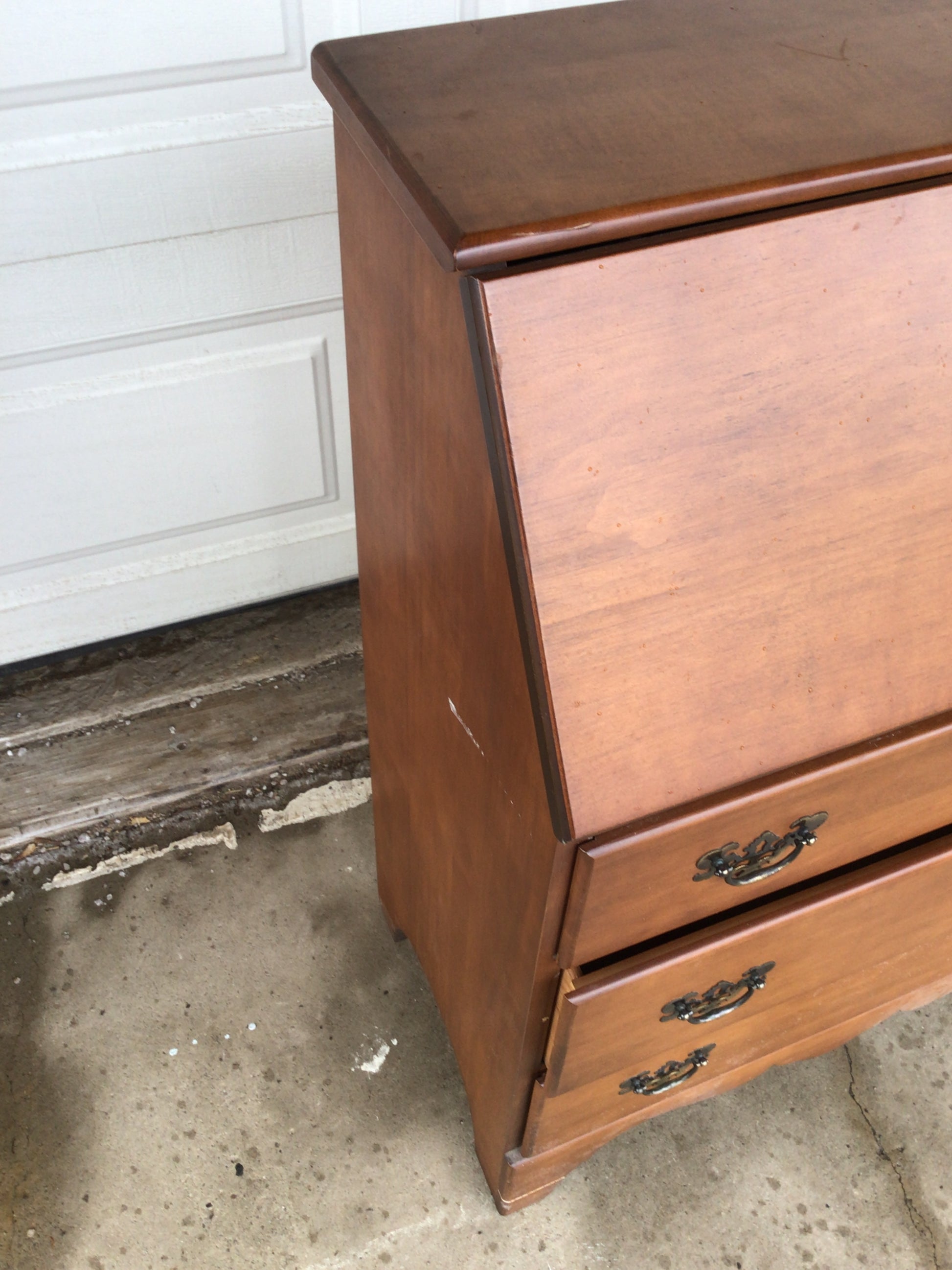 Drop Down Secretary Desk. This features a slant that opens to a built-in organizer with cubbies and small drawers. The lower section has three dresser-sized drawers the brass hardware.