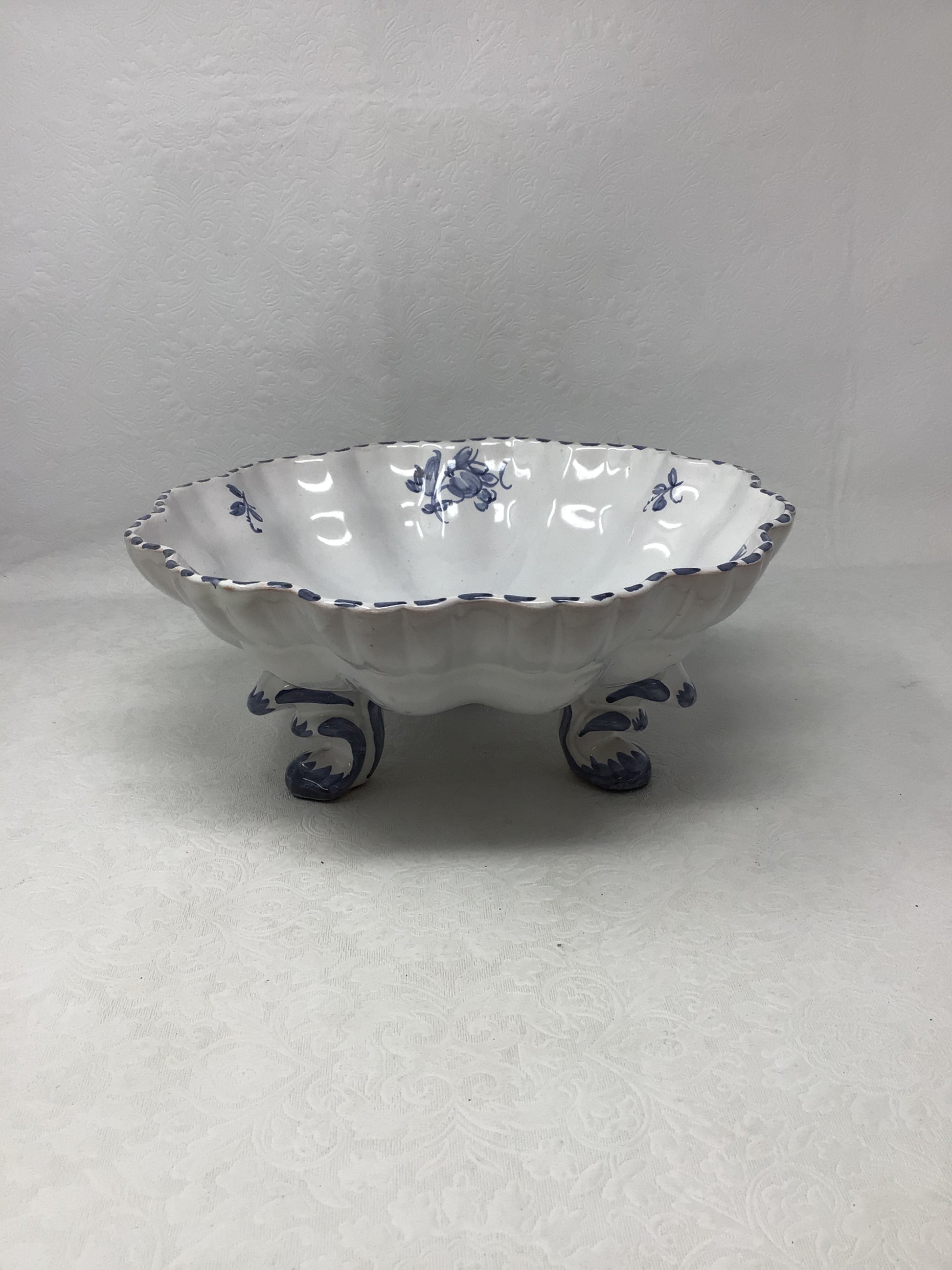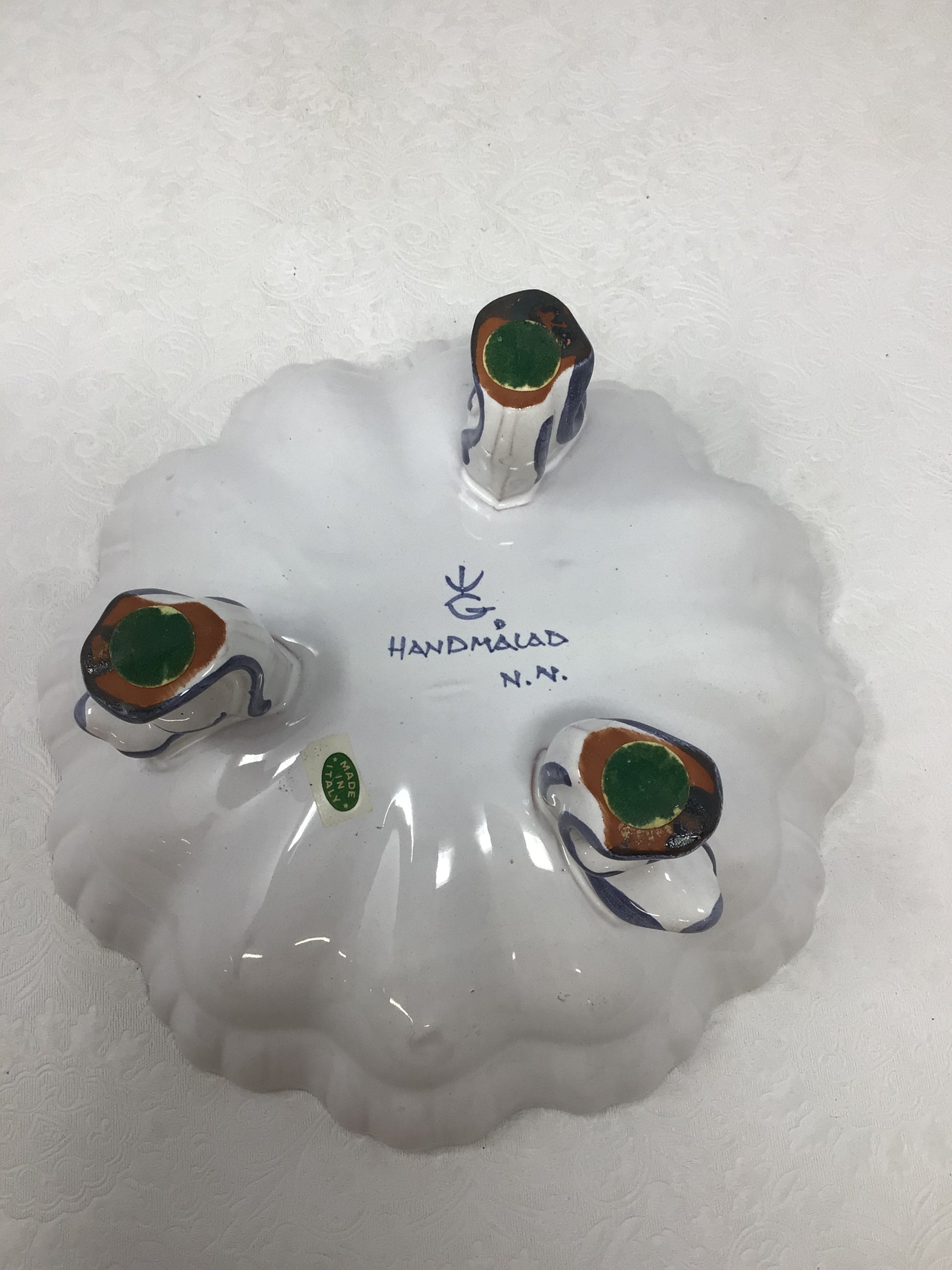 Beautiful blue and white bowl with feet. HANDMALAD N.N. markings. Made in Italy.