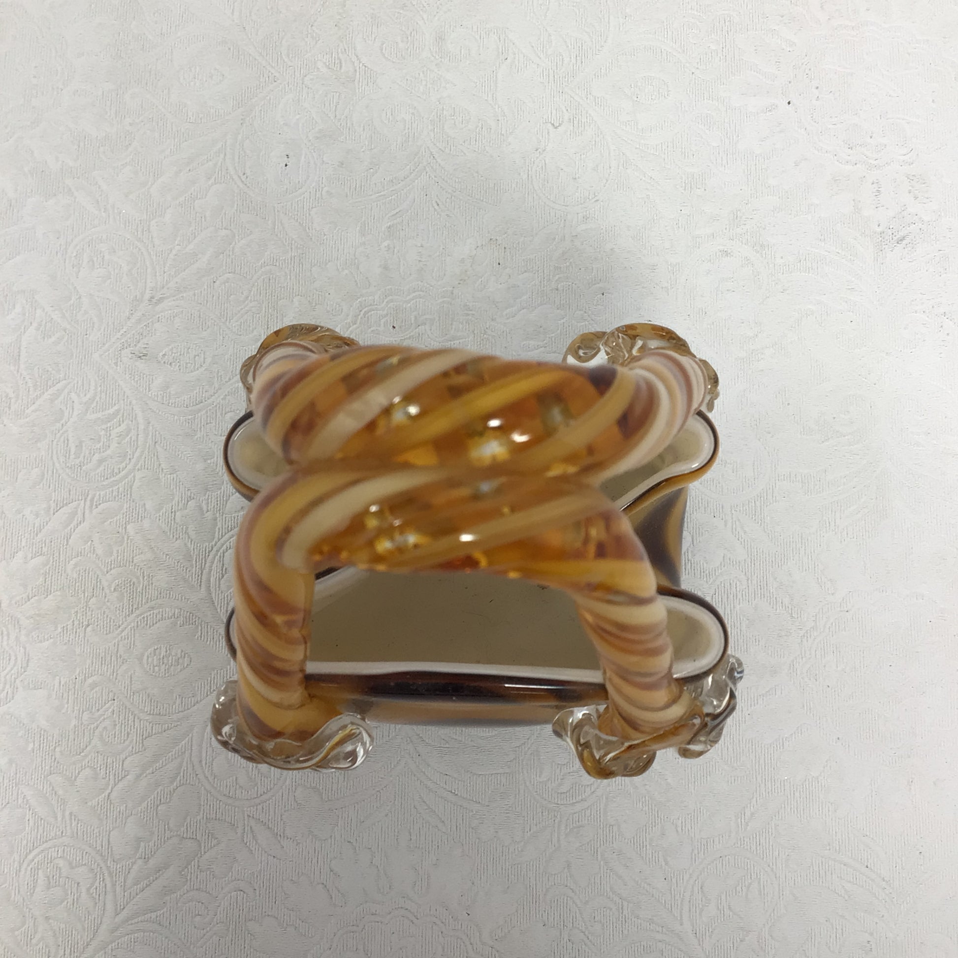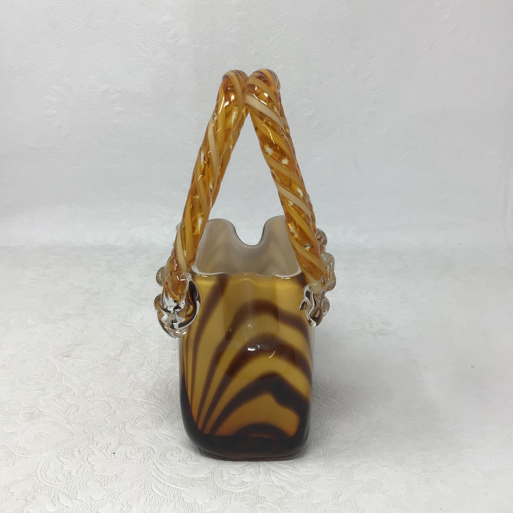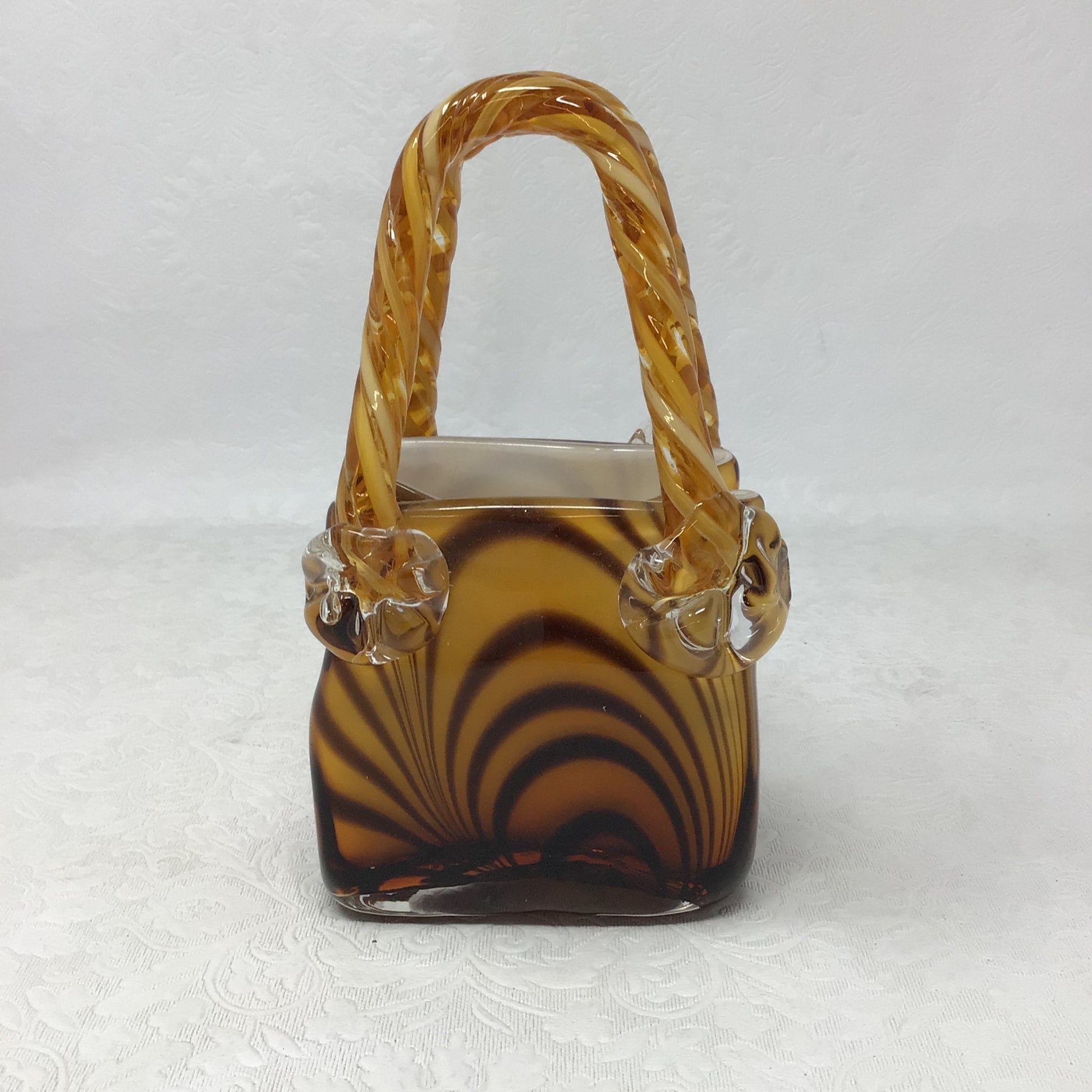 Murano Style Glass Handbag Vase - Hand blown glass made with vibrant colours and unique design like this brown and amber swirl pattern. Twisted handles are common feature of this style of art glass.