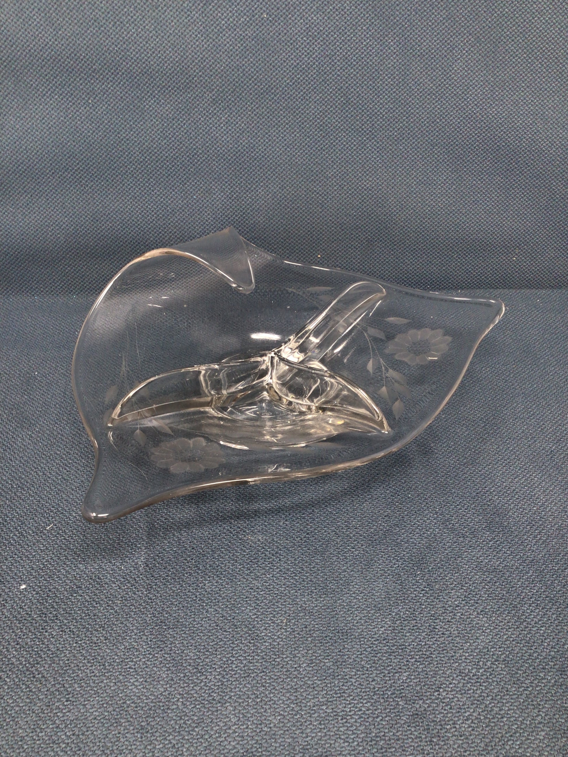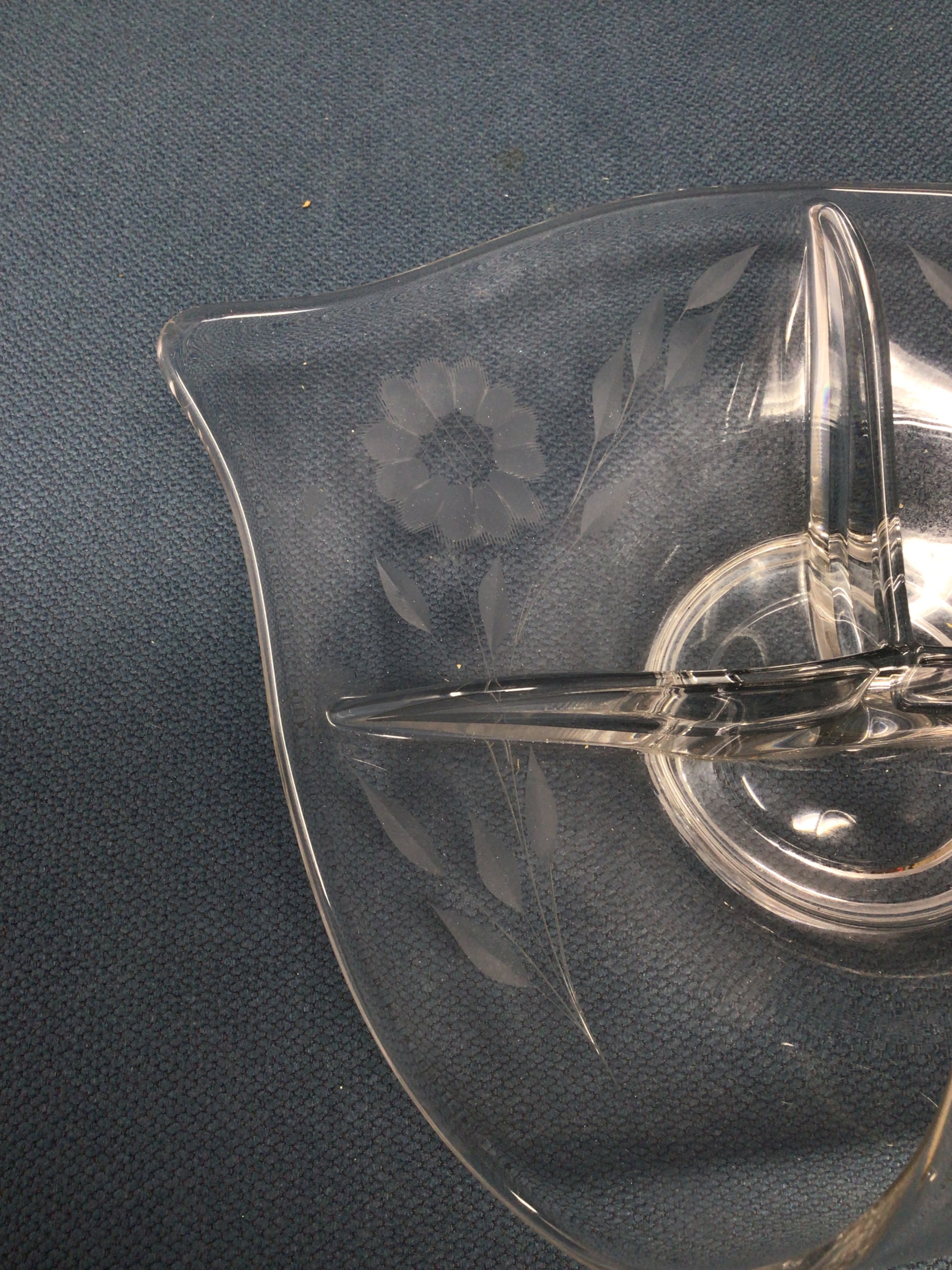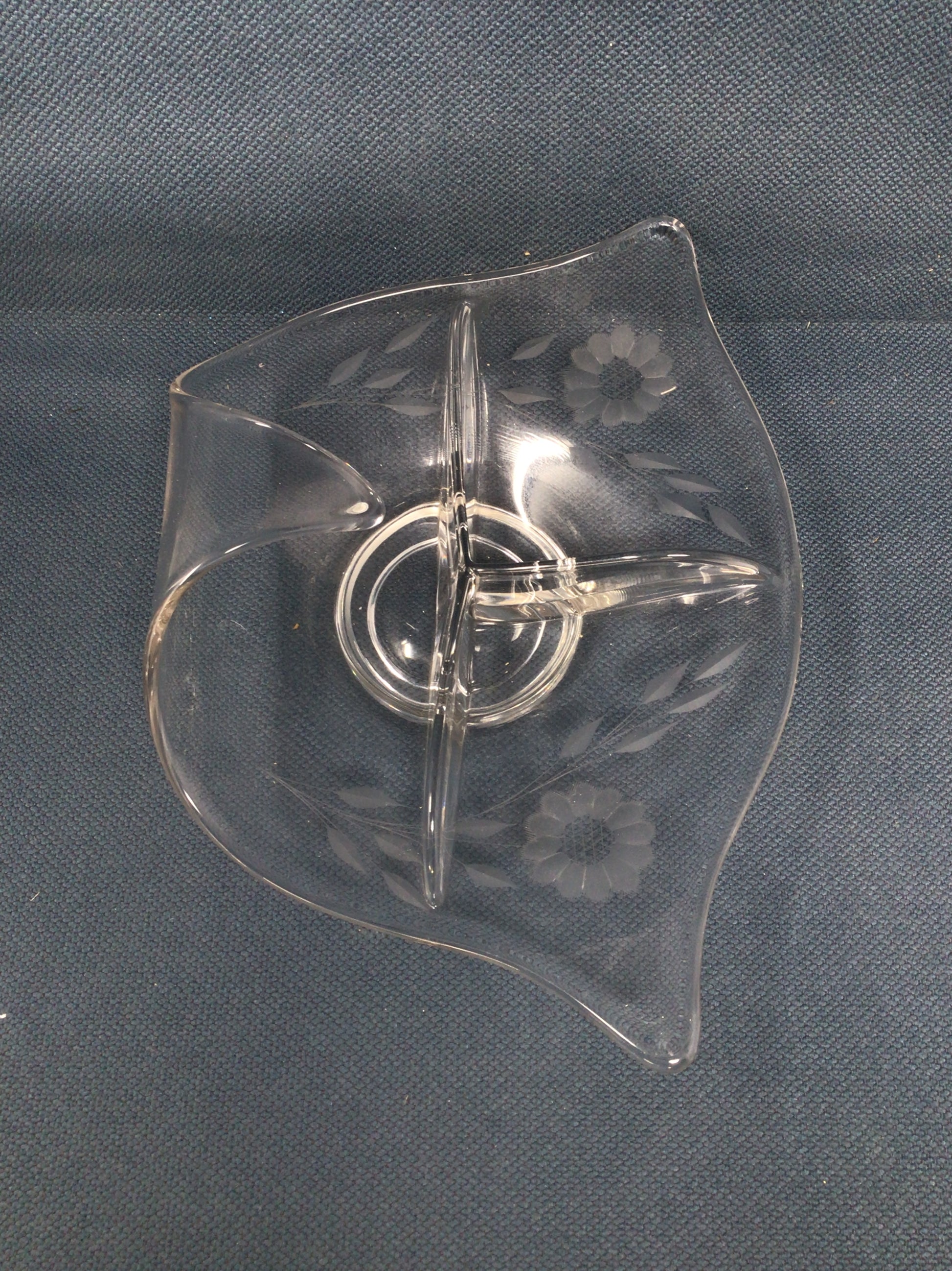 Glass Cornflower Divided Dish. This beautiful glass folded dish has three sections. It could be used to serve food or hold jewelry. There are two cornflowers etched into it. In good condition.