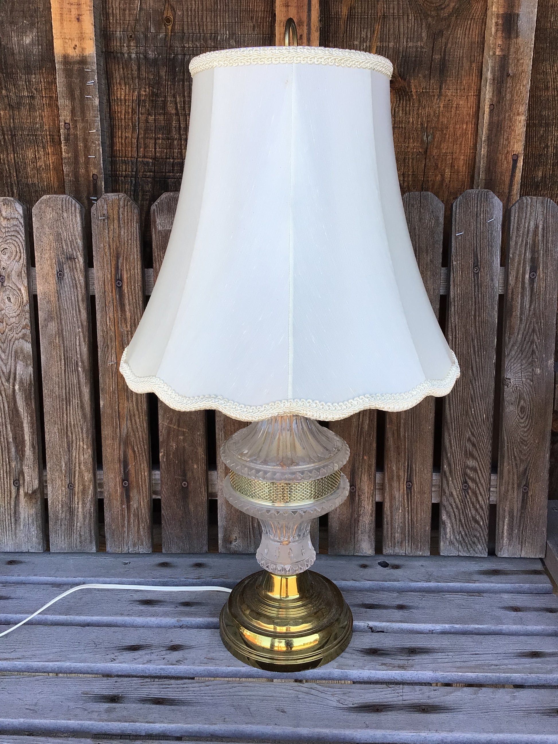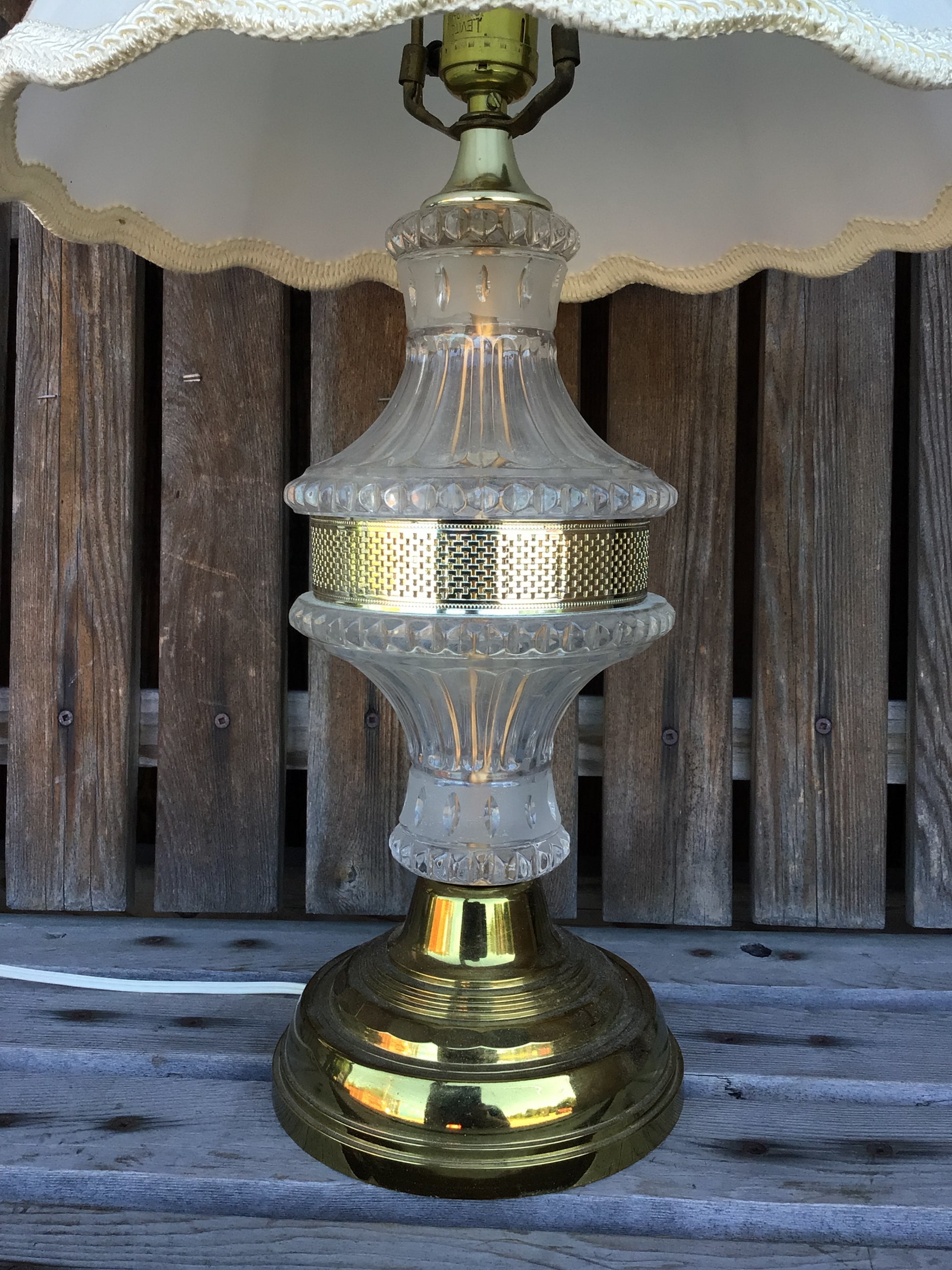 Gold and Crystal Like Table Lamp. This table lamp would look lovely in a living room or bedroom. In good condition.