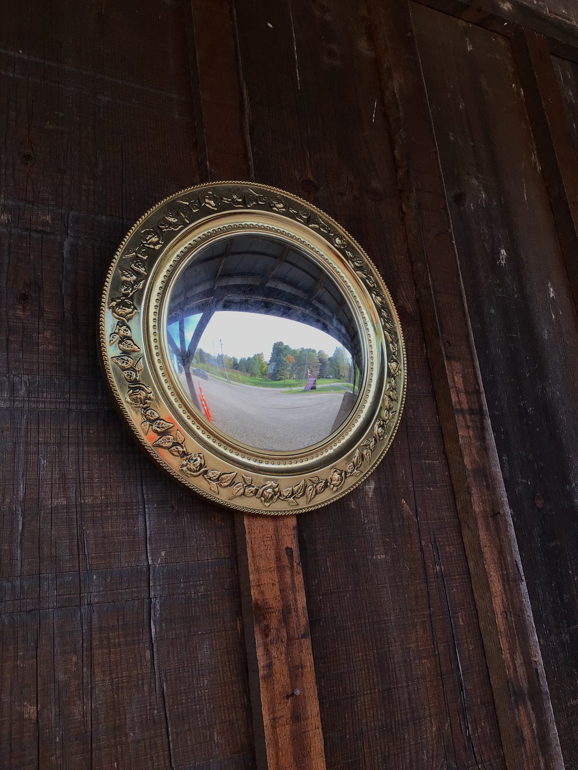 Gold Convex Mirror. This small round mirror is a convex mirror. It has a gold frame with roses, and comes ready to hang. It would look great in your home!