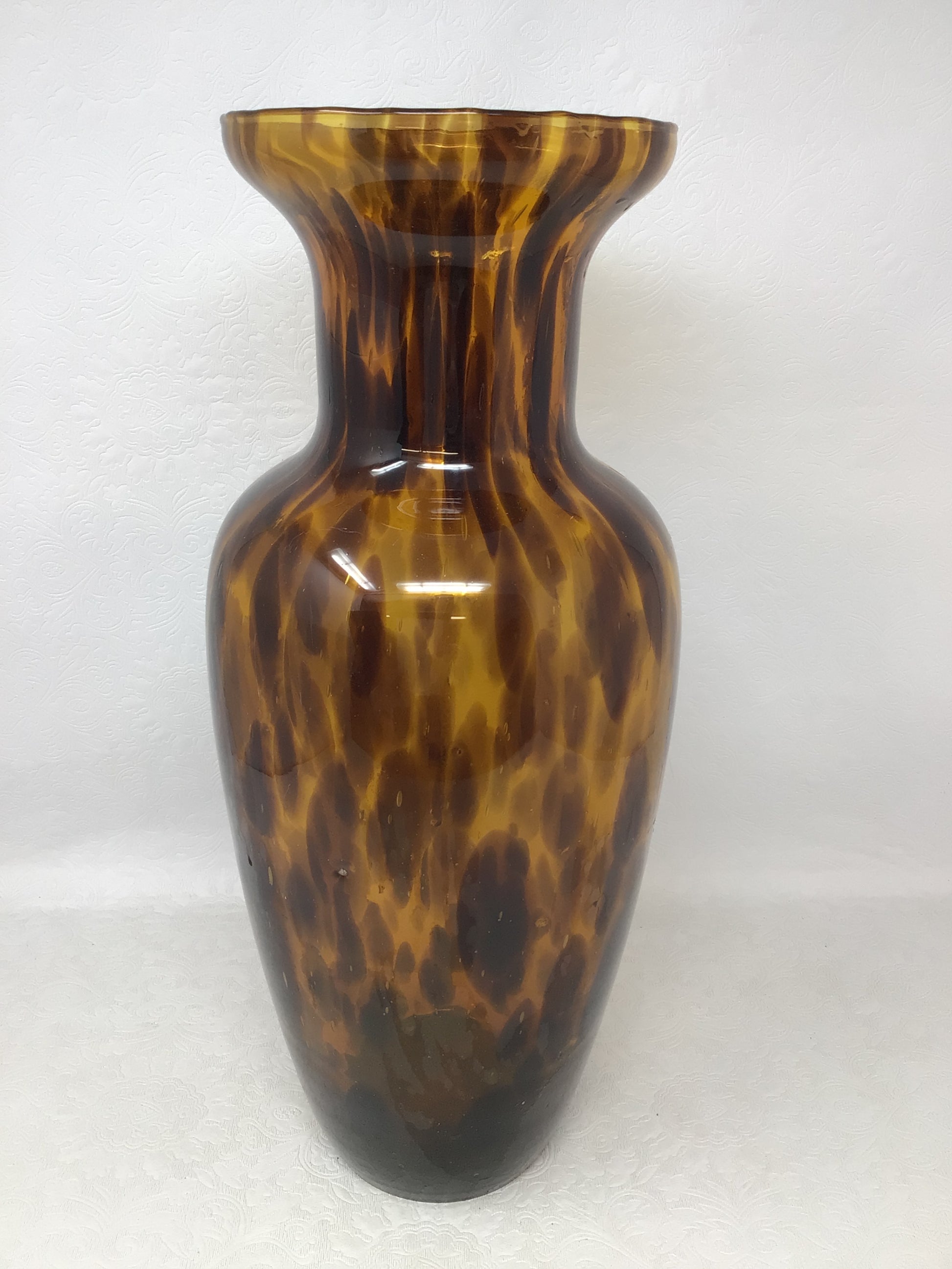 A lovely Handblown Art Glass Vase. This vase is in a leopard print in rich amber and brown tones.