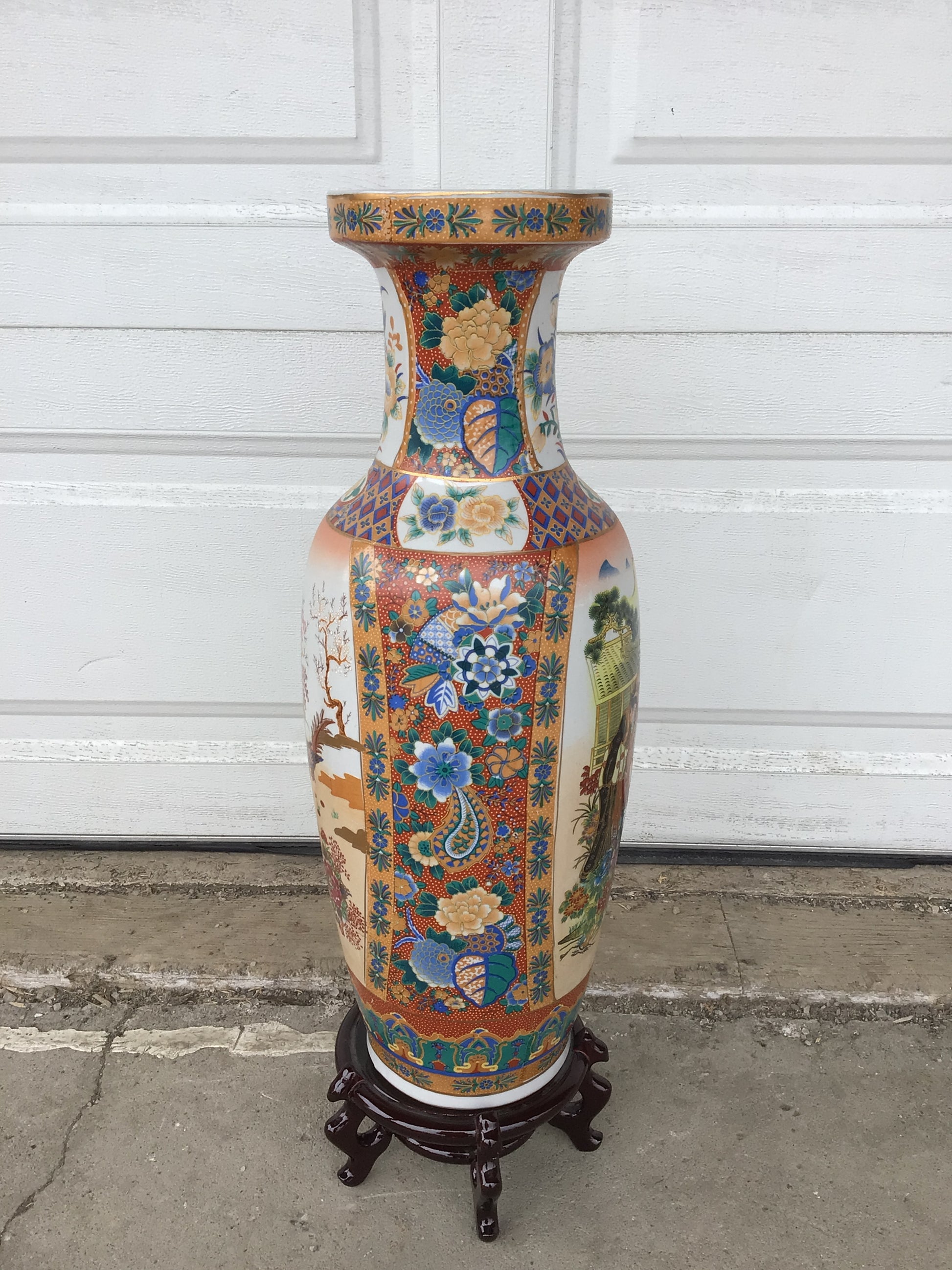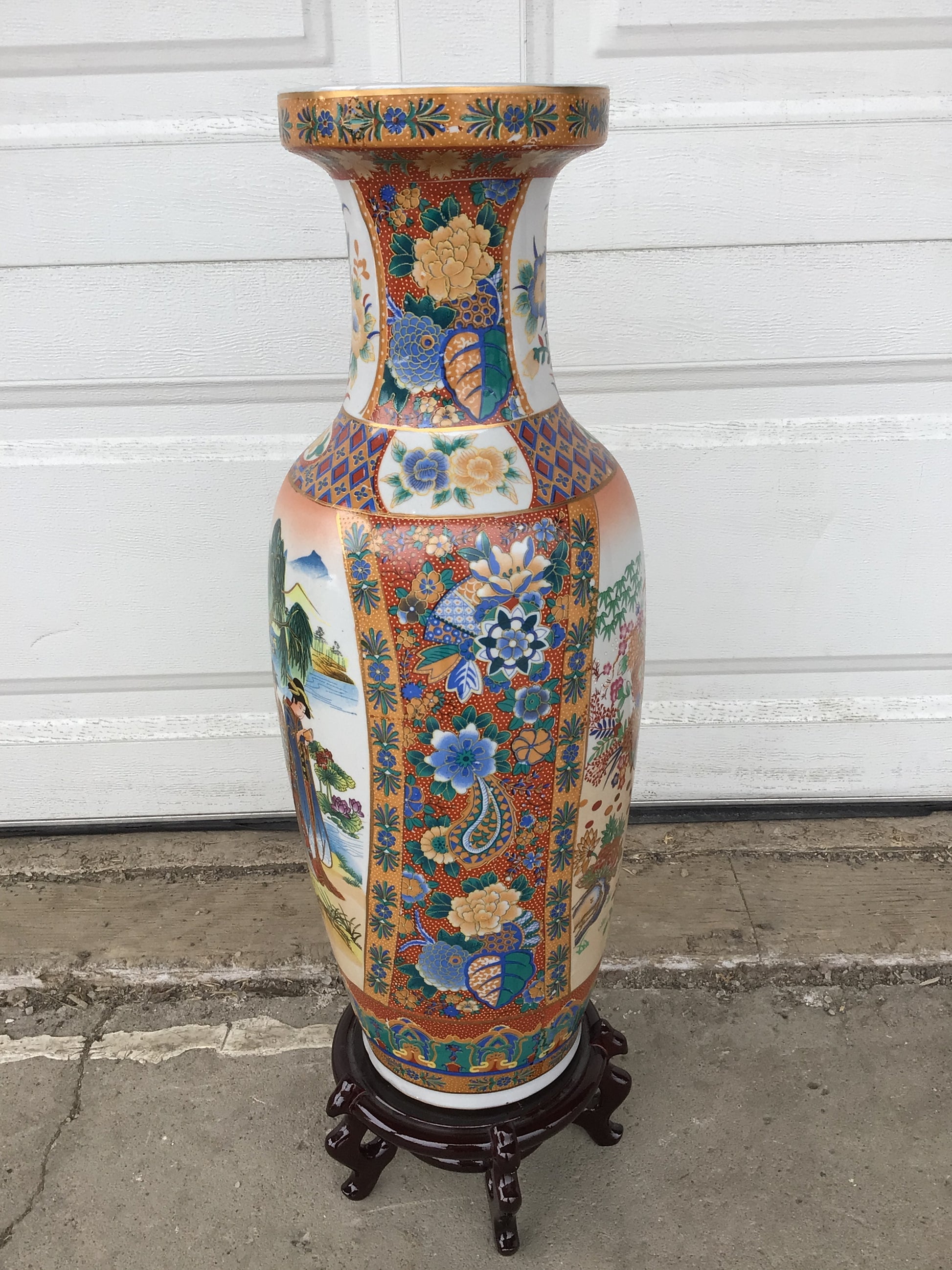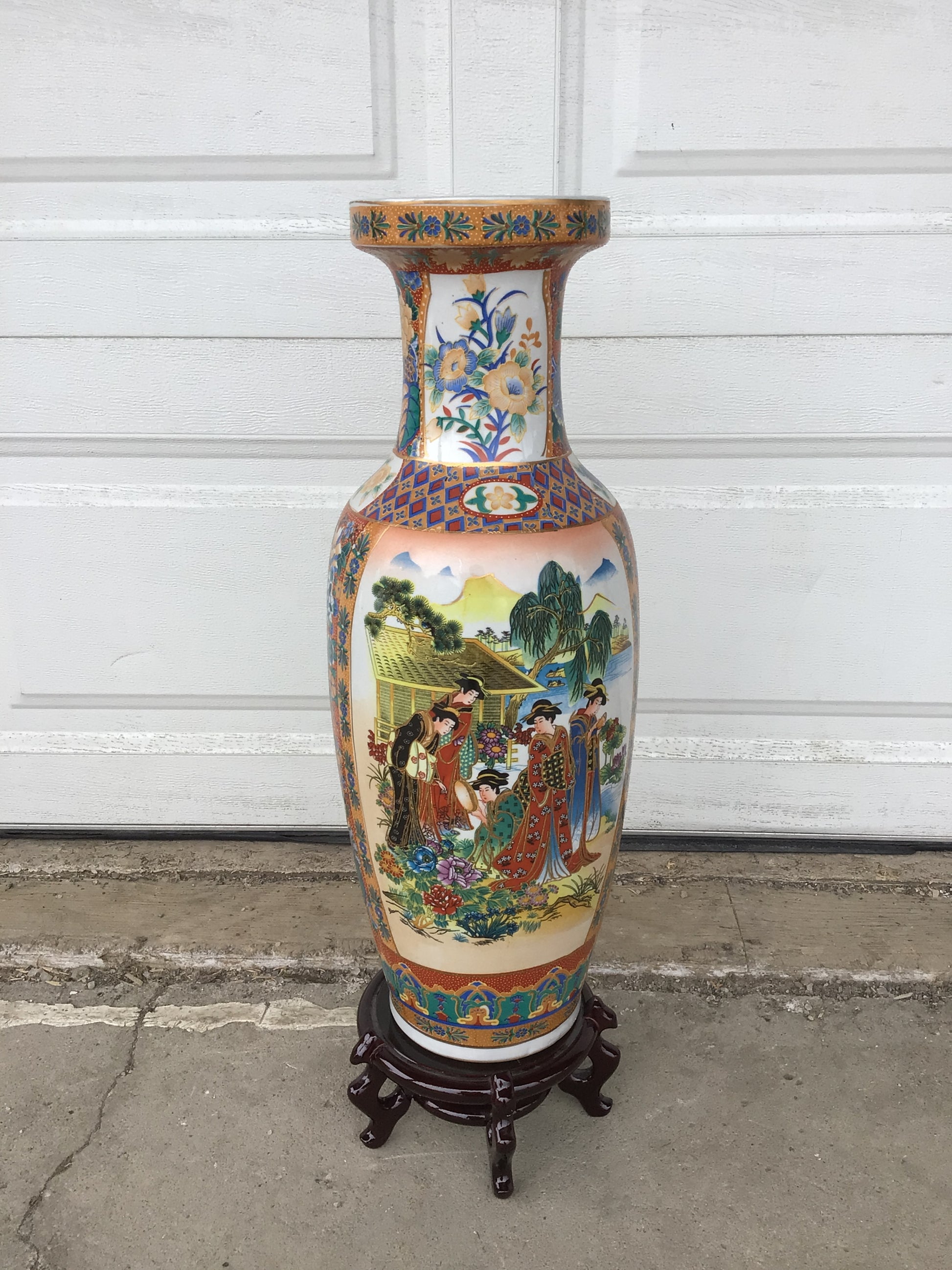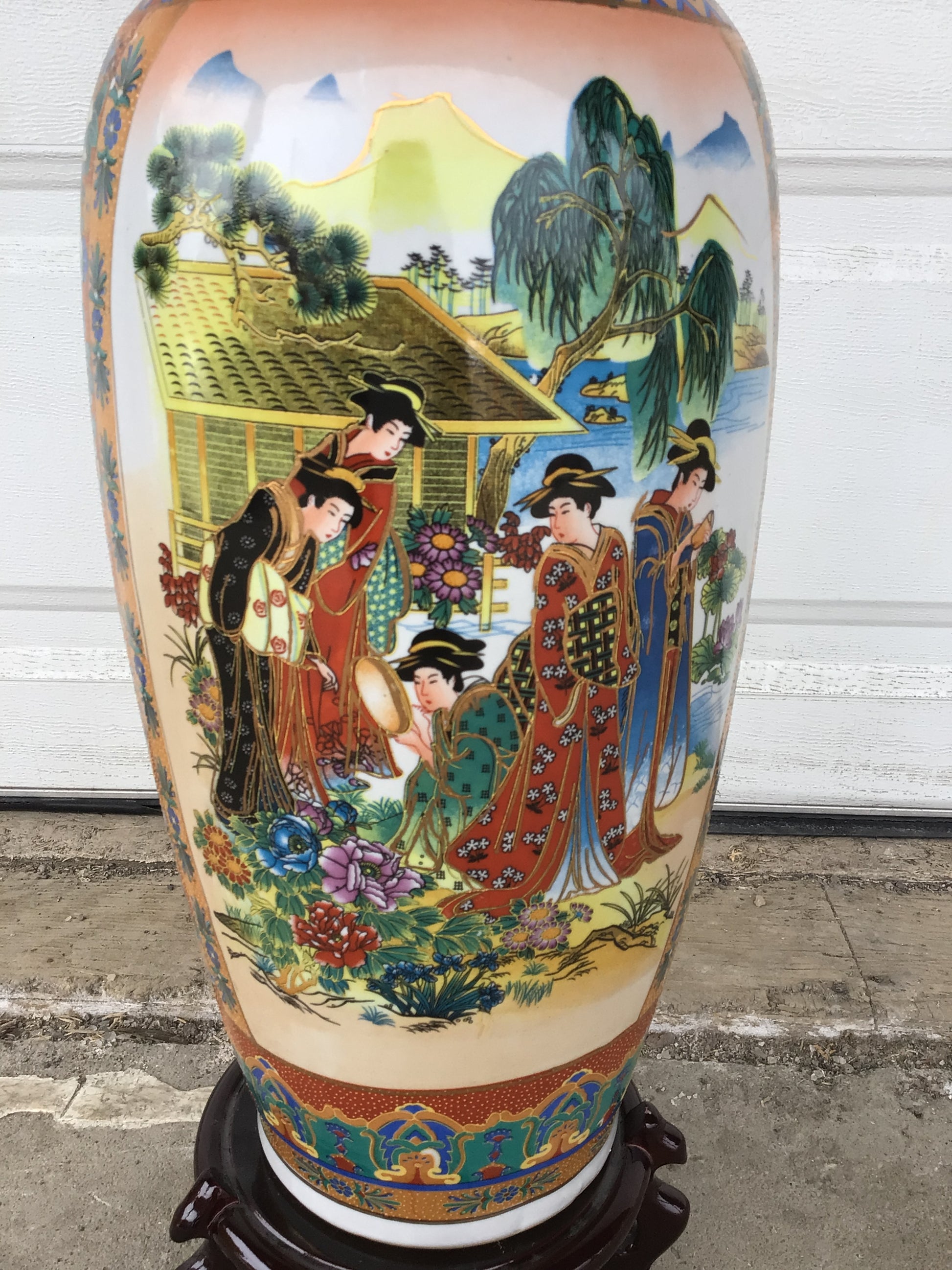 Japanese-style Satsuma vase featuring hand-painted panels depicting geisha scenes on porcelain. Includes wooden stand.