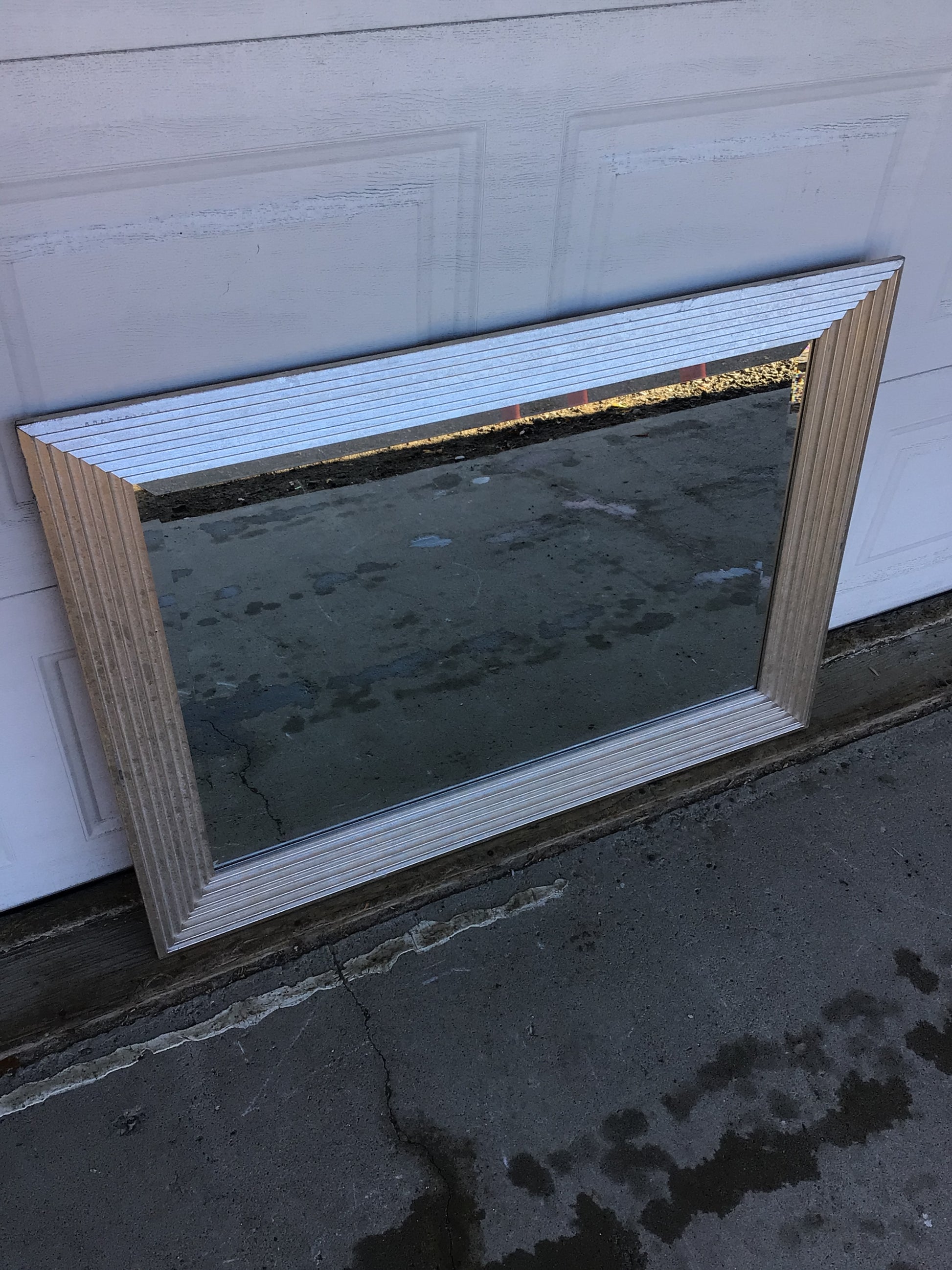 Large Silver Wall Mirror. This large mirror has a silver frame that comes ready to hang. It would look great in your bathroom or bedroom.
