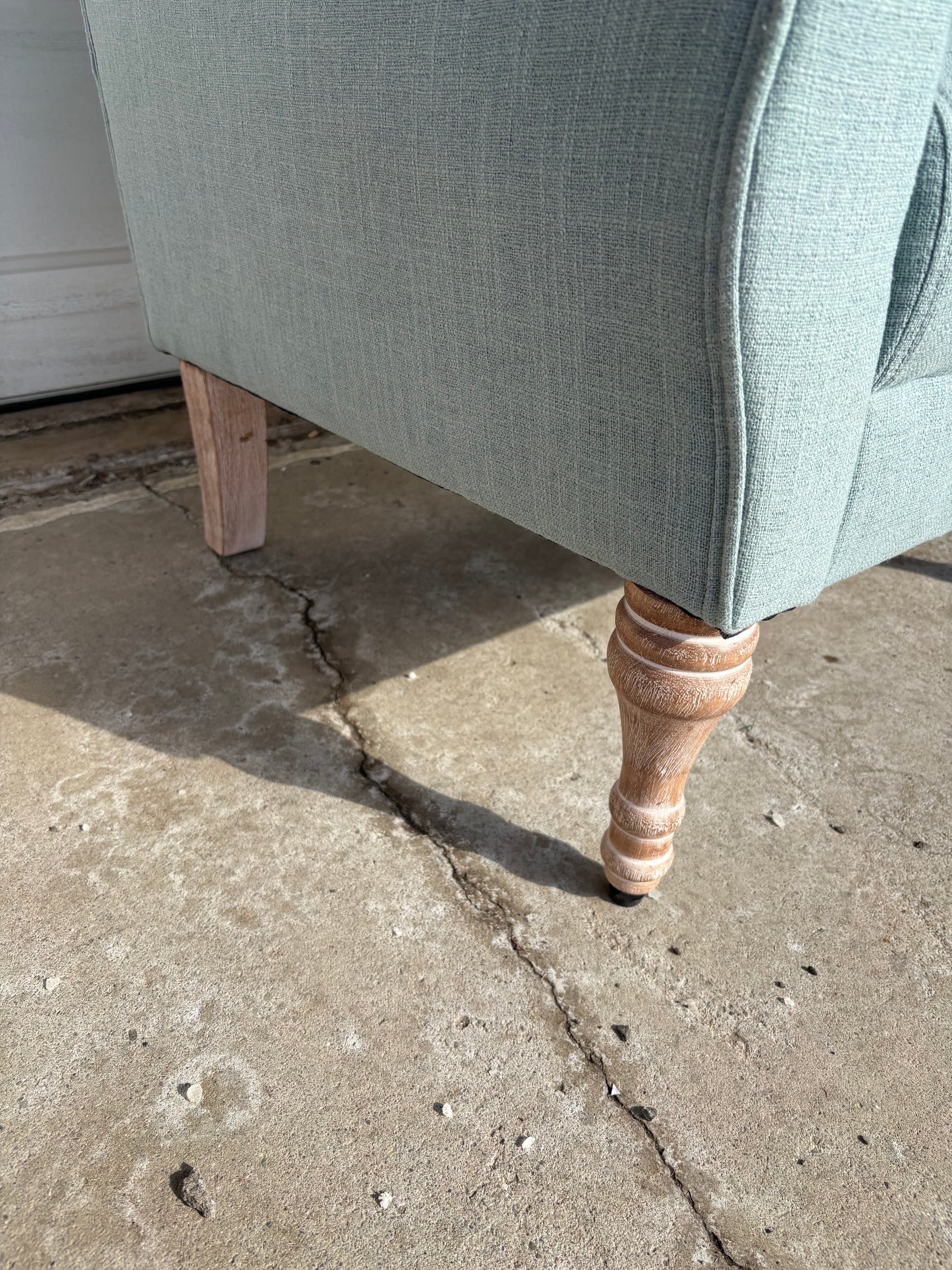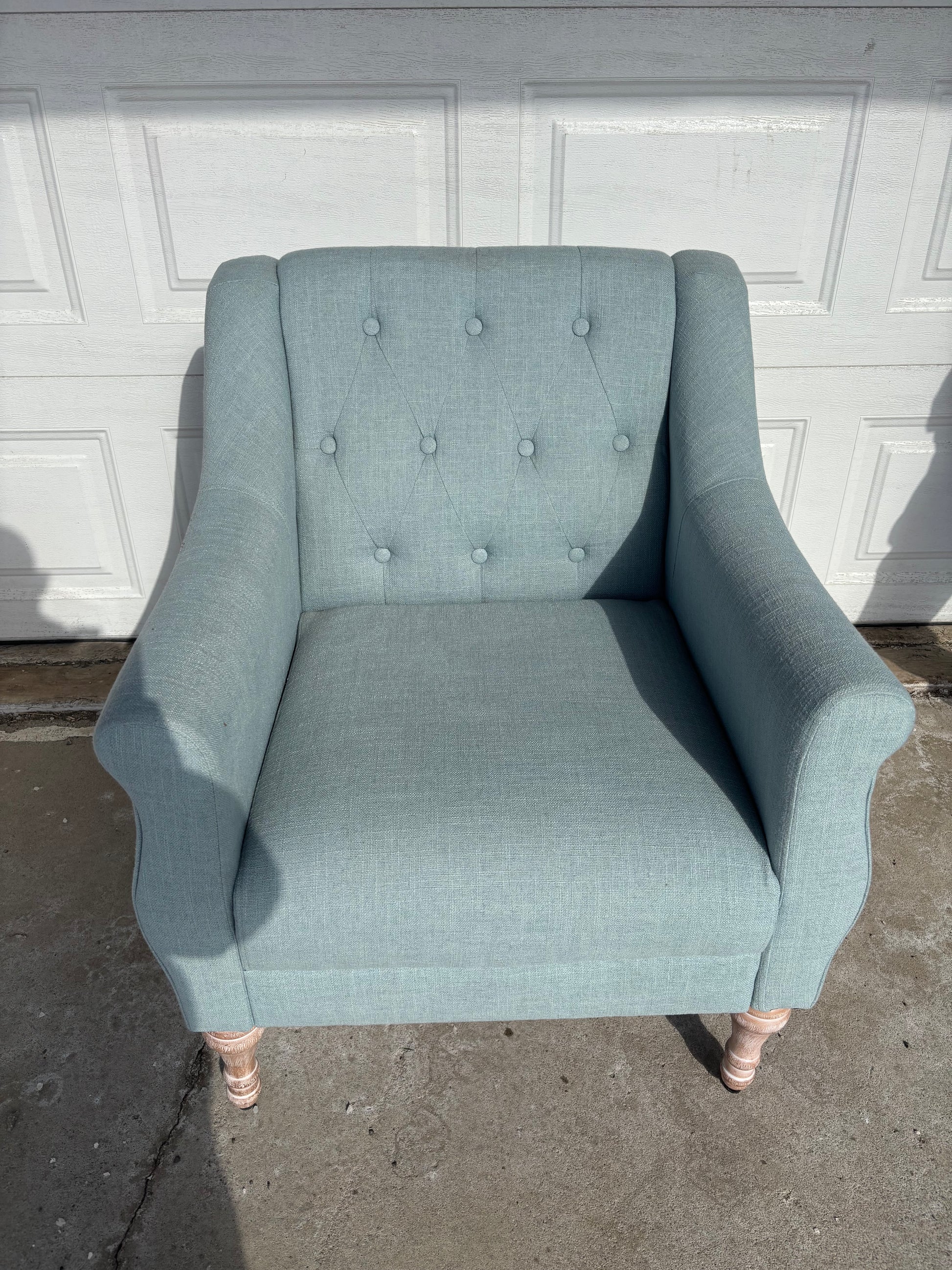 Light Blue Armchair. This light blue armchair is in great shape! It has a button ruffed back rest and wooden legs. Add this armchair to your bedroom or living room for a pop of colour. There are two available, sold separately.