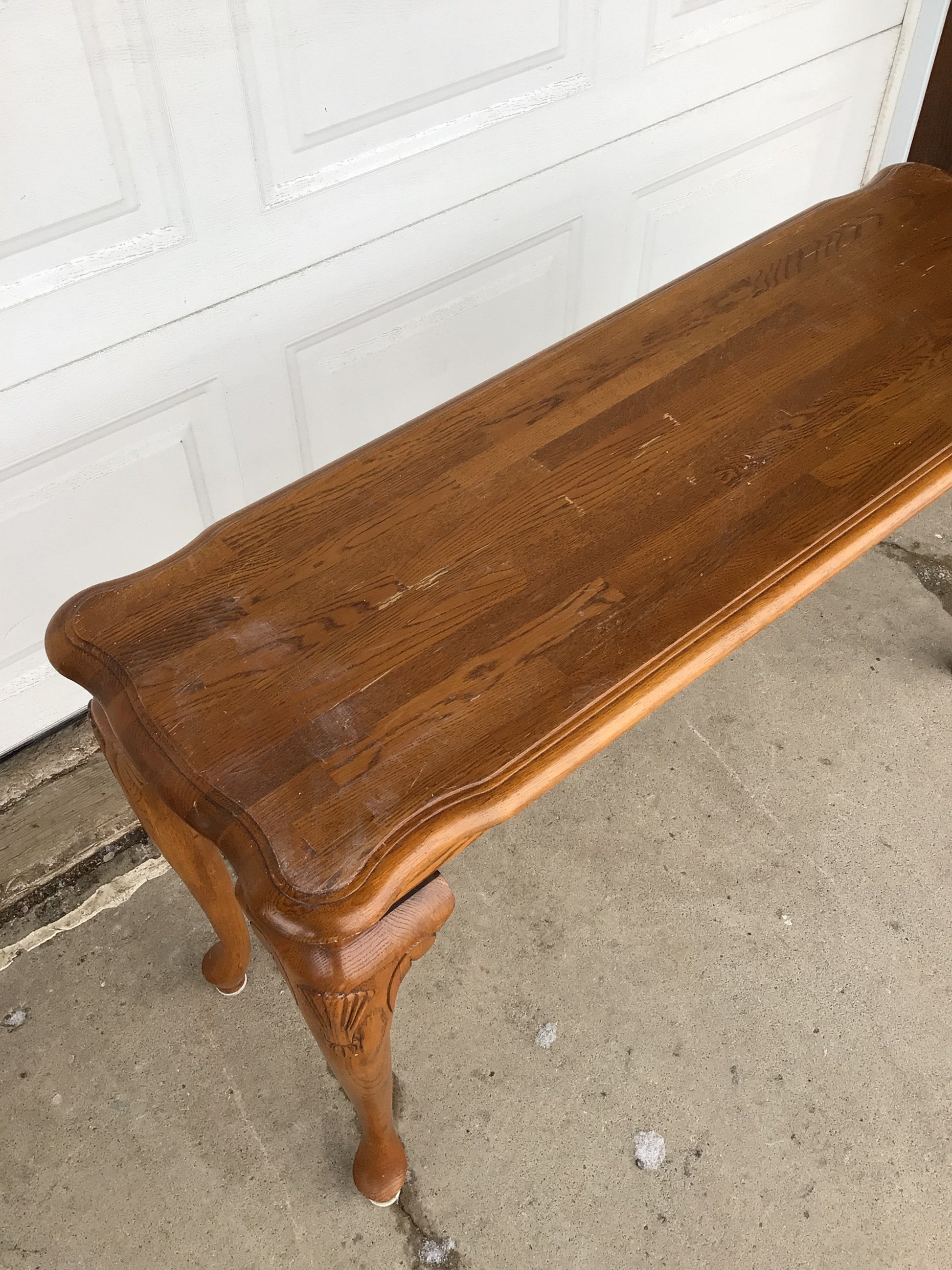 Long Hall Table. This wooden hall table could go in the entry way of your home, an empty hallway, or be put under a TV. In good condition, with marks on the table top.