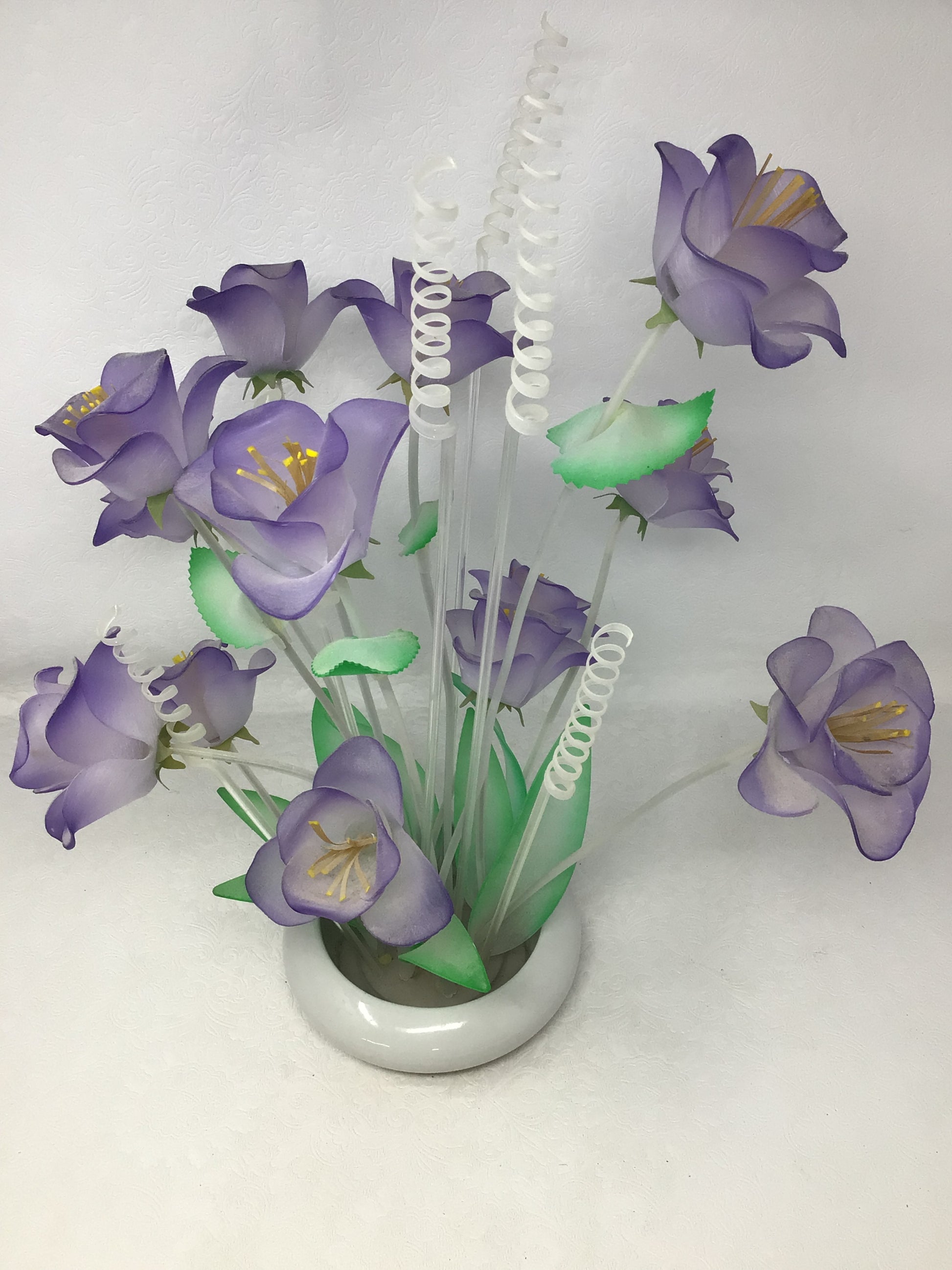 MCM artificial acrylic floral arrangement, featuring purple freesias like flowers, white sprigs and green leaves in a porcelain bowl