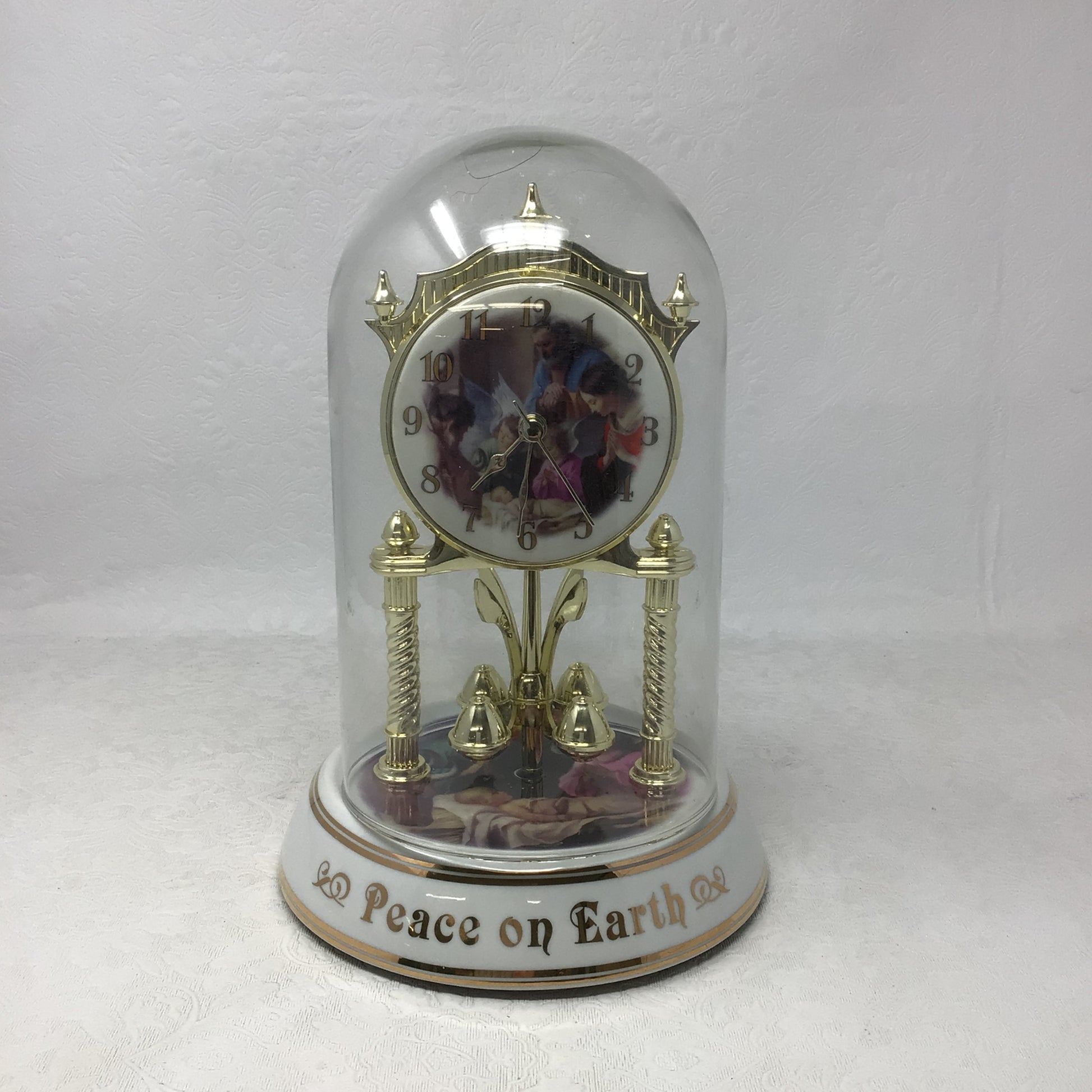 Peace on Earth Mantle Clock - This clock features a glass dome, gold-toned base and pillars. The face of the clock and the base feature a Christmas Nativity scene image and the phrase "Peace on Earth". It is battery powered with a rotating pendulum.