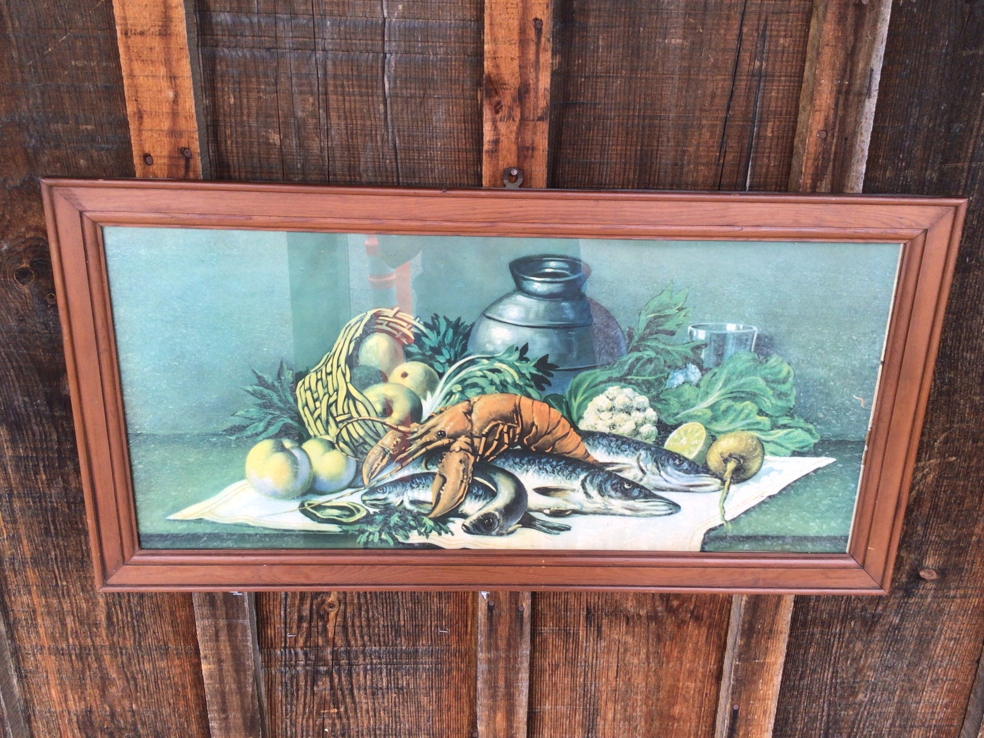 Piscatorial Still Life Oil Painting With Lobster. This lovely oil painting that includes fish and lobster with some other decorations, is a perfect fit wherever you choose to place it.