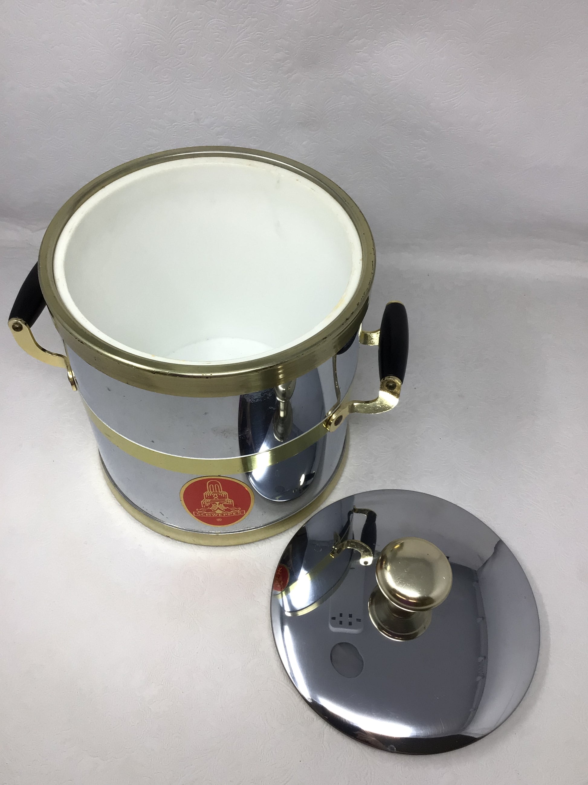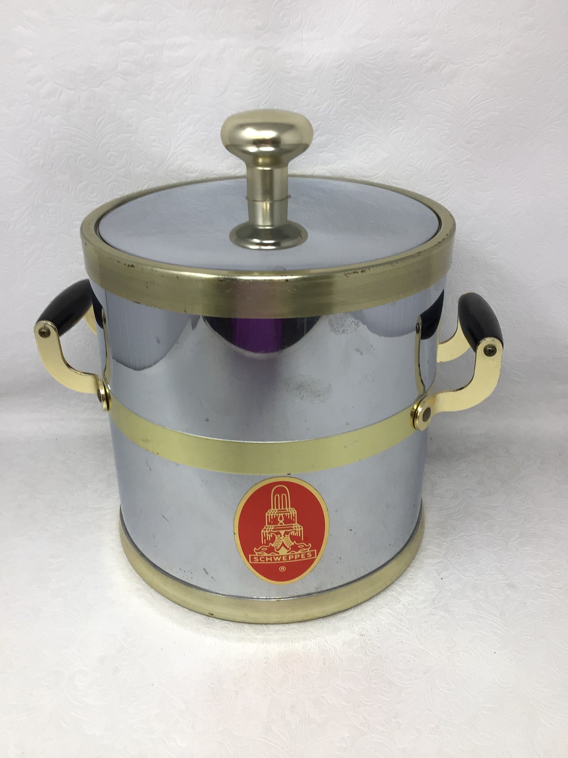 Vintage Kraftware "Schweppes" ice bucket with a chrome finish and gold trim, from the 1980s. This is great to have when hosting! In good condition, some marks from use. 10”H x 8”D.