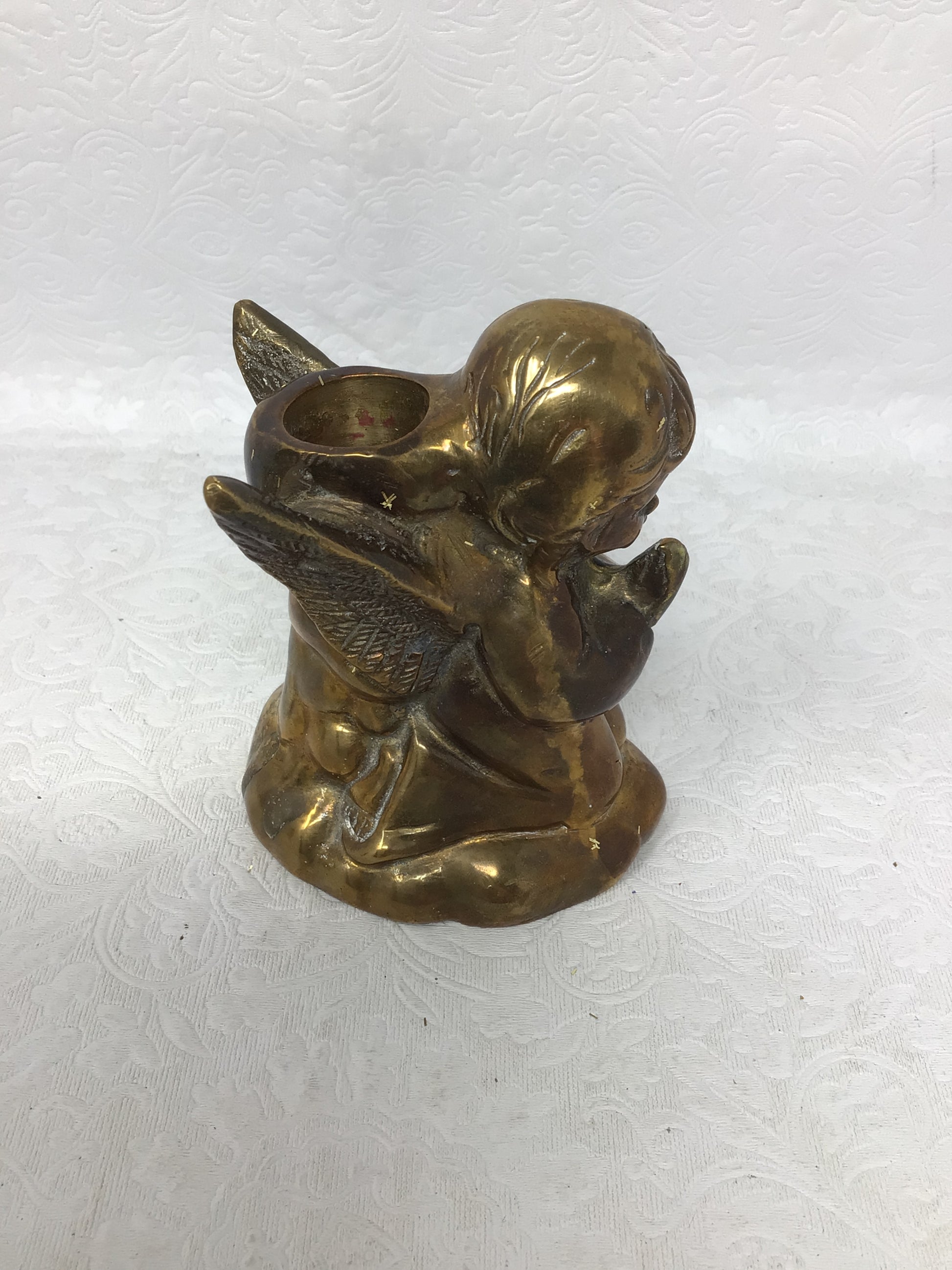 Set of 2 Brass Angel Taper Candle Holders. These candle holders are in the shape of angels. They would look great anywhere in your home. They are a bit tarnished as seen in the images.