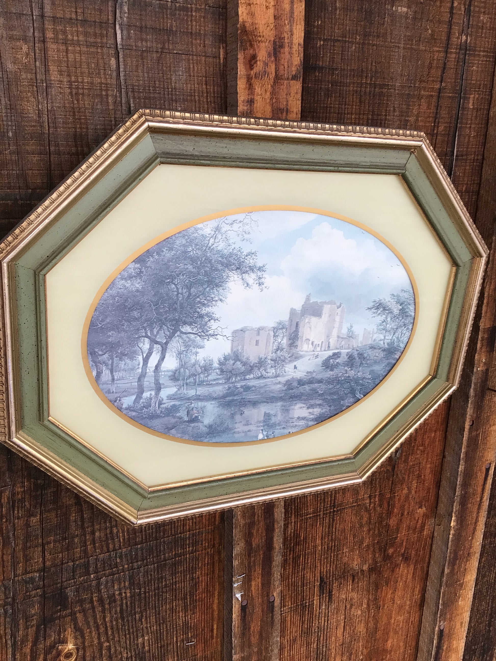 A lovely Set of 2 Vintage Prints in Octagonal Frames. These prints display a lovely landscape scene in a very unique octagonal blue toned frame. such unique pieces!