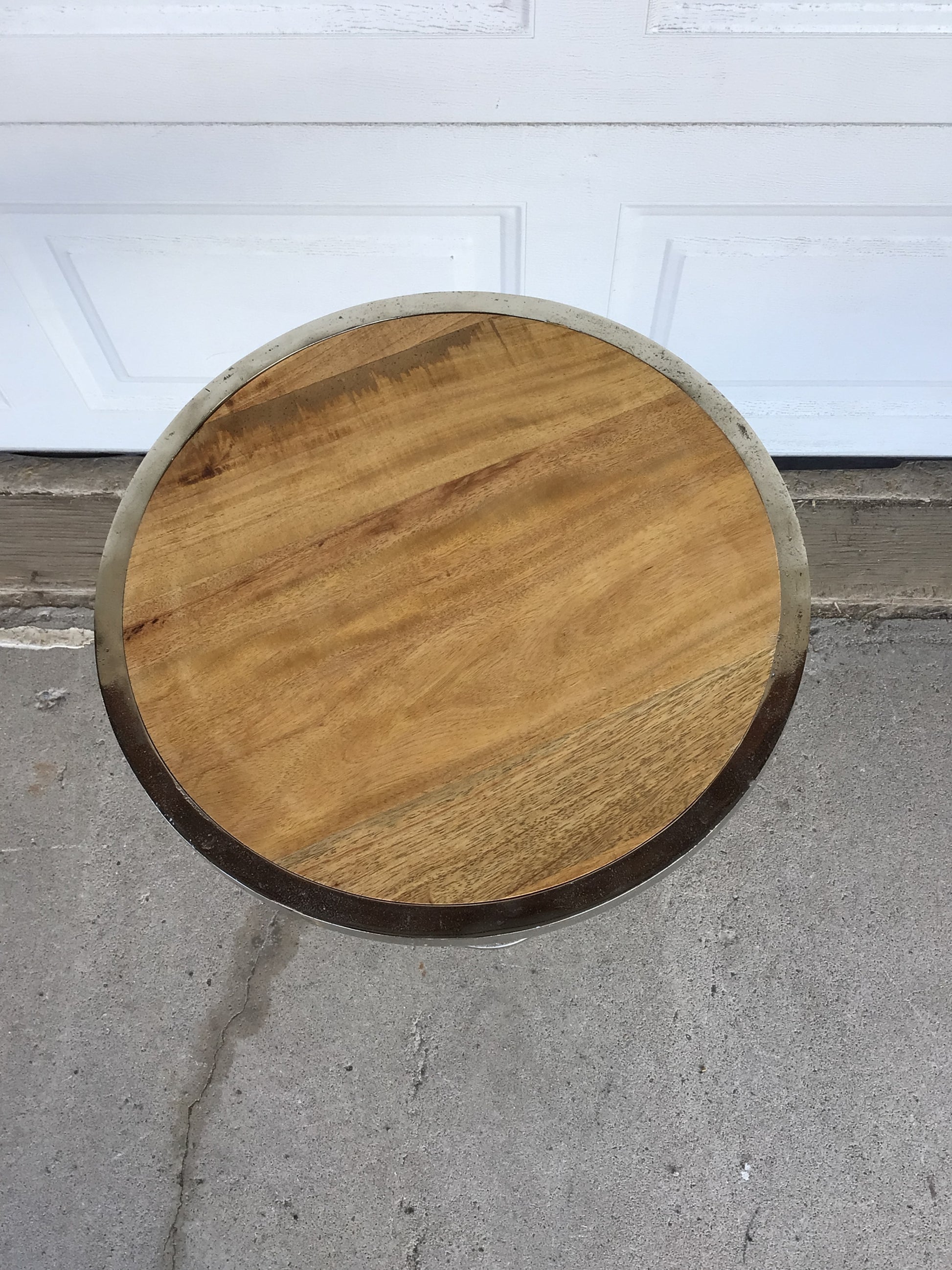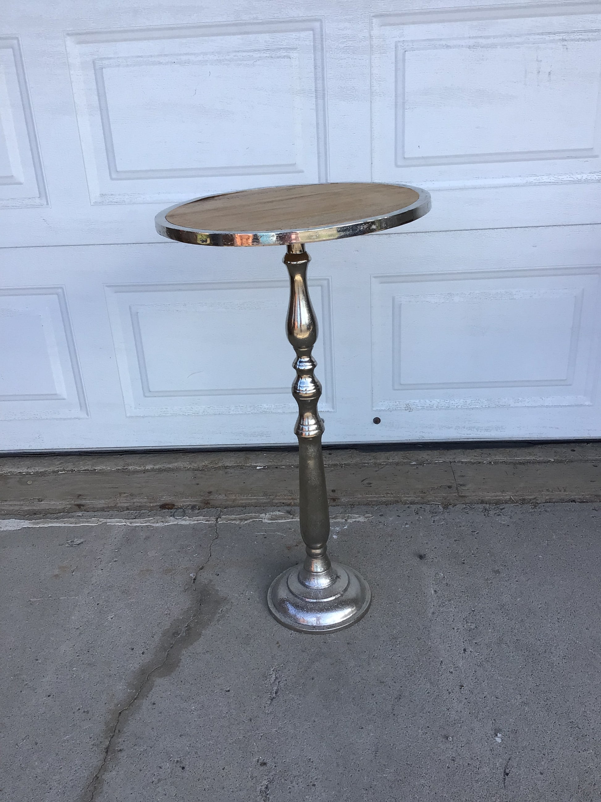 Silver round pedestal base table with wood top