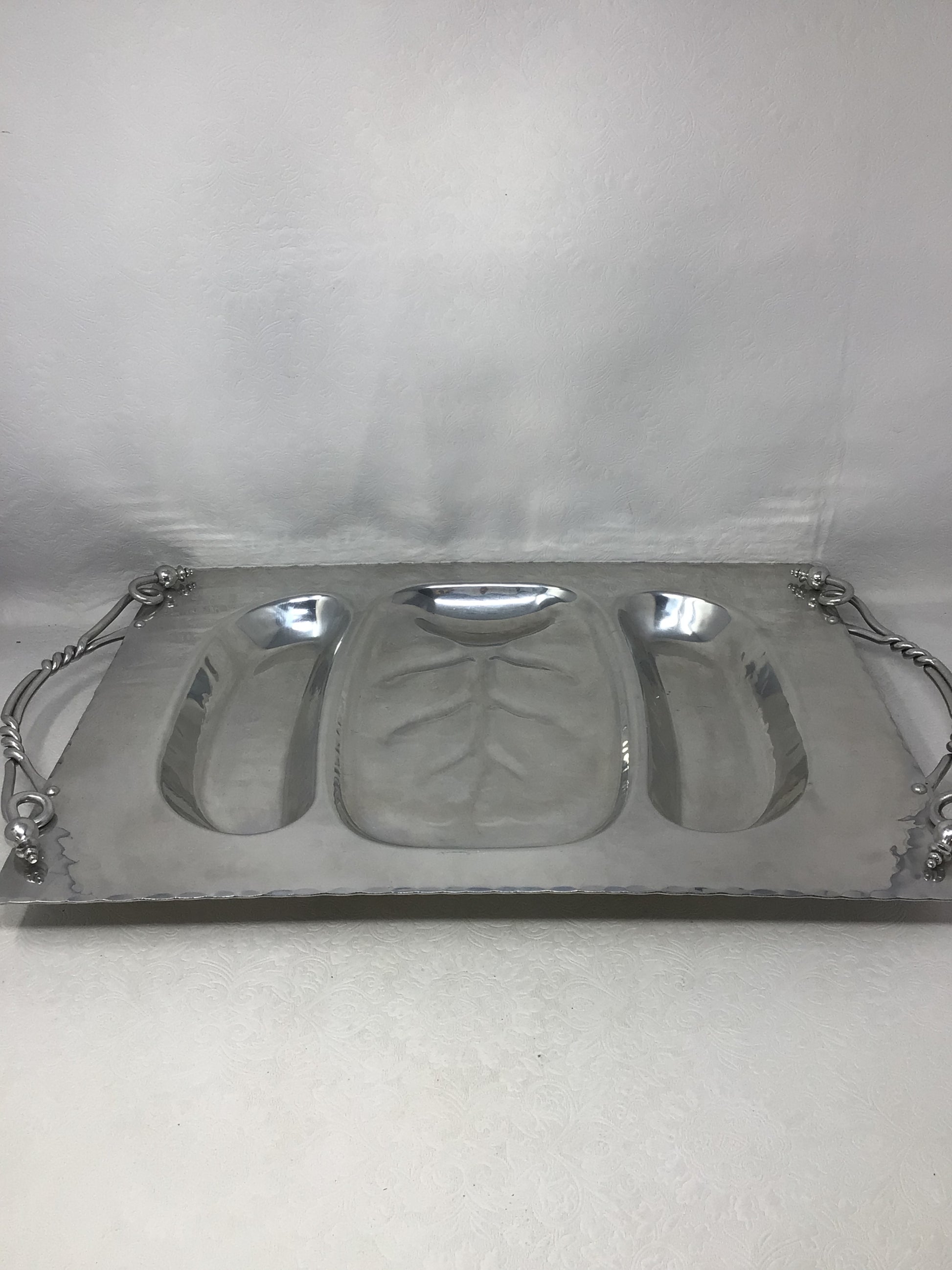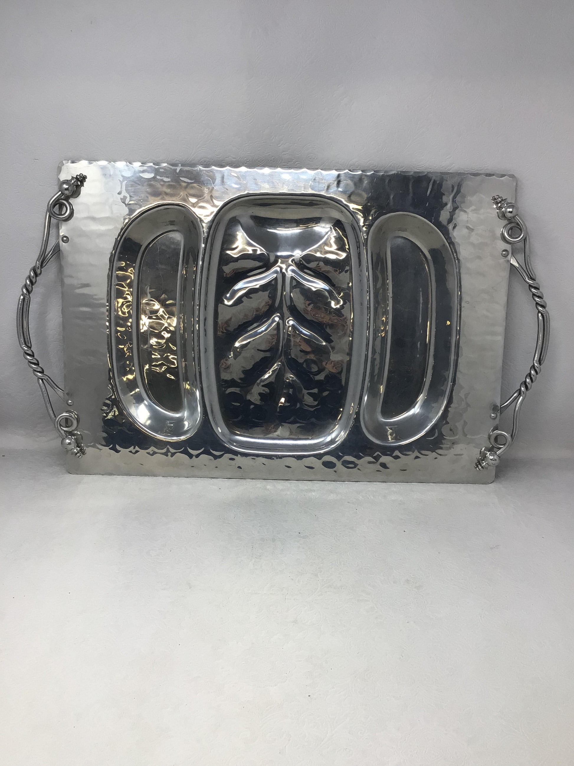 Silver Plated 3 Part Serving Tray. This serving tray has handles and 3 sections to hold food. It could also be displayed on a table and hold decor.
