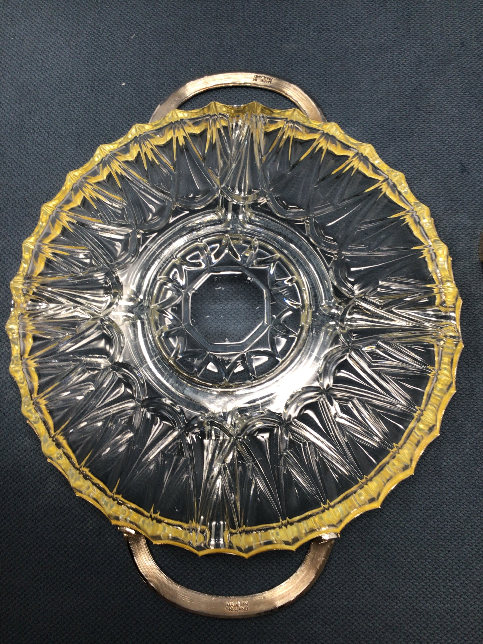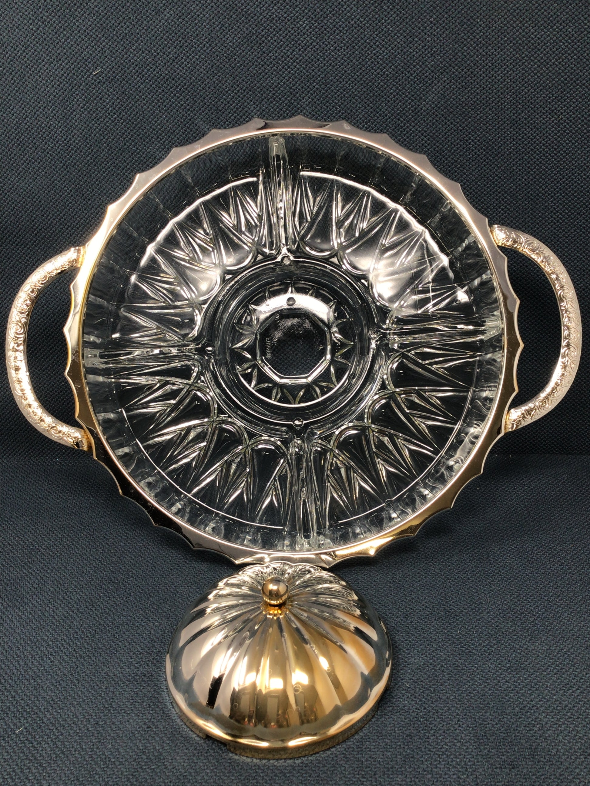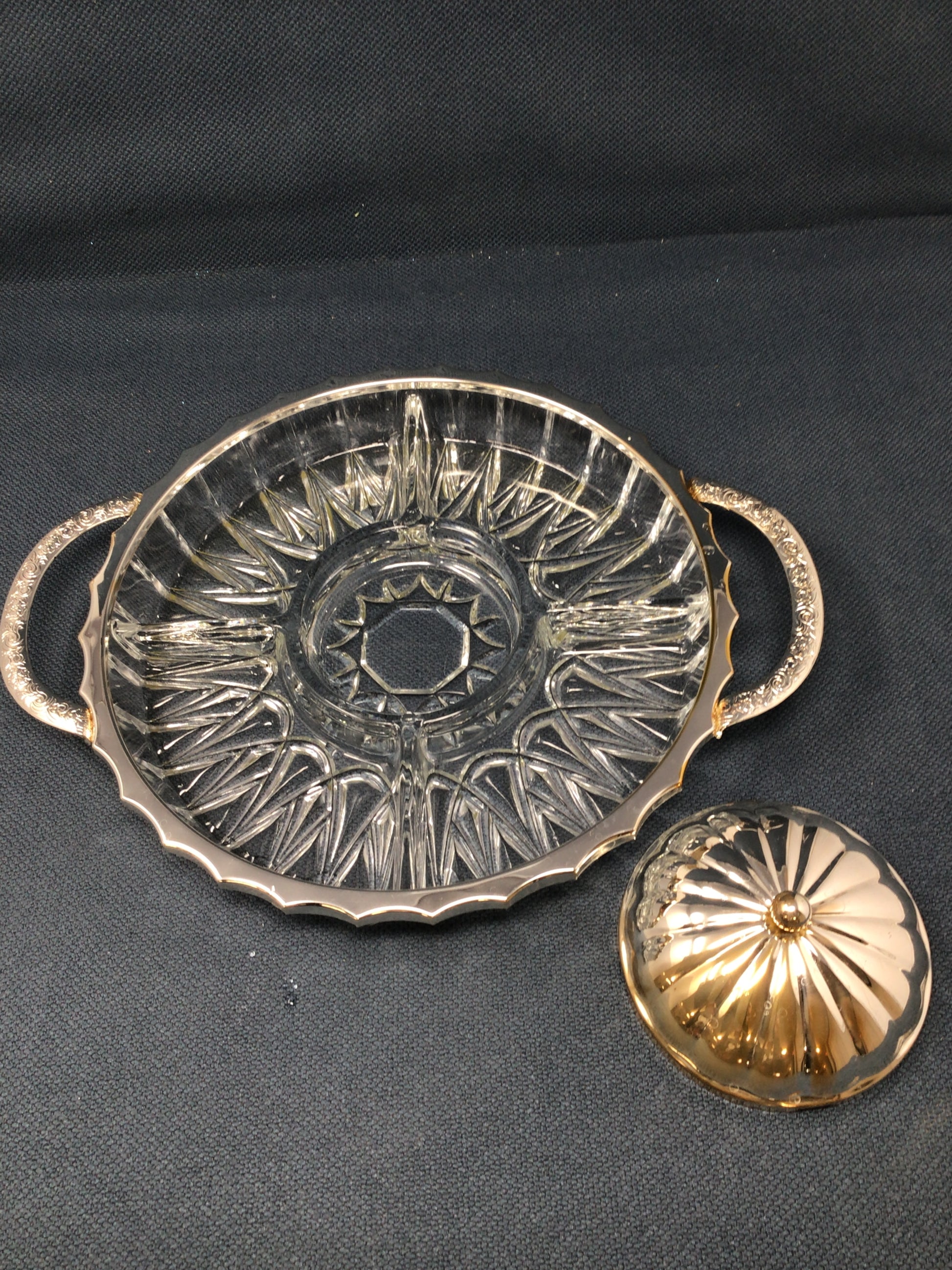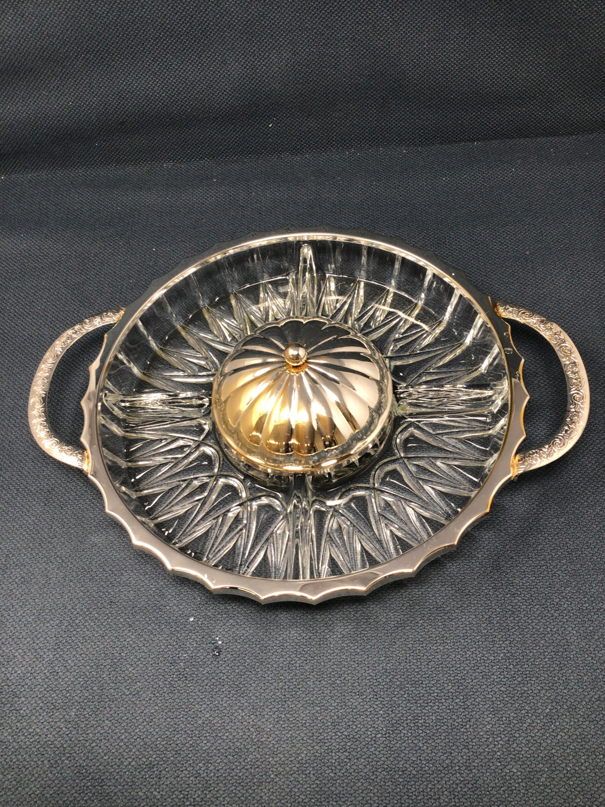 Vintage Queen Anne Silver Plated And Crystal Glass Serving Dish, often used for condiments or hours d’oevres. Decorative silver plated handles. Four sections with centre lidded compartment. Stamped France on the bottom of the dish and Made in England stamp on bottom of handles.