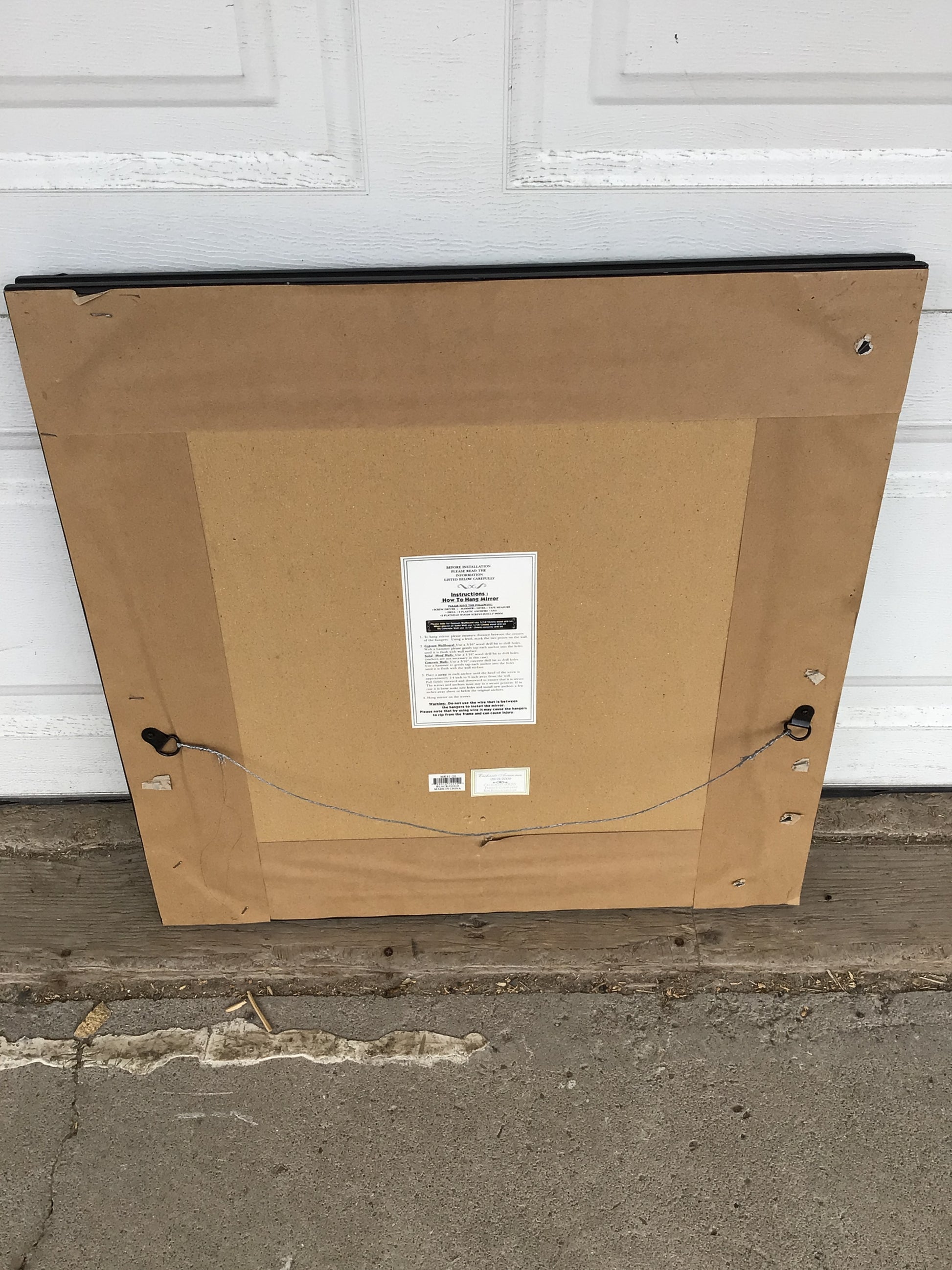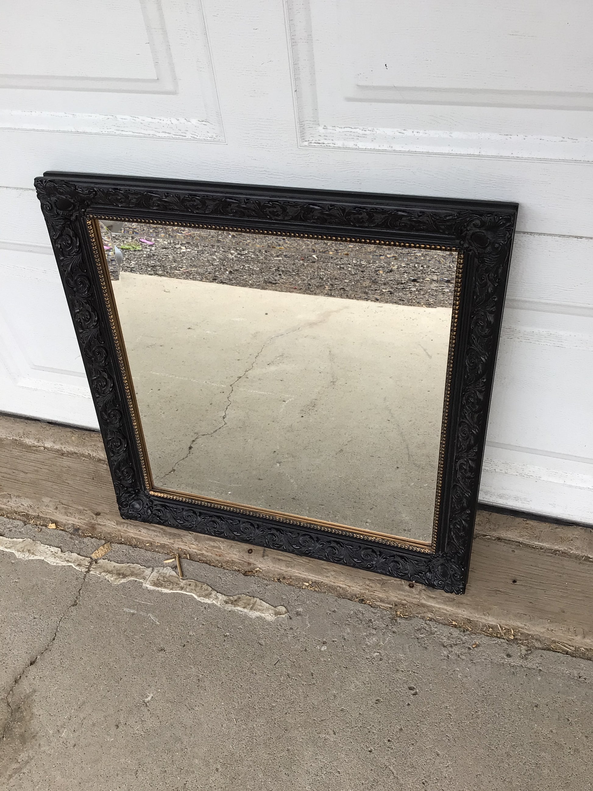 Square Black and Gold Mirror. This mirror has a black wooden frame with a design carved into it and has gold detailing. It would look great on any wall to open the space up. Comes ready to hang.
