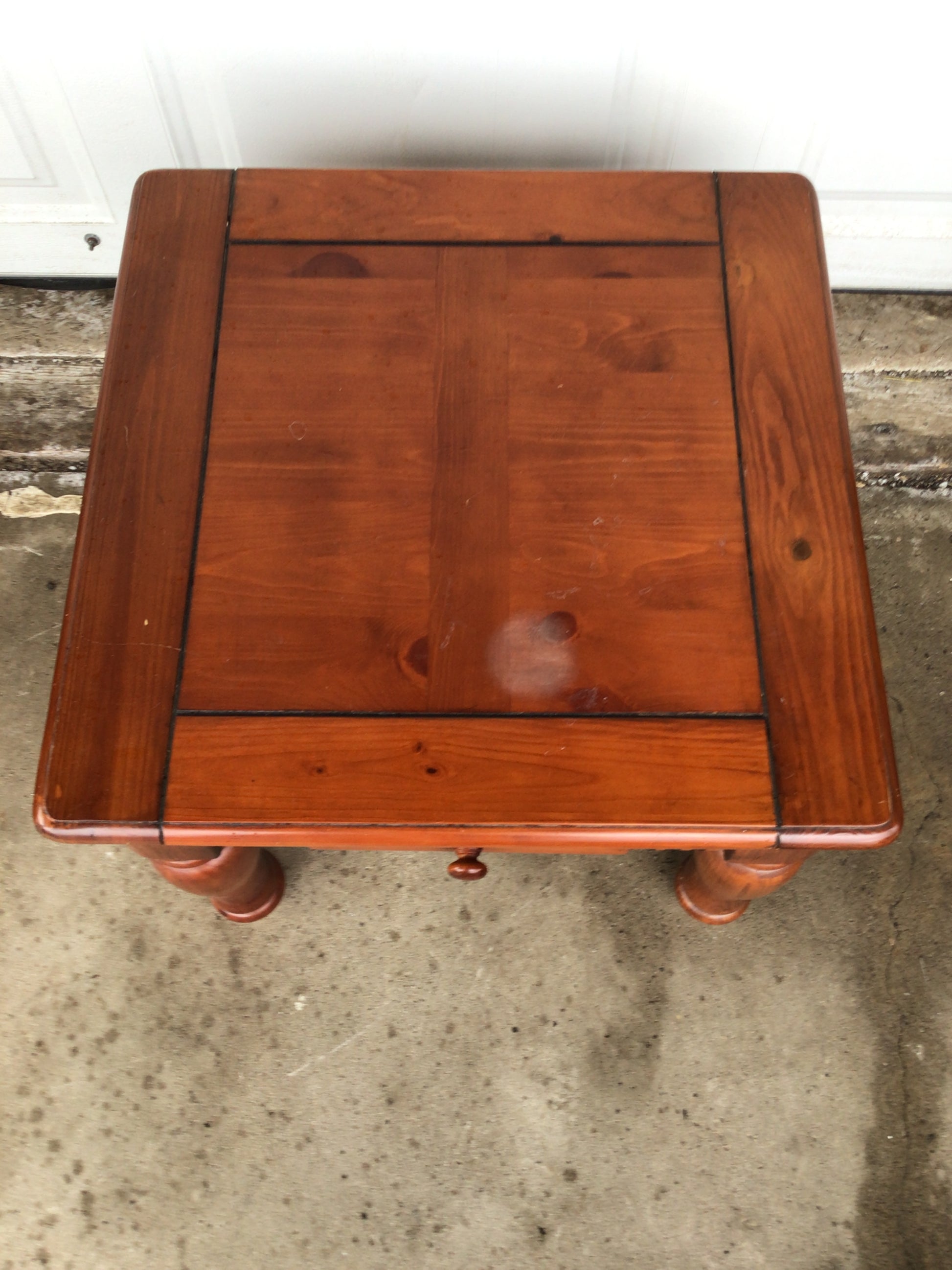 This is a small, traditional-style wood end table with a single drawer and carved legs. It could go in a bedroom or living room.