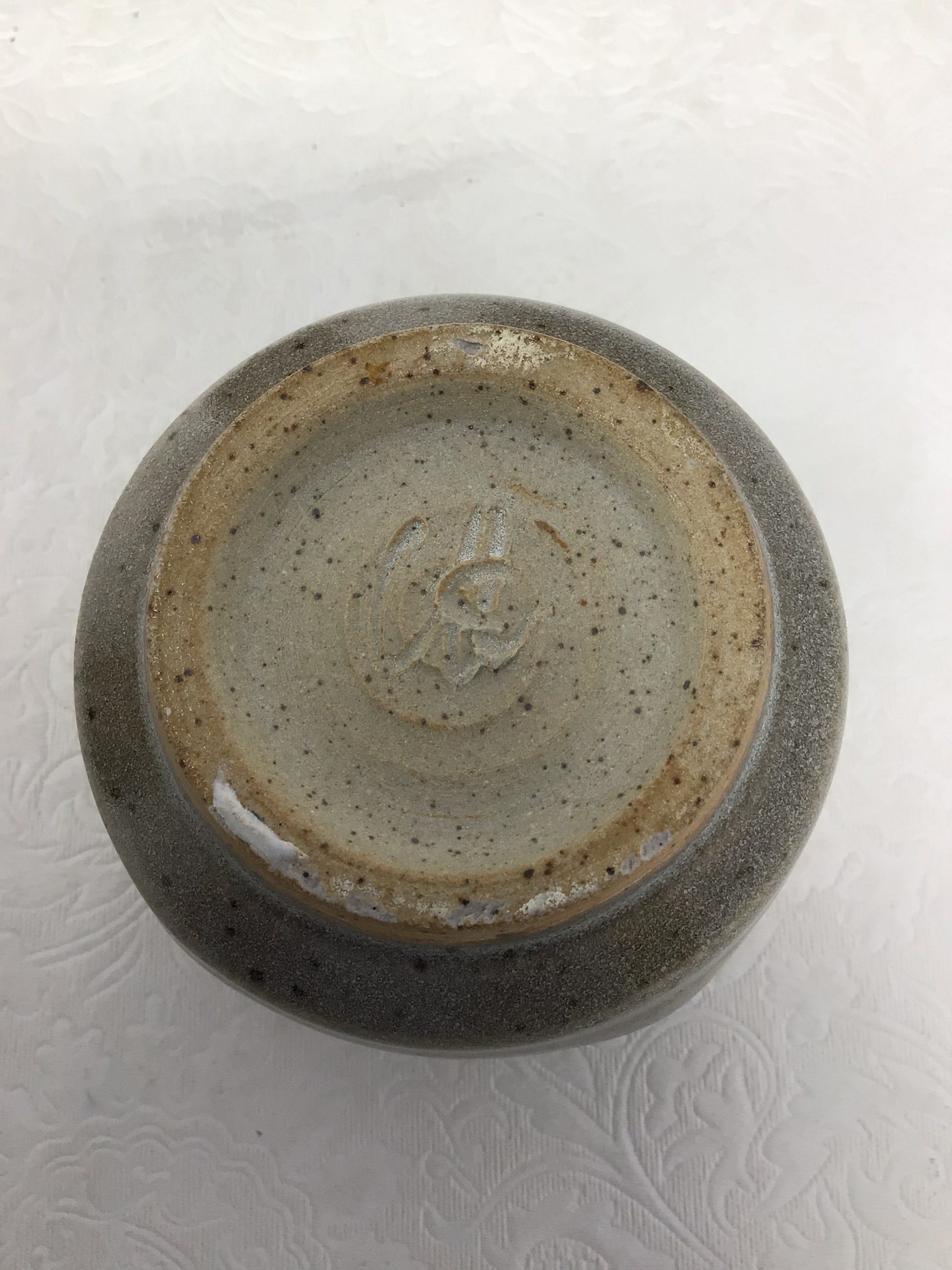 Pottery Teapot with Bamboo Handle and 4 Cups. The teapot has a rounded bamboo handle and there are four matching cups. This is a lovely set to have, and it’s in good condition.