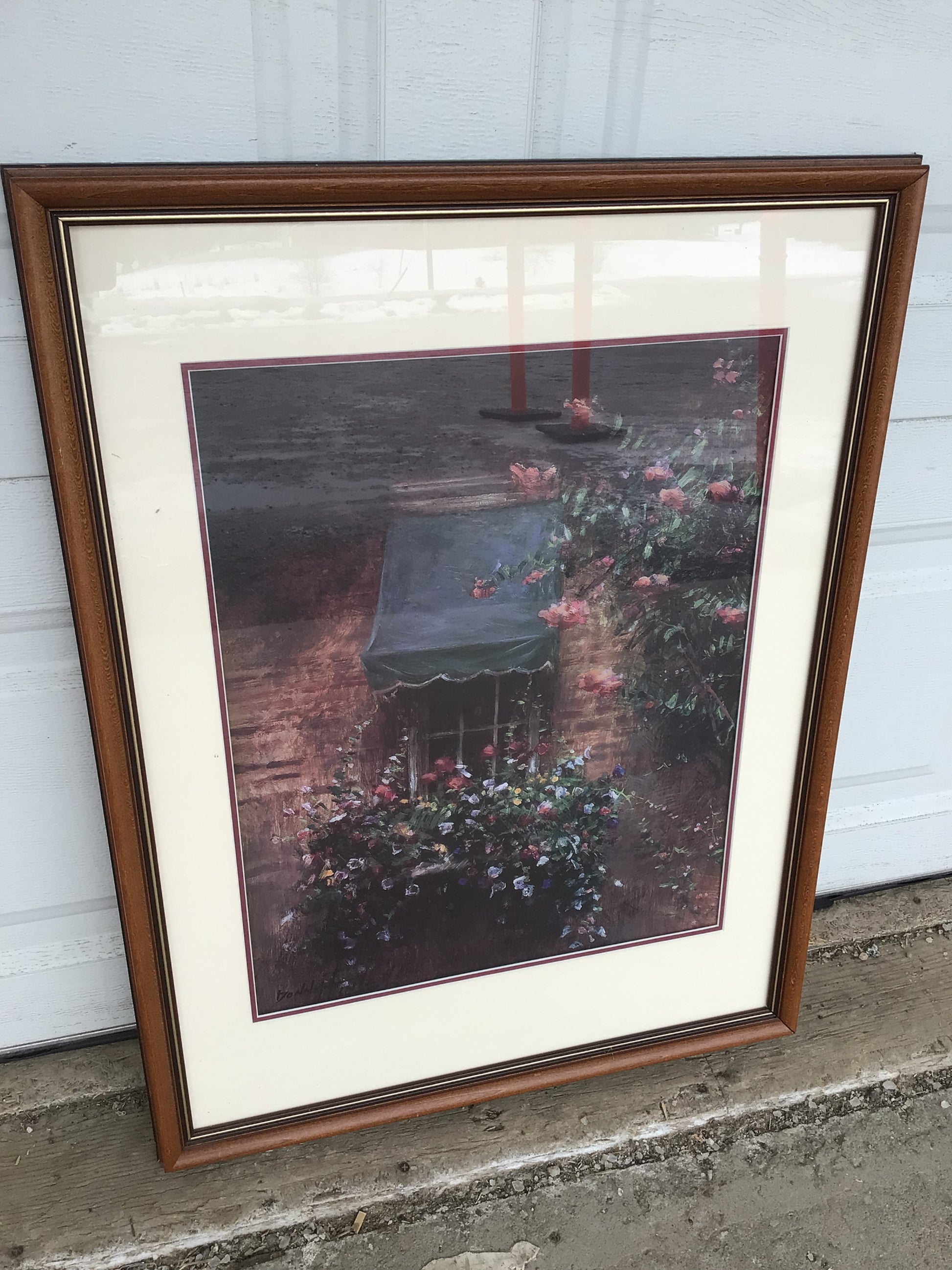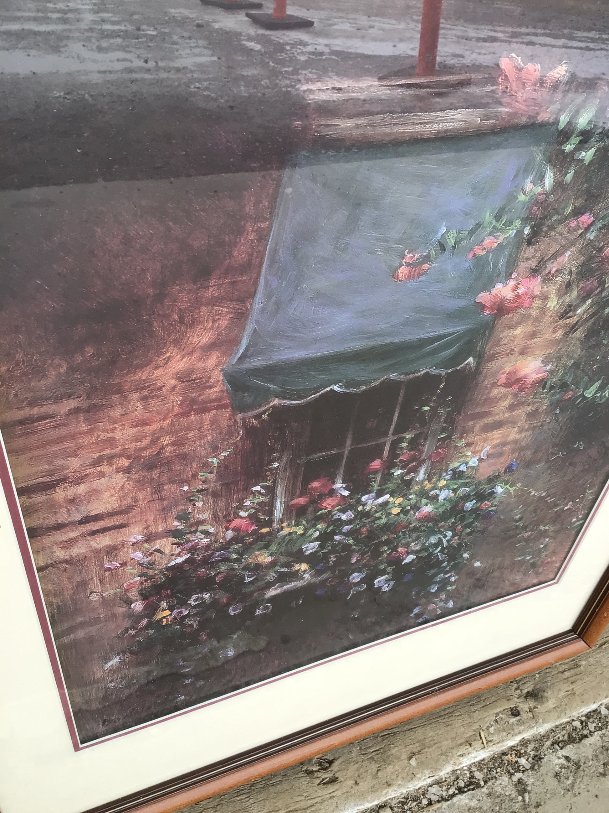 This framed and matted Art piece titled “Teal Canopy” by Donna Finley is lovely depiction of a window with a teal awning surrounded by flowers. A lovely piece to own.