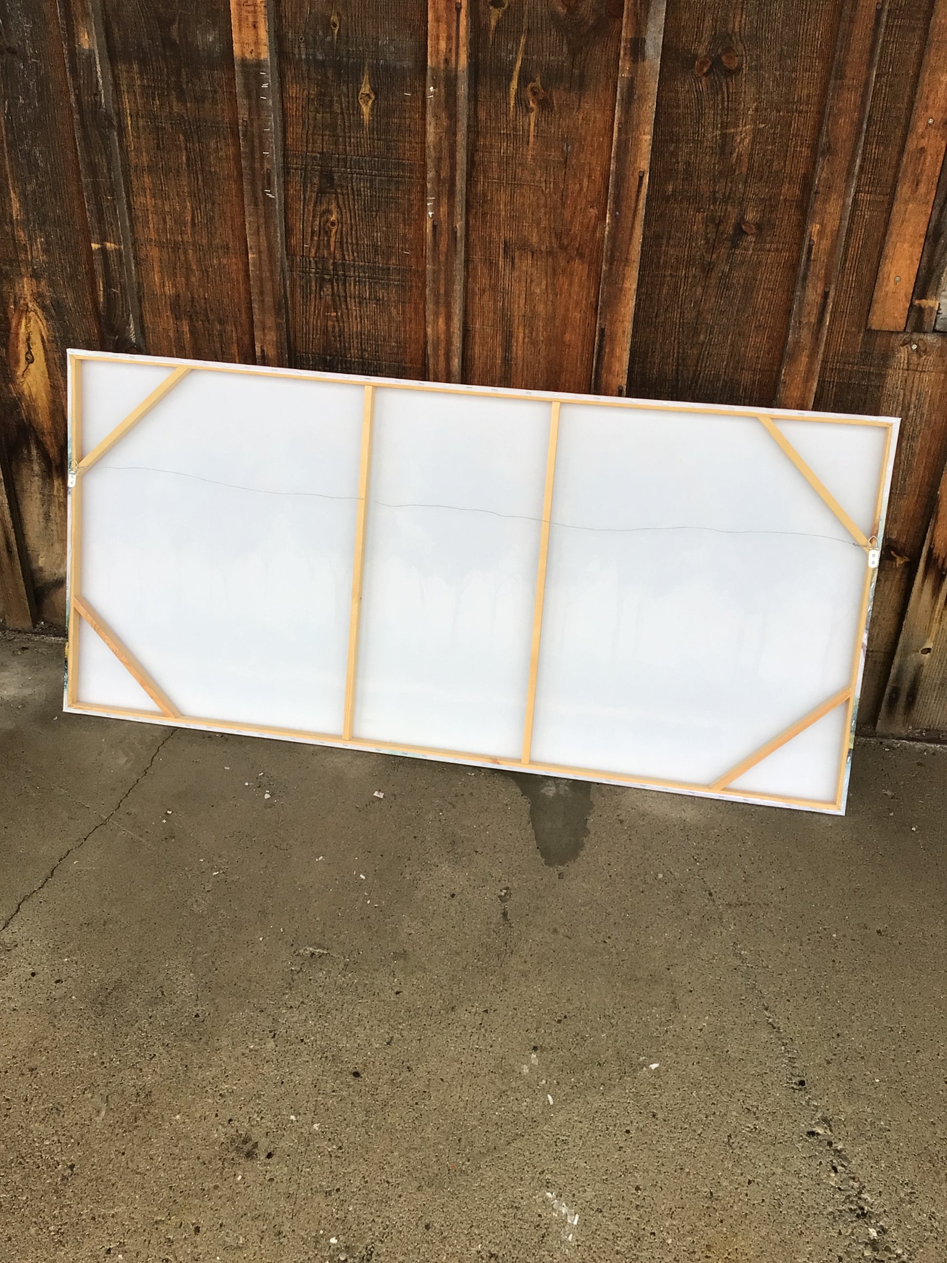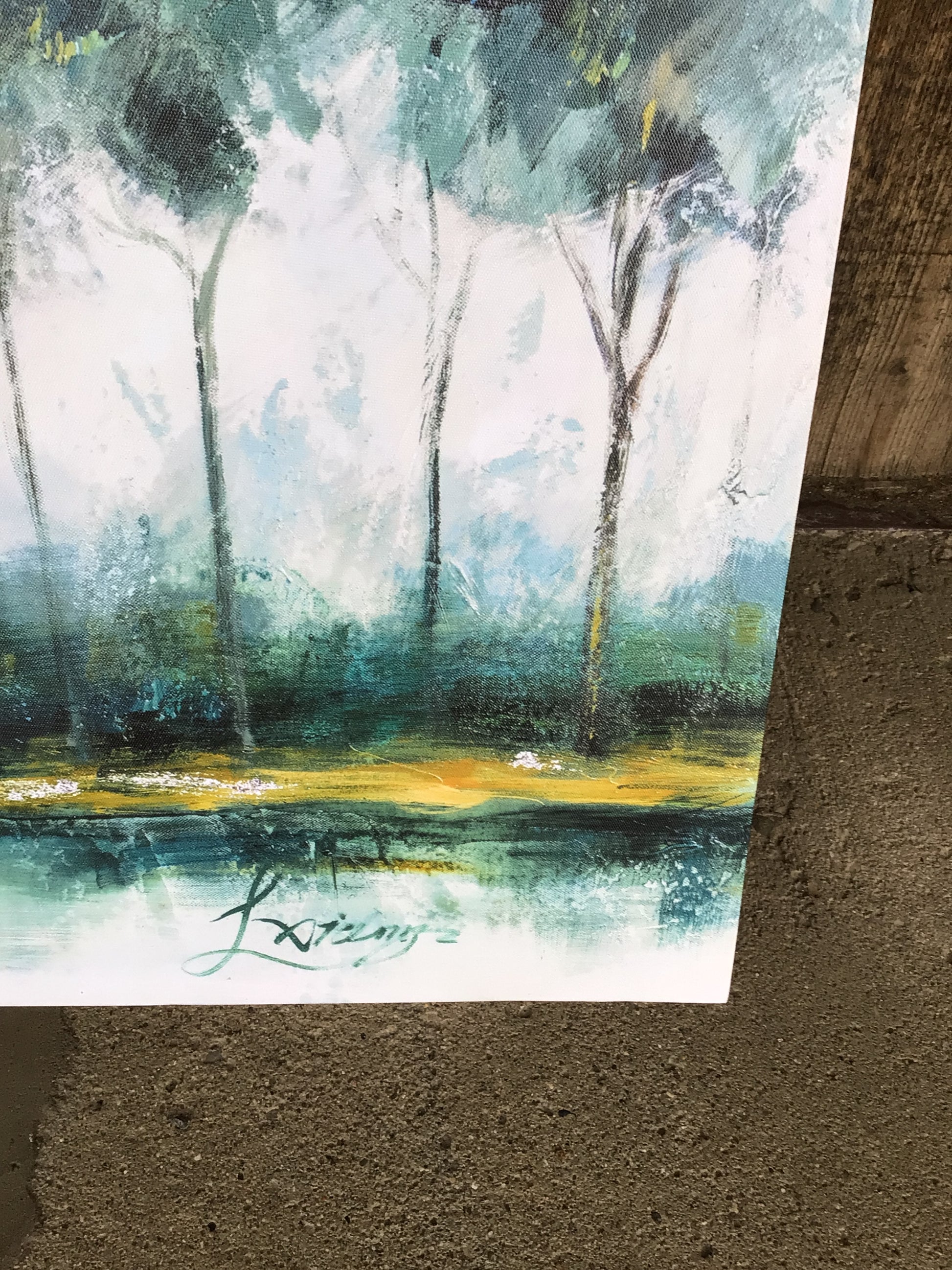 Teal Forest Canvas Artwork. This long canvas has teal coloured trees on it. This art piece would look great above a couch! In good condition.