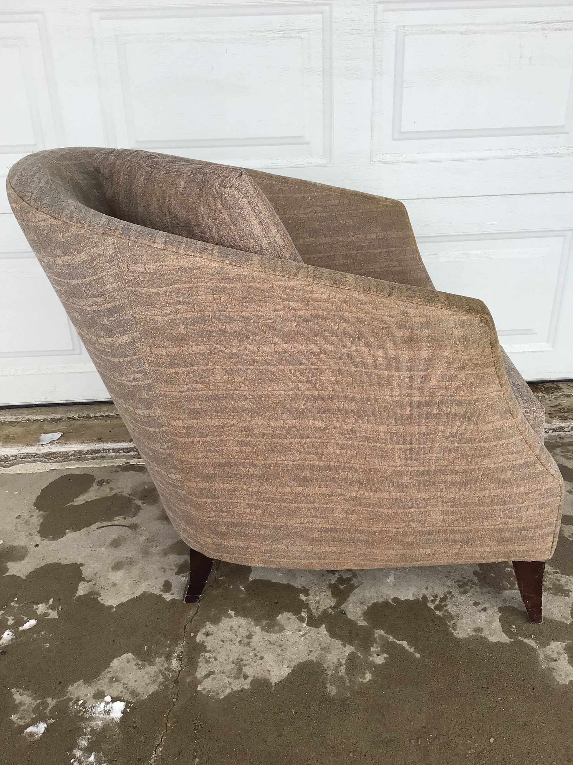 Barrel Chair - Contemporary taupe coloured barrel accent chair with coordinating throw pillow and dark wood legs.