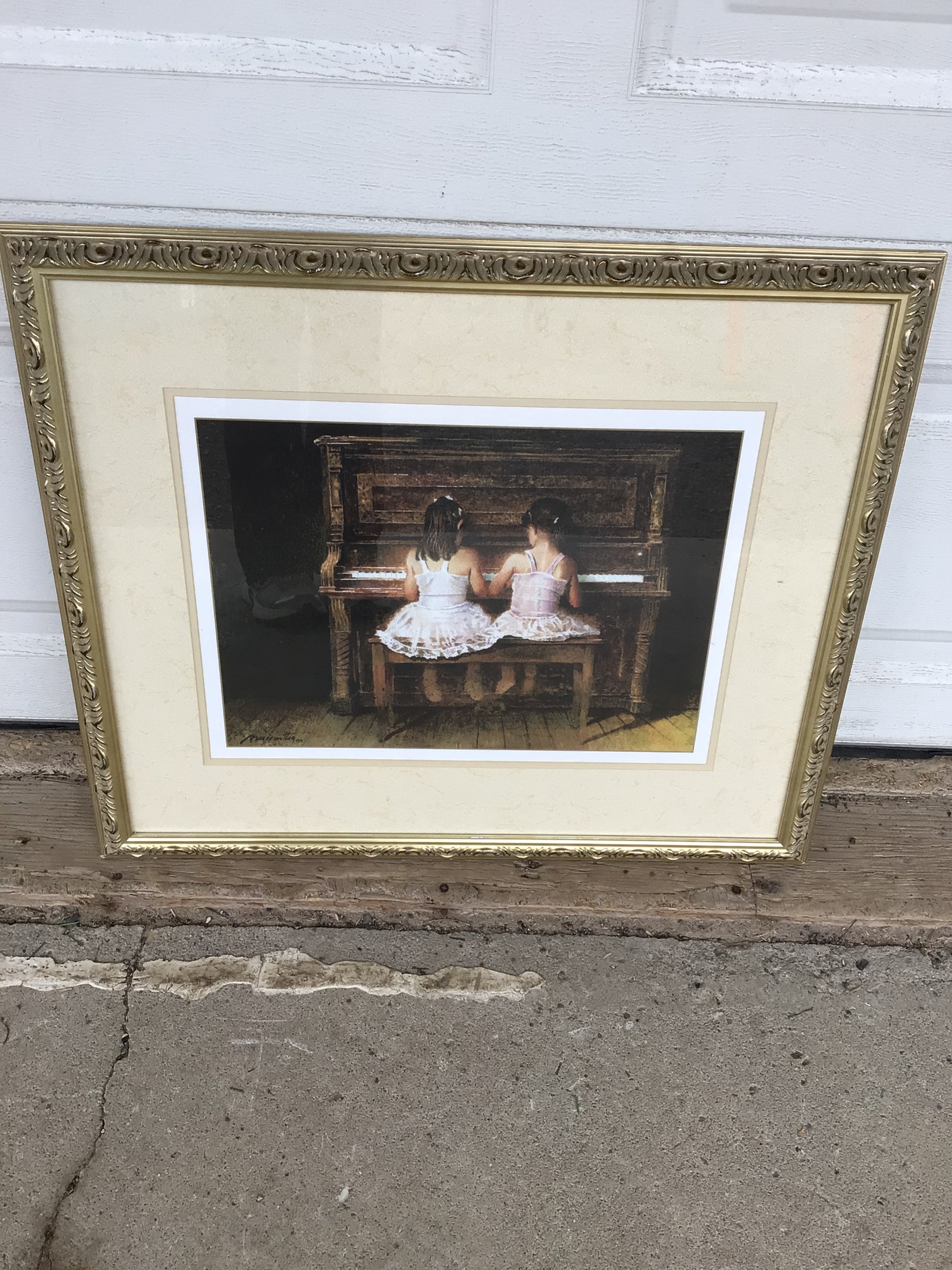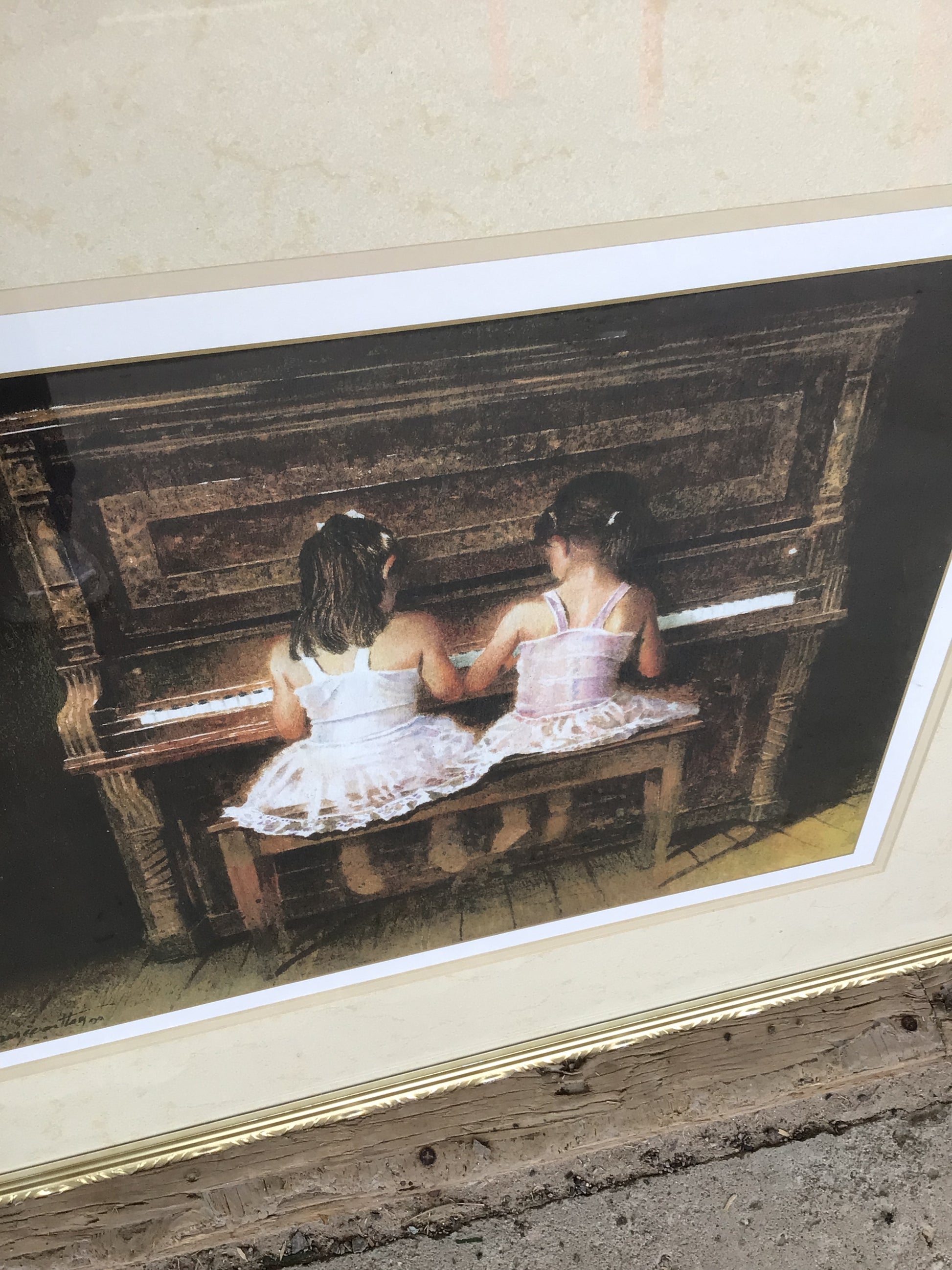“Dress Rehearsal" by Greg Olsen. This art piece is in a beautiful gold frame that comes ready to hang. The art piece shows two young girls playing the piano.