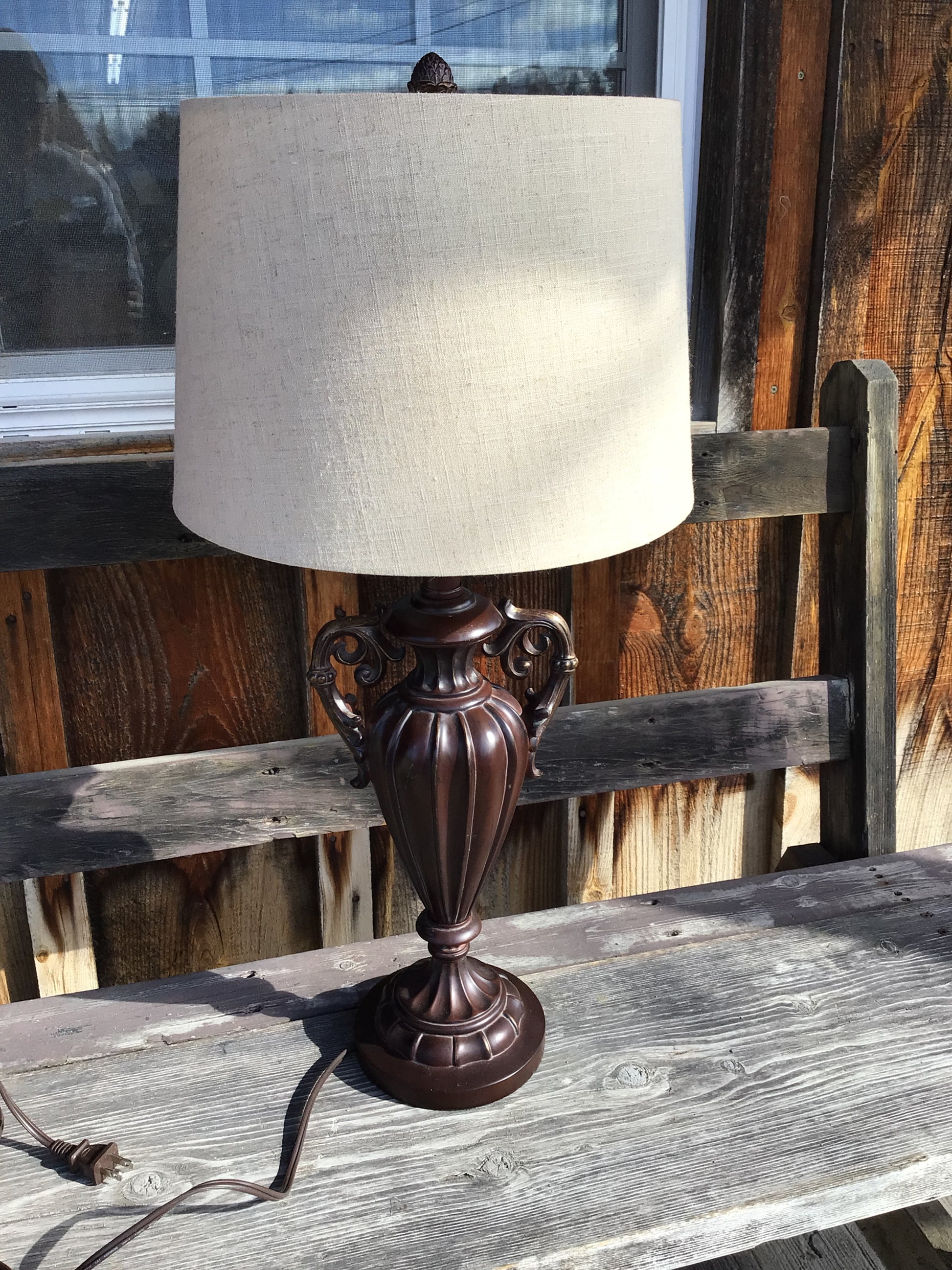 Urn Shaped Table Lamp. This lamp base is brown and in an urn shape with a beige lamp shade. It would look great in your living room. The lamp has been tested and works.