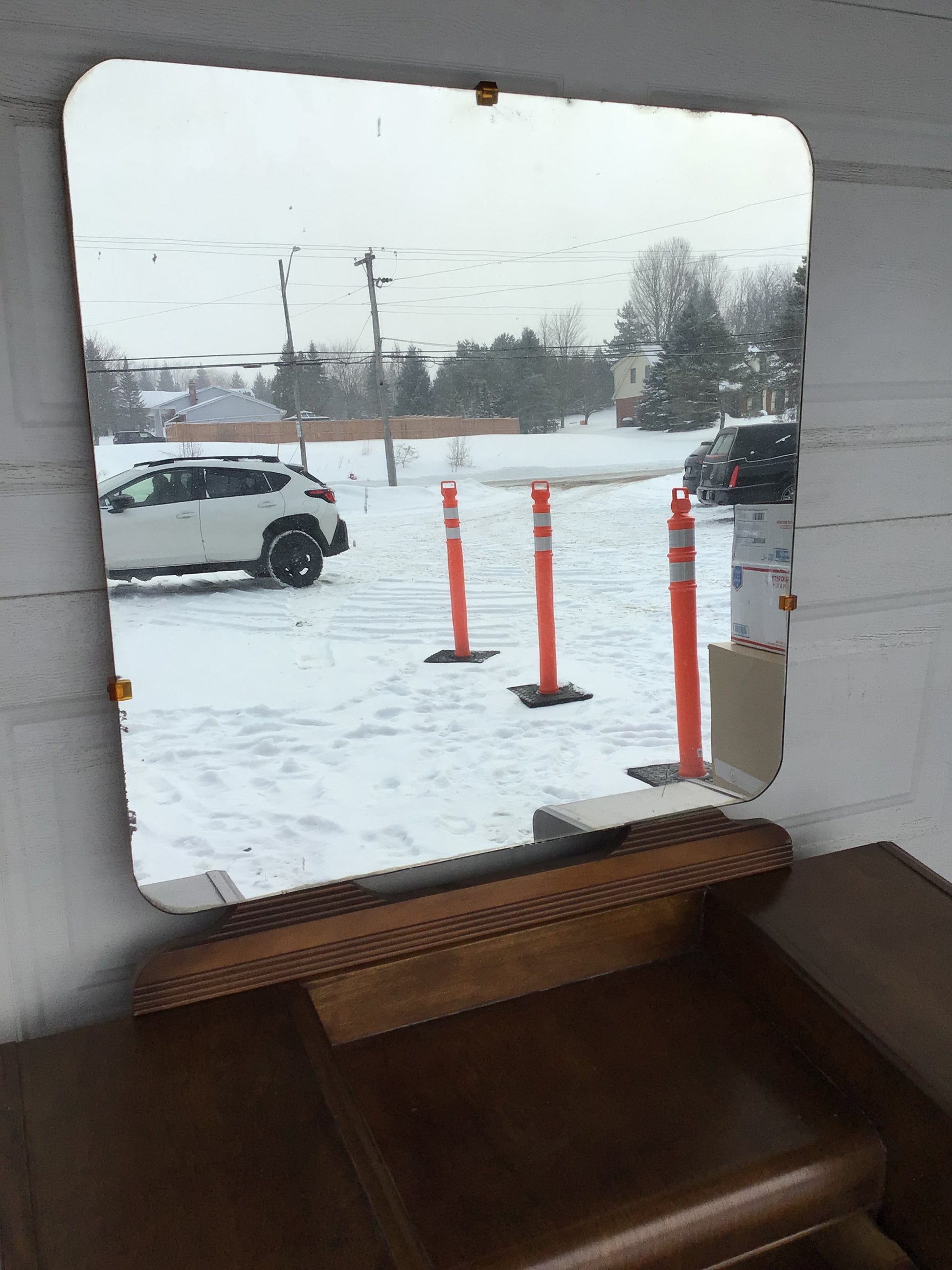 Art Deco Vanity Table - Antique Art Deco waterfall vanity with a mirror. Typically features hardwood construction with maple or walnut veneer. The style known as "waterfall" is characterized by its curved edges and rounded front. Vanities like this were popular in the 1940's.