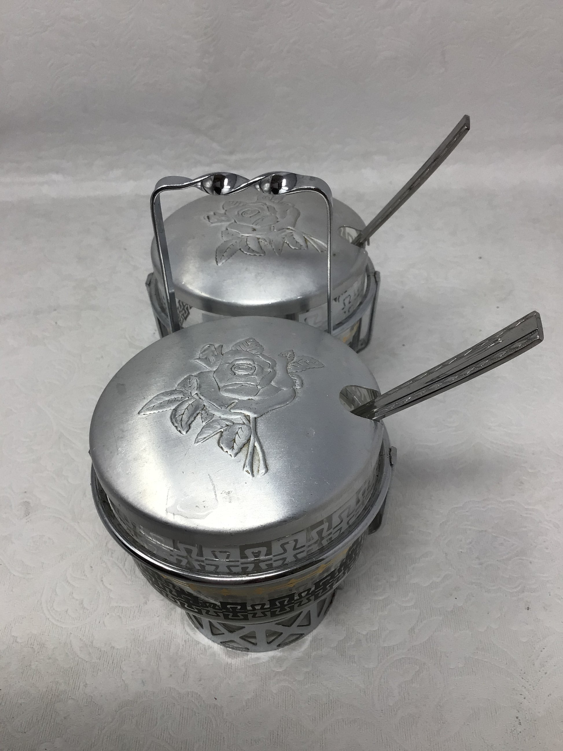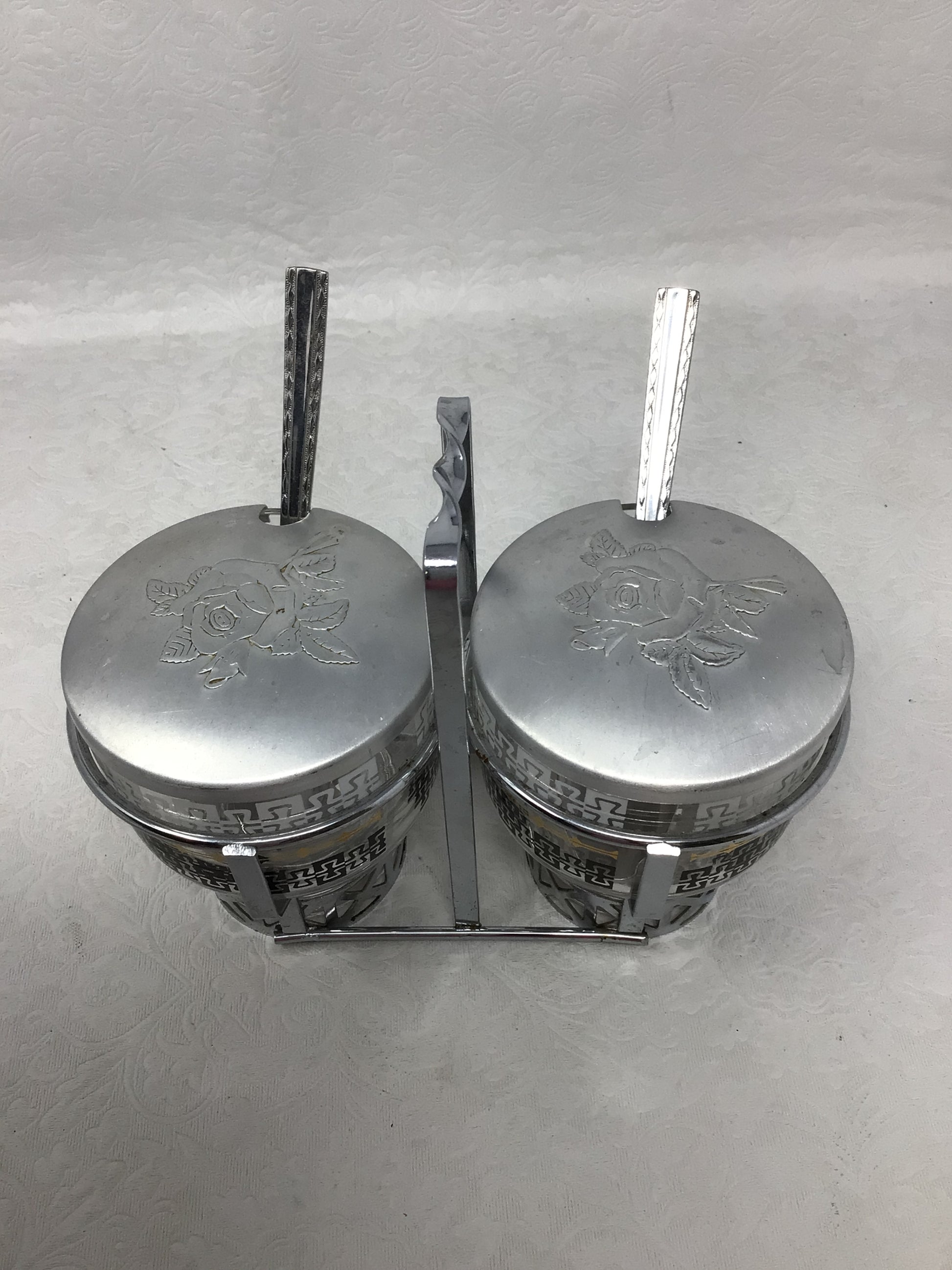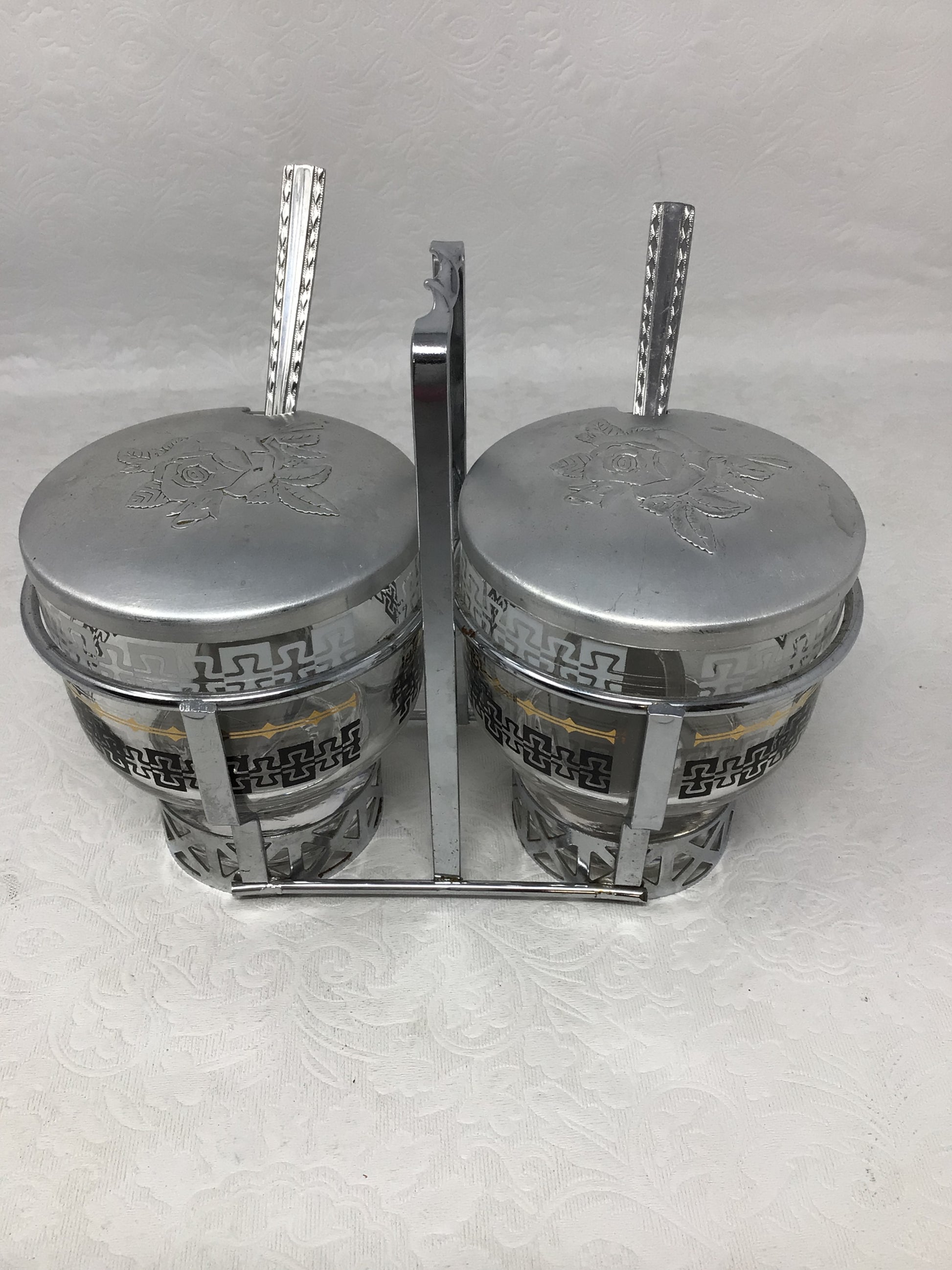 Vintage Libbey Glass Condiment Server Set with Metal Caddy. 5” x 6”.