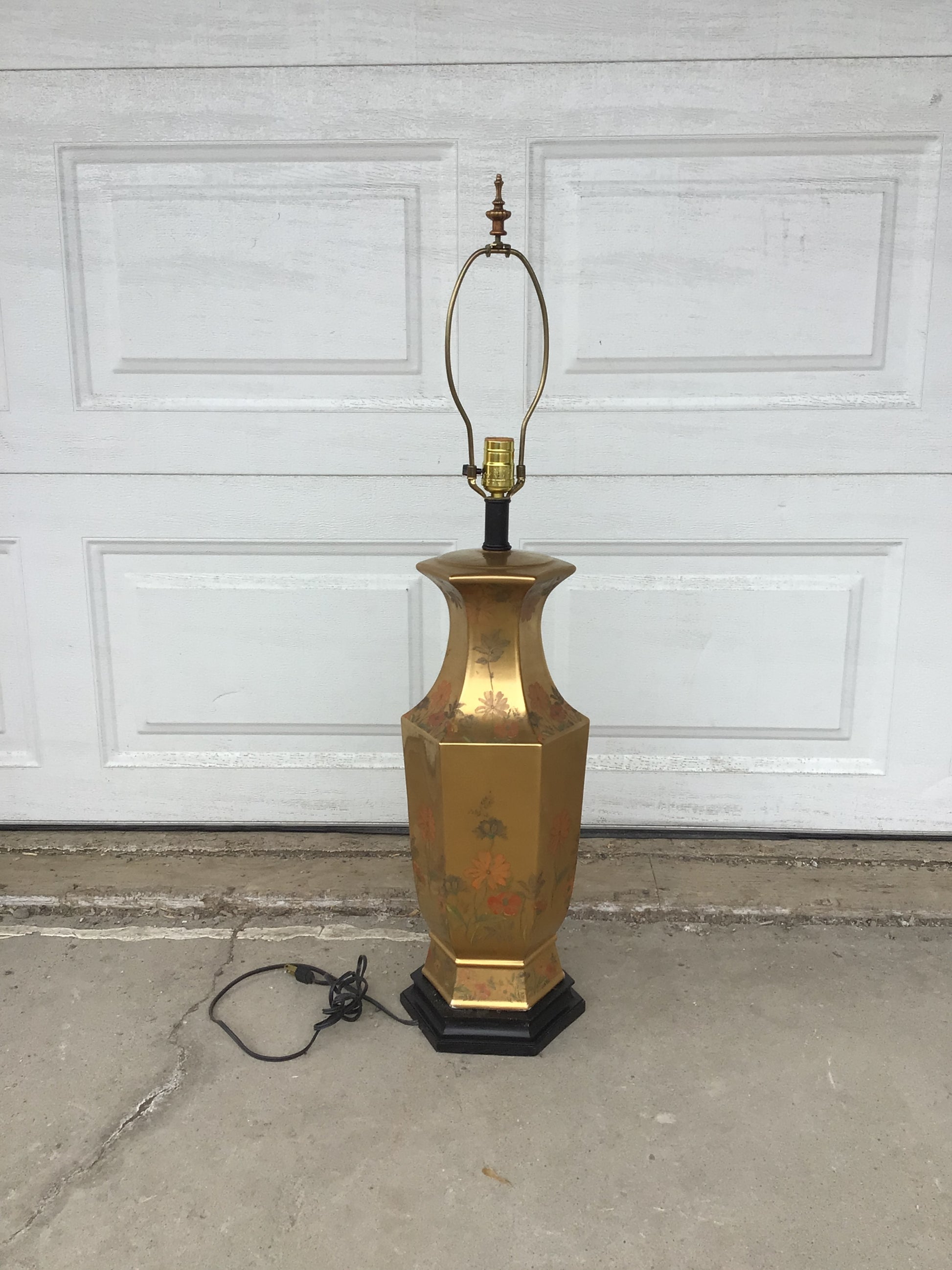 Vintage Morris Greenspan table lamp. “Hollywood Regency” style with gold-gilded porcelain base and painted floral motifs