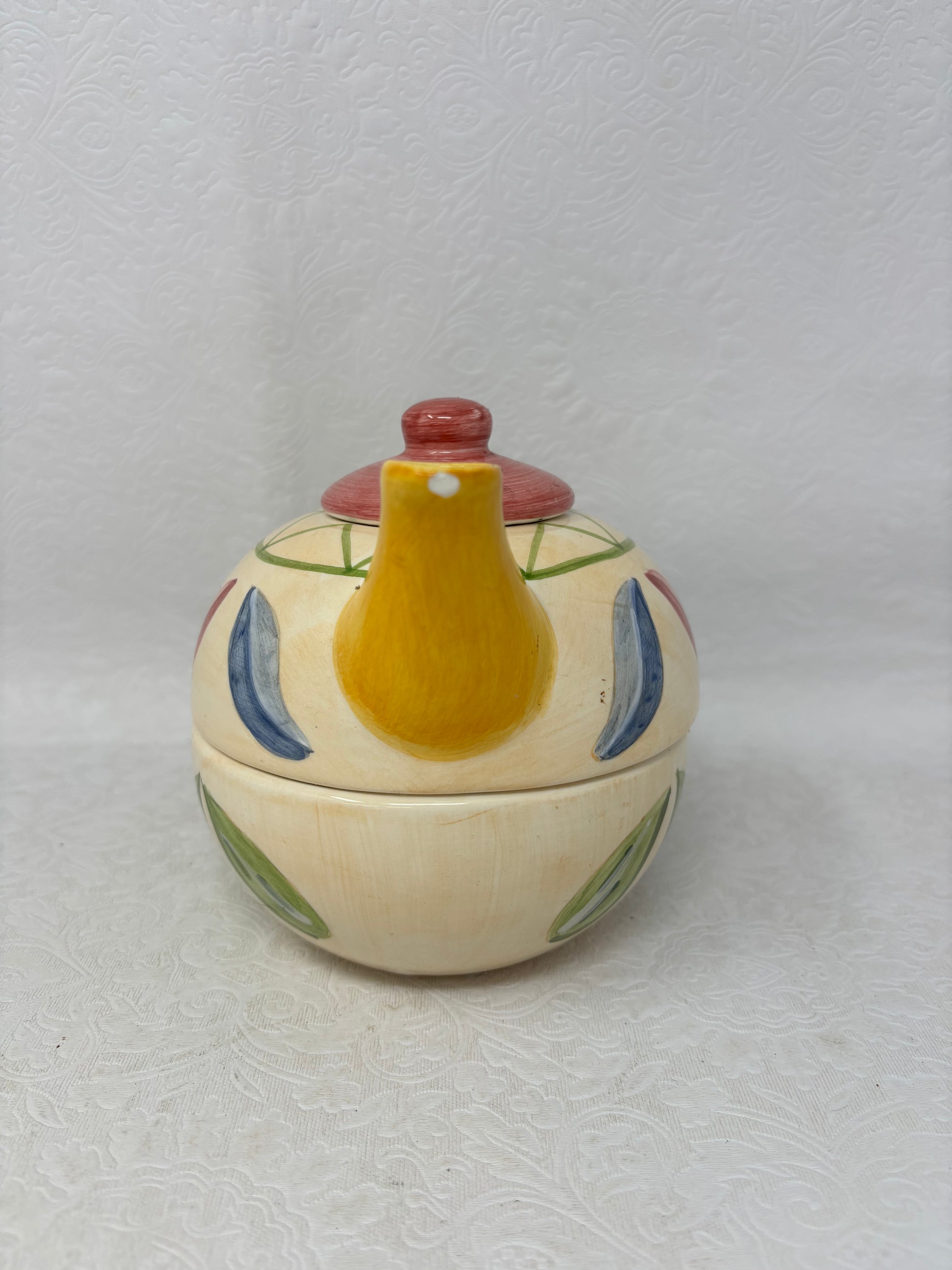 Designed in Italy, made in China. In great condition but has little chip near top of spout, shown in picture. Can be repaired and is too cute to pass up!