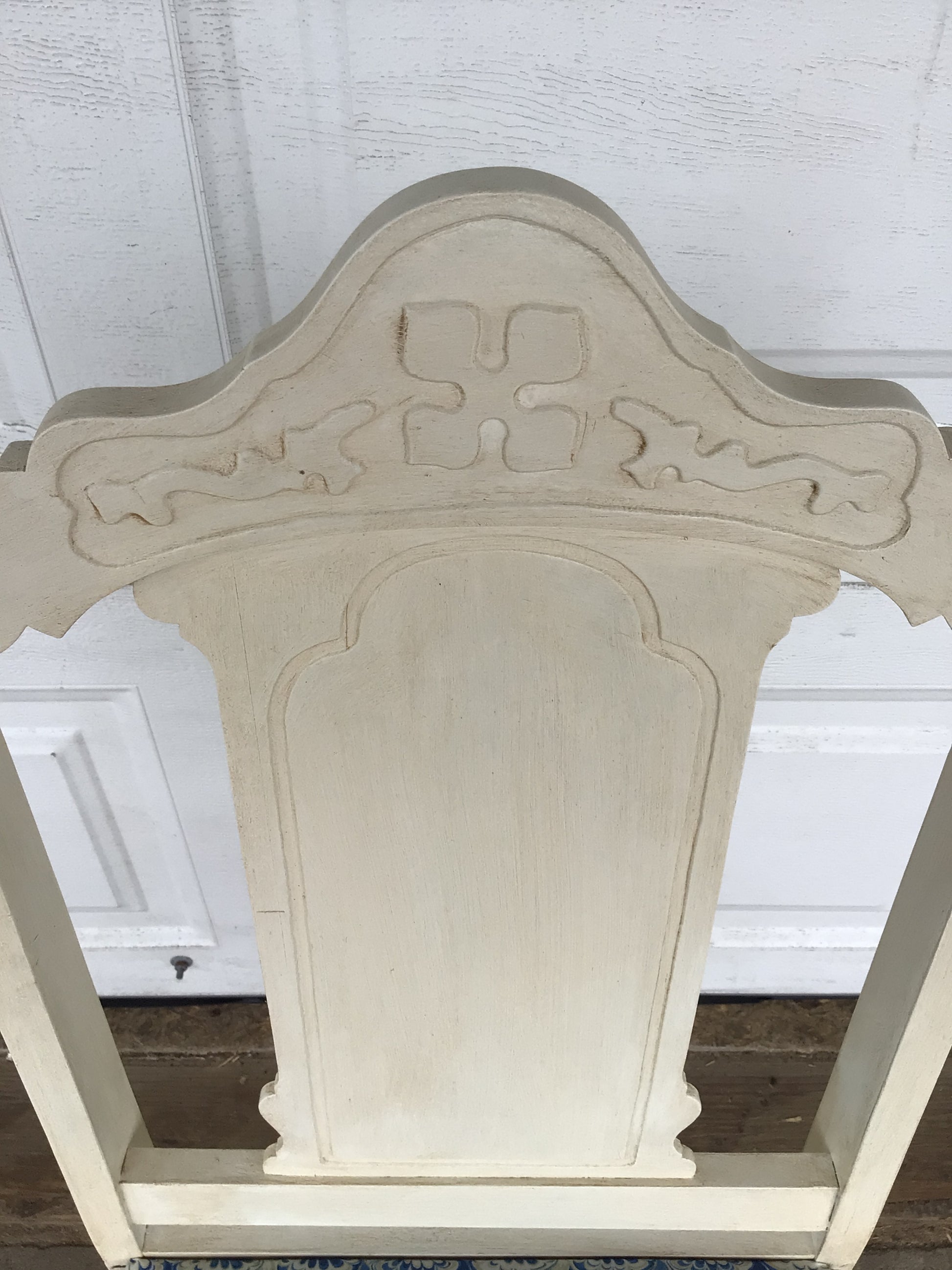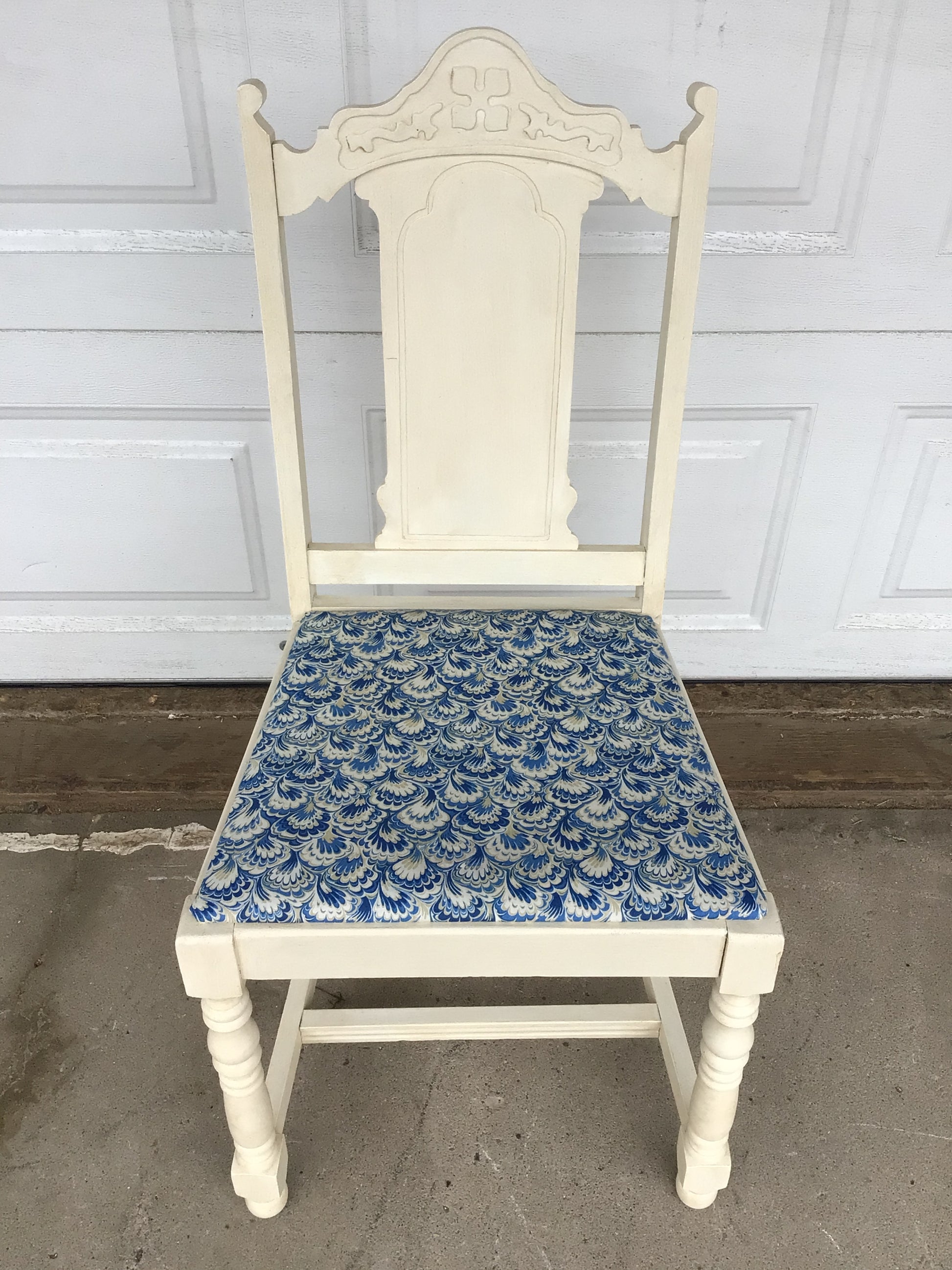 White and Blue Chair. This wooden chair has a fresh coat of white paint, and a reupholstered blue and white cushion. This chair would look great in any bedroom!