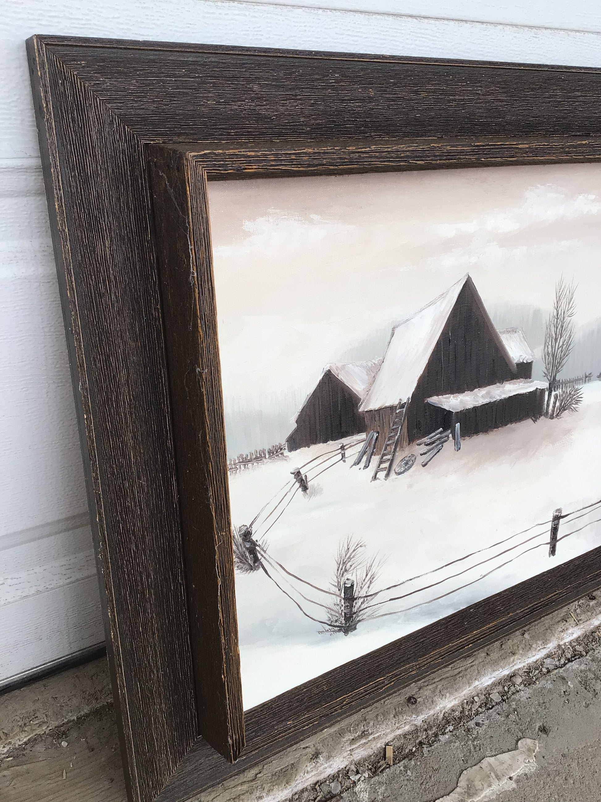 “Winterscape” Framed Print is a beautiful art piece depicting a rural scene with a snow covered bar. This artwork is framed in a gorgeous rustic dark wood frame.