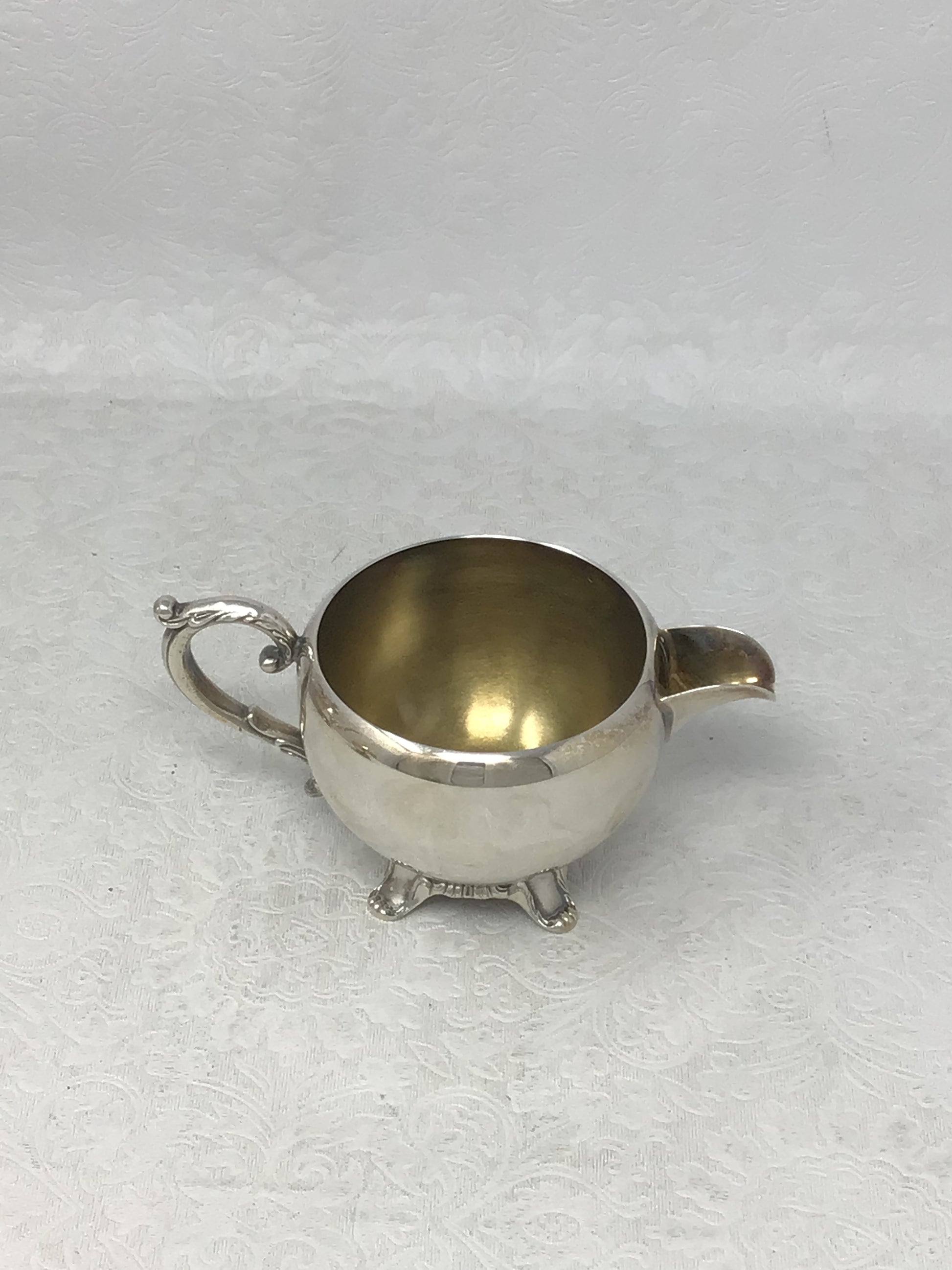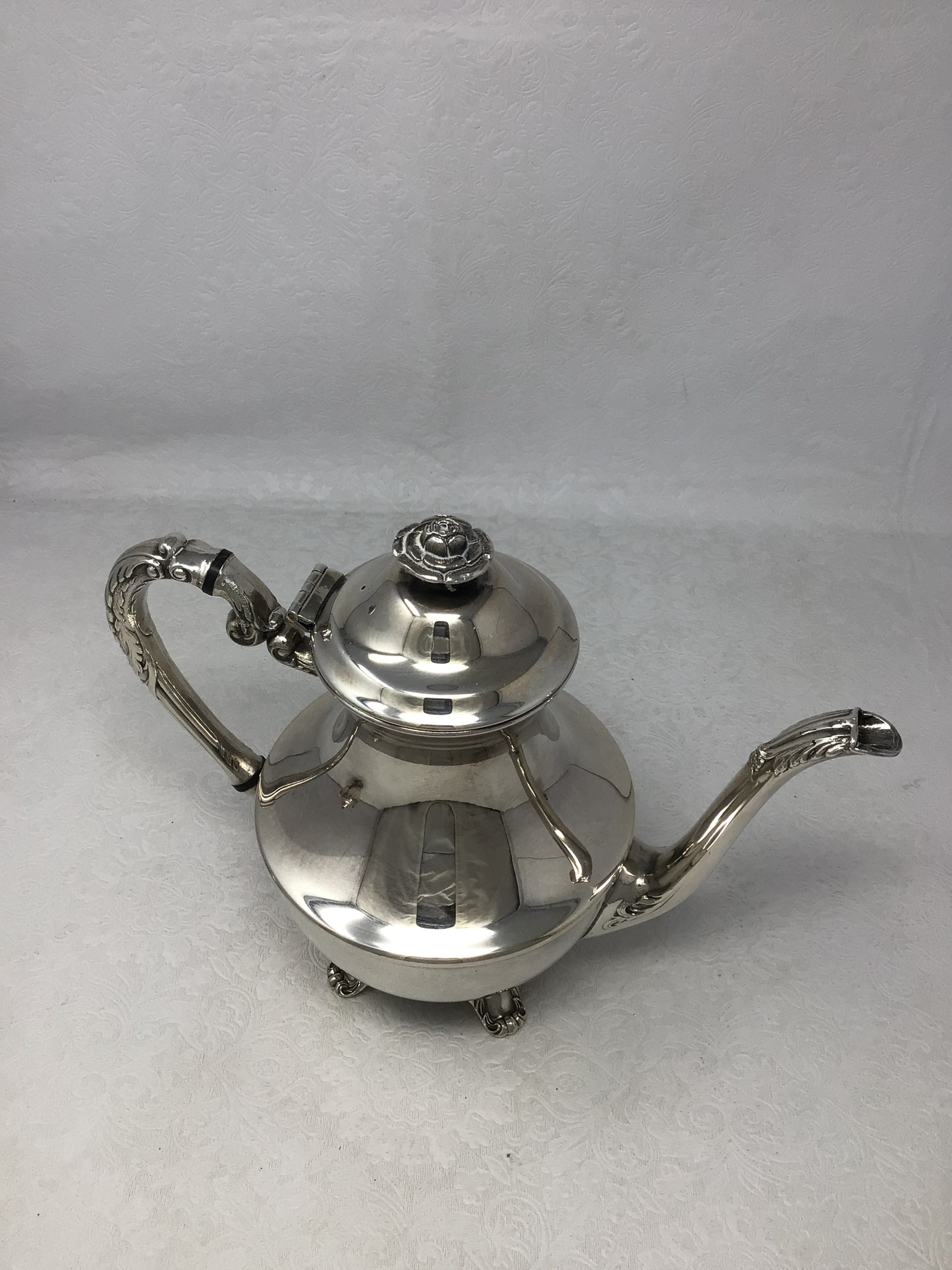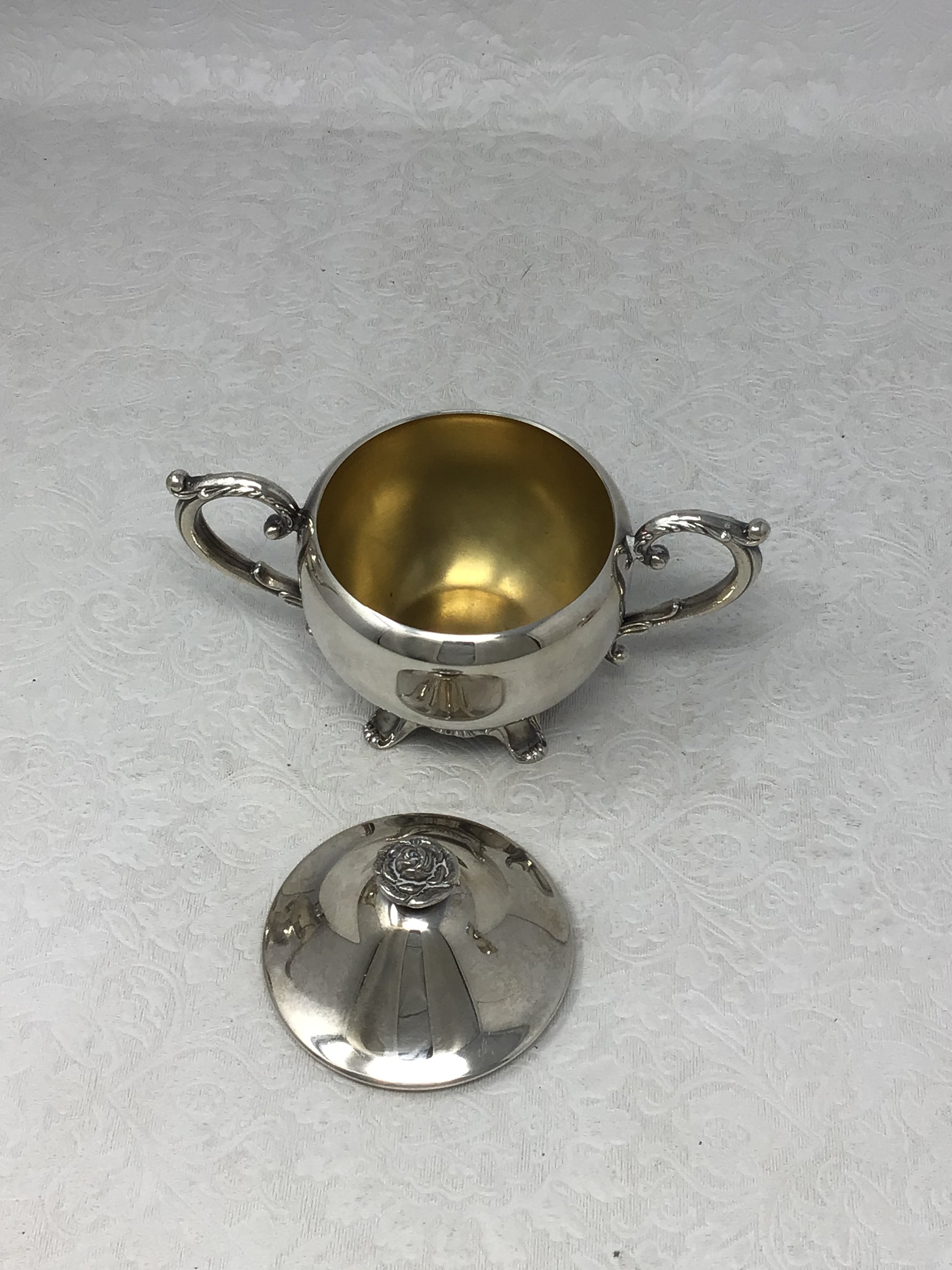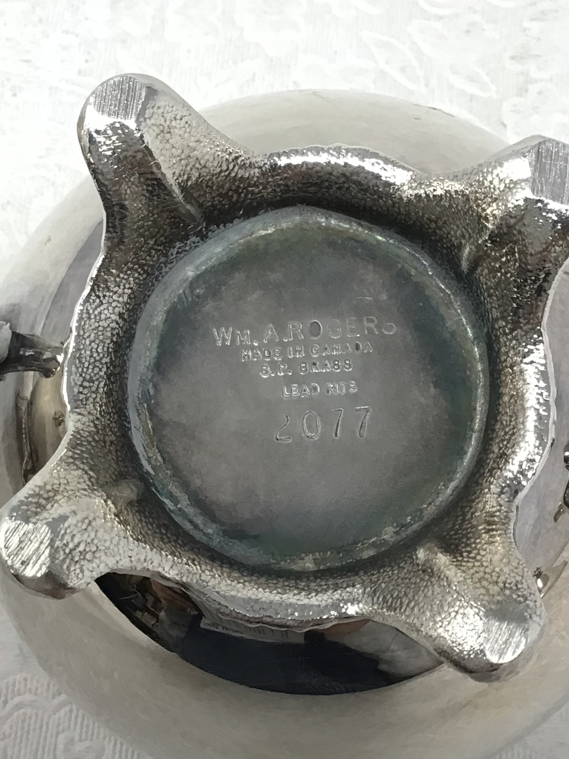 Wm.A Rogers Teapot, Creamer and Sugar. This beautiful matching silver plated set, has a rose detail. It would look great displayed in your home when not in use. In good condition.